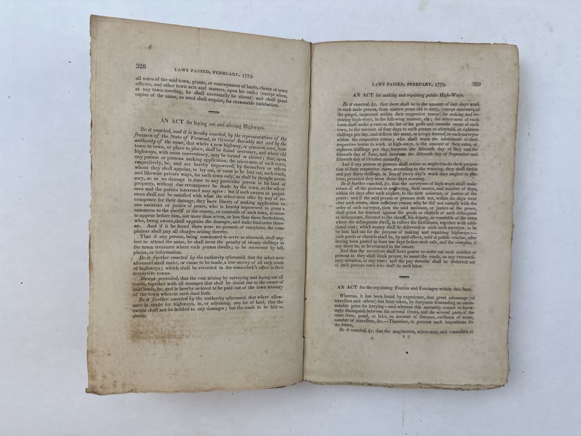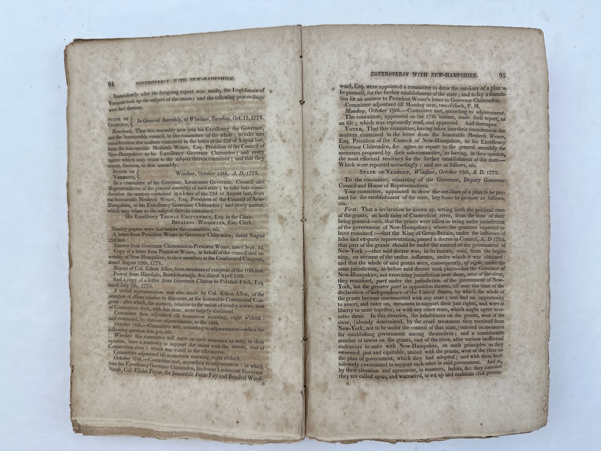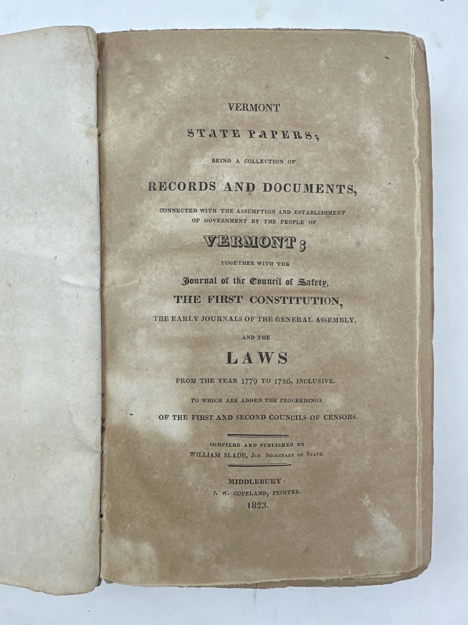 VERMONT STATE PAPERS; BEING A COLLECTION OF RECORDS AND DOCUMENTS, CONNECTED WITH THE ASSUMPTION AND ESTABLISHMENT OF GOVERNMENT BY THE PEOPLE OF VERMONT; TOGETHER WITH THE JOURNAL OF THE COUNCIL OF SAFETY, THE FIRST CONSTITUTION, THE EARLY JOURNALS OF THE GENERAL ASSEMBLY, AND THE LAWS FROM THE YEAR 1779 TO 1786, INCLUSIVE. TO WHICH ARE ADDED THE PROCEEDINGS OF THE FIRST AND SECOND COUNCILS OF CENSORS