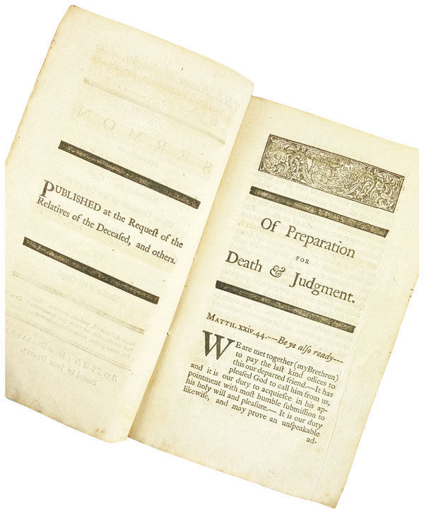 Boston: John Draper, 1758. Very Good. Boston: John Draper, [1758]. First Edition. Octavo (20.5cm.); later stiff black wrappers; 24pp. (A-C4, including half title); woodcut vignette at head of p. [5]. Slightly ex-New Haven Colony Historical Society with their pressure stamps to first three leaves including upper cover, upper cover additionally creased, else a Very Good, internally fresh and sound copy.