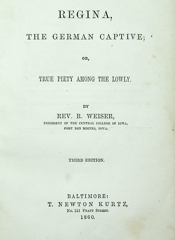 Pietistic narrative of the Hartman family's immigration to America and Regina Hartman's captivity in 1744, heavily dramatized for use in Lutheran Sunday schools. The author claims to have based his account on stories told by his grandmother, supposedly personally acquainted with the Hartmans, and on the information found in H. Melchior Mühlenberg's Hallische Nachrichten, a 1745 record of Lutheran church activities in America. Relatively uncommon: OCLC records 18 copies of the first edition and 4 copies of this third edition. VAUGHAN Narratives of North American Indian Captivity 270. Not in AYER. Reprinted as Garland #69.