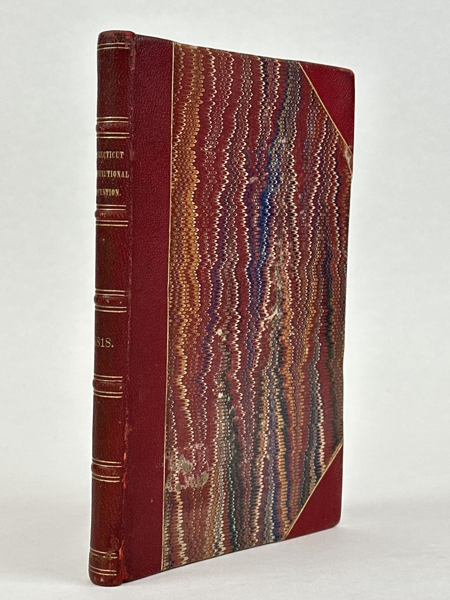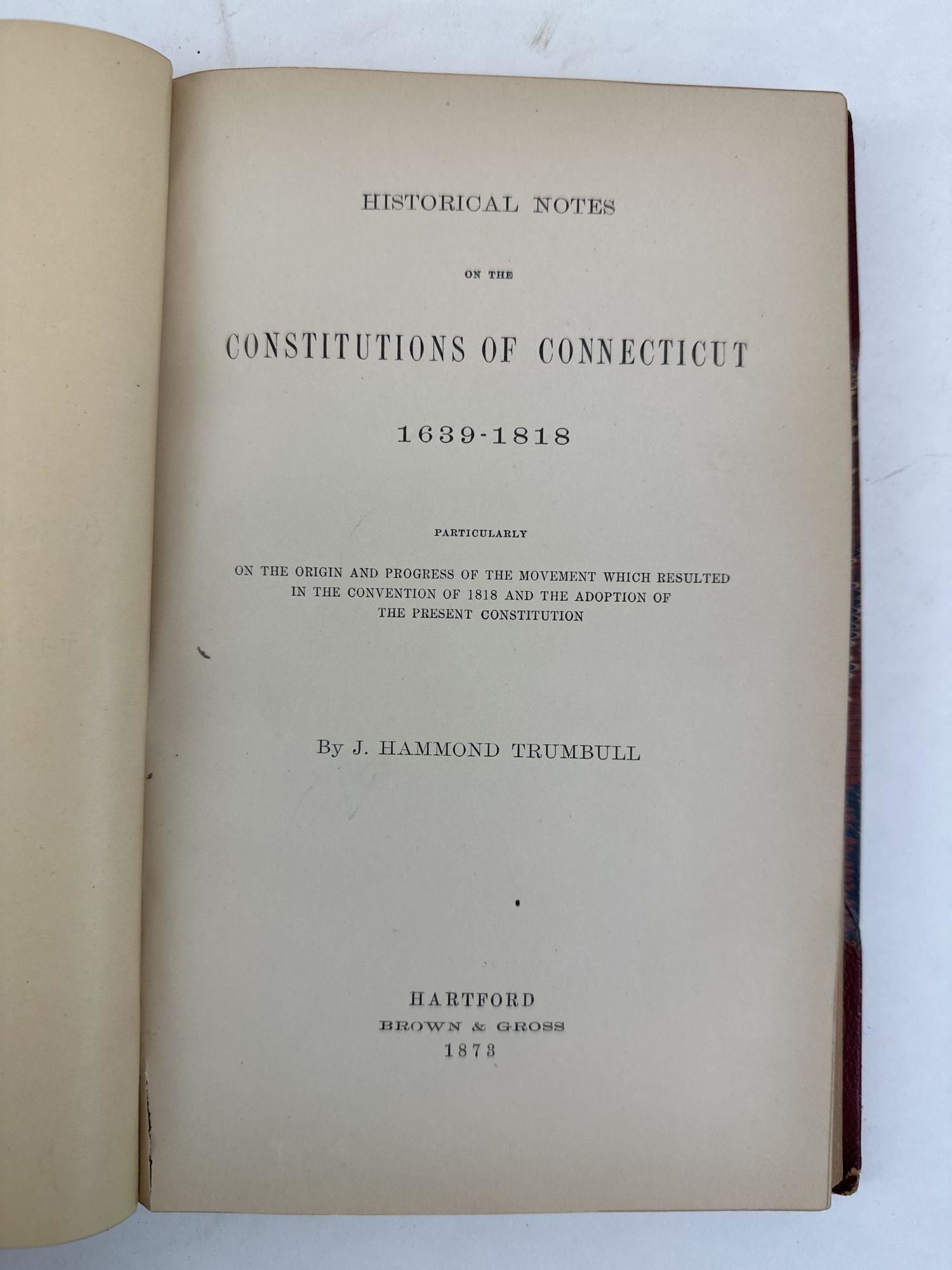 Hardford: Brown & Gross; Case, Lockwood & Brainard, 1873. Presumed First Edition. Hardcover. Small quarto, 60 pages, 121 pages; G+; Bound in 3/4 red morocco and marbled paper boards with gilt lettering on spine; Slight discoloration to spine, mild shelf wear to edges of boards and spine, slight rubbing and bumping to corners, and some soiling to front board; Mild age toning to text block, and minimal age toning to pages; Inscription on sfep reads " This volume contains J. H. Trumbulls Historical notes on the Constitutions of Connecticut, and The Journal of the Constitutional Convention in 1818."; Binders label on rear pastedown. RWO. 1364766. Special Collections.