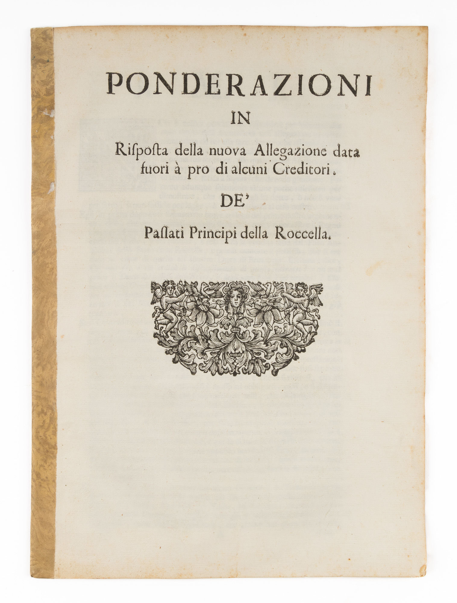 1715. [Naples?]: S.n, [1715]. Only Known Copy.. [Naples?]: S.n, [1715]. Only Known Copy. Settling the Debts of the Prince of Roccella [Creditors]. [Calabria]. Ponderazioni in Risposta della Nuova Allegazione data Fuori a Pro di Alcuna Creditori de' Passati Principi della Roccella. [Naples?]: S.n, [1715]. [26] pp. Folio (11-1/4" x 8-1/4"). Stitched pamphlet, spine reinforced with patterned paper, title page features a woodcut device with putti, flowers and birds, following leaf features a large woodcut decorated initial featuring an armored soldier. Light toning, negligible light soiling and light foxing to title page and final leaf. $750. * Only known edition. This odd ruling concerns the settlement of debts and discharge from creditors of the Calabrian Prince of Roccella who had been involved in the sale of the feudal estate of Roccella. No copies listed on OCLC or other online catalogues.