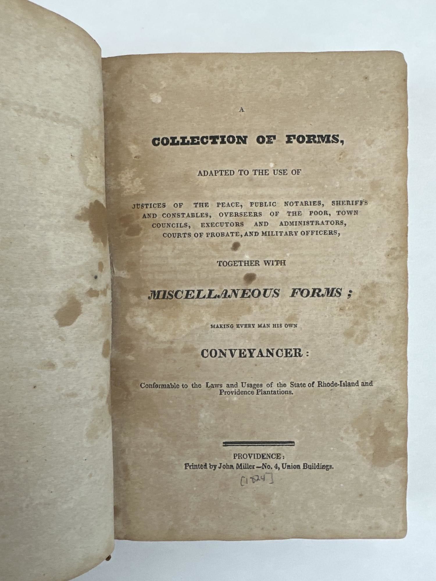 A COLLECTION OF FORMS, ADAPTED TO THE USE OF JUSTICES OF THE PEACE, PUBLIC NOTARIES, SHERIFF'S AND CONSTABLES, OVERSEERS OF THE POOR, TOWN COUNCILS, EXECUTORS AND ADMINISTRATORS, COURTS OF PROBATE, AND MILITARY OFFICERS, TOGETHER WITH MISCELLANEOUS FORMS; MAKING EVERY MAN HIS OWN CONVEYANCER: CONFORMABLE TO THE LAWS AND USAGES OF THE STATE OF RHODE-ISLAND AND PROVIDENCE PLANTATIONS