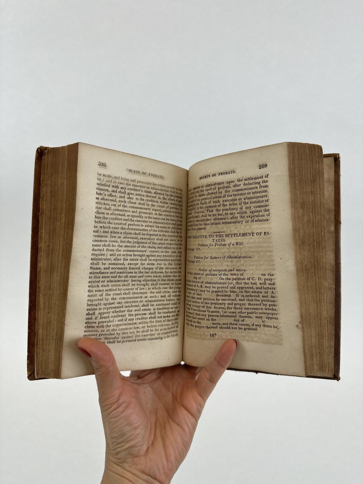 Providence: John Miller, 1824. First Edition. Hardcover. Octavo, 352 pages; G-; Bound in full brown sheep skin with red morocco spine label with gilt lettering; Mild warping to head and tail of spine, three-inch split along bottom of rear joint, moderate bumping and rubbing to corners, slight shelf wear to edges, moderate soiling to boards and spine, and leather peeling from boards; Moderate age toning to text block, moderate uneven age toning to pages throughout, slight uneven foxing o pages throughout, minimal damp staining to front pastedown and ffep, bfep tearing from hinge, and back pastedown tearing from board. Sabin 70564. RWO. 1364796. Special Collections.