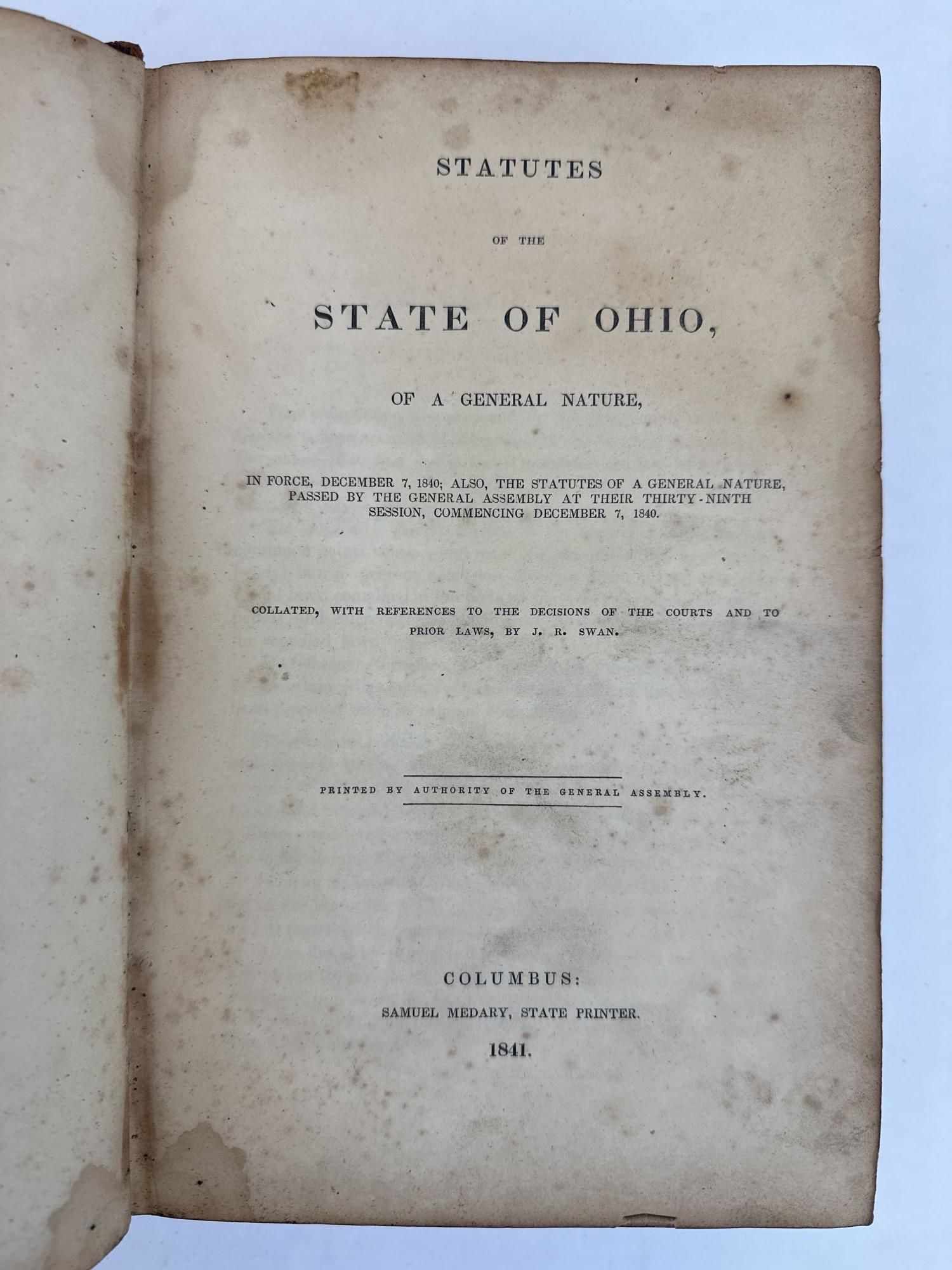 STATUTES OF THE STATE OF OHIO, OF A GENERAL NATURE, IN FORCE, DECEMBER 7, 1840; ALSO, THE STATUTES OF A GENERAL NATURE, PASSED BY THE GENERAL ASSEMBLY AT THEIR THIRTY-NINTH SESSION, COMMENCING DECEMBER 7, 1840