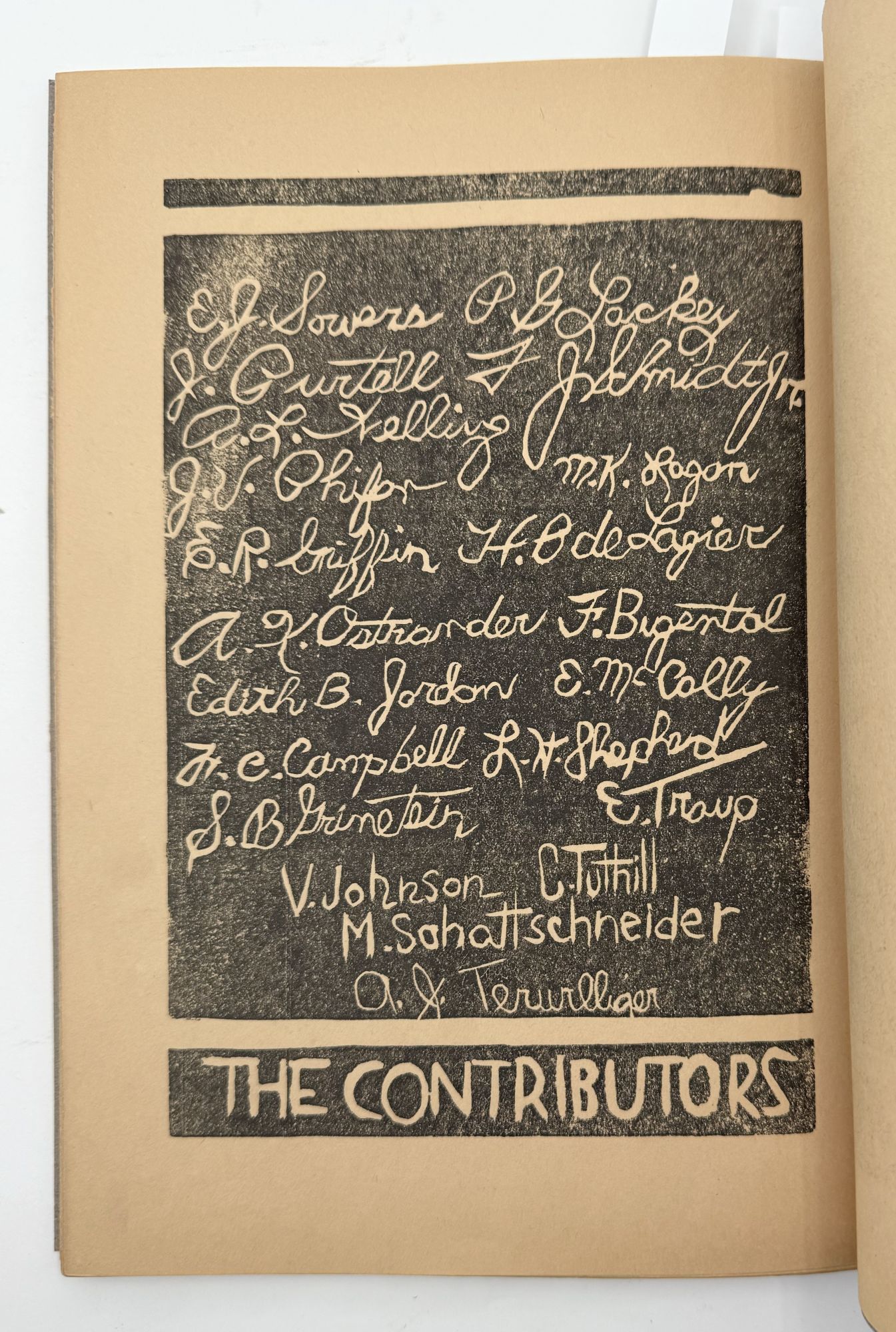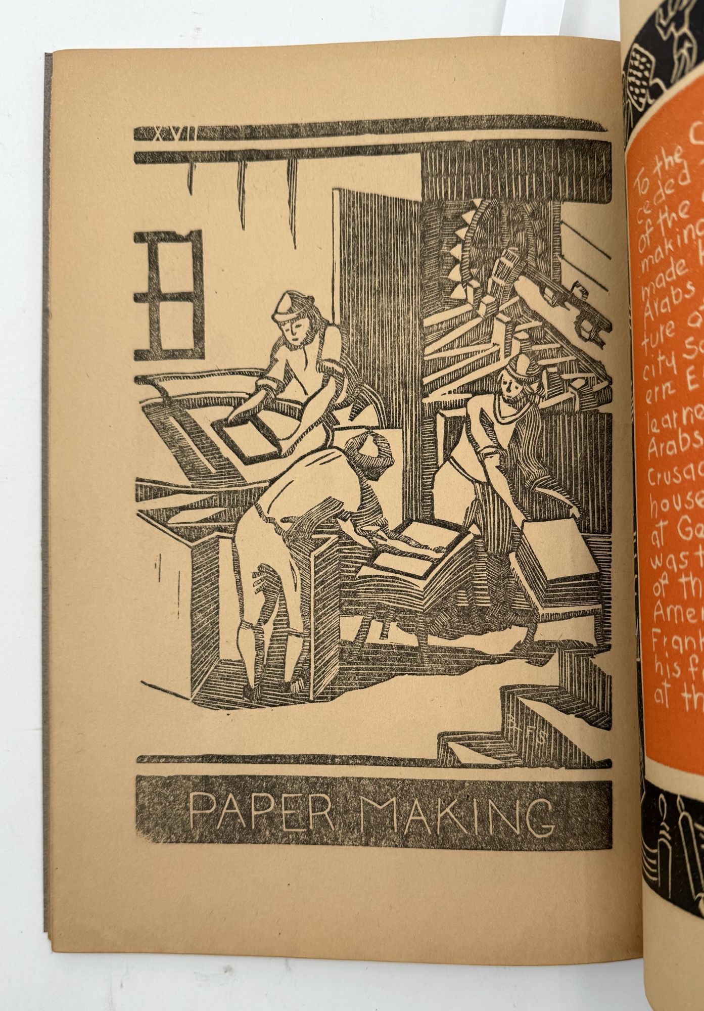 New York: Teachers College, Columbia University, 1933. Unpaginated, illustrated throughout. 4to. Orange wrappers heavily chipped, mostly perished but the cover design is preserved and pasted down on gray wraps, stitch-bound with black cord. illustrated throughout by block printing; a very good scarce publication. Unpaginated, illustrated throughout. 4to. OCLC: Amon Carter Museum Research Library, Columbia University