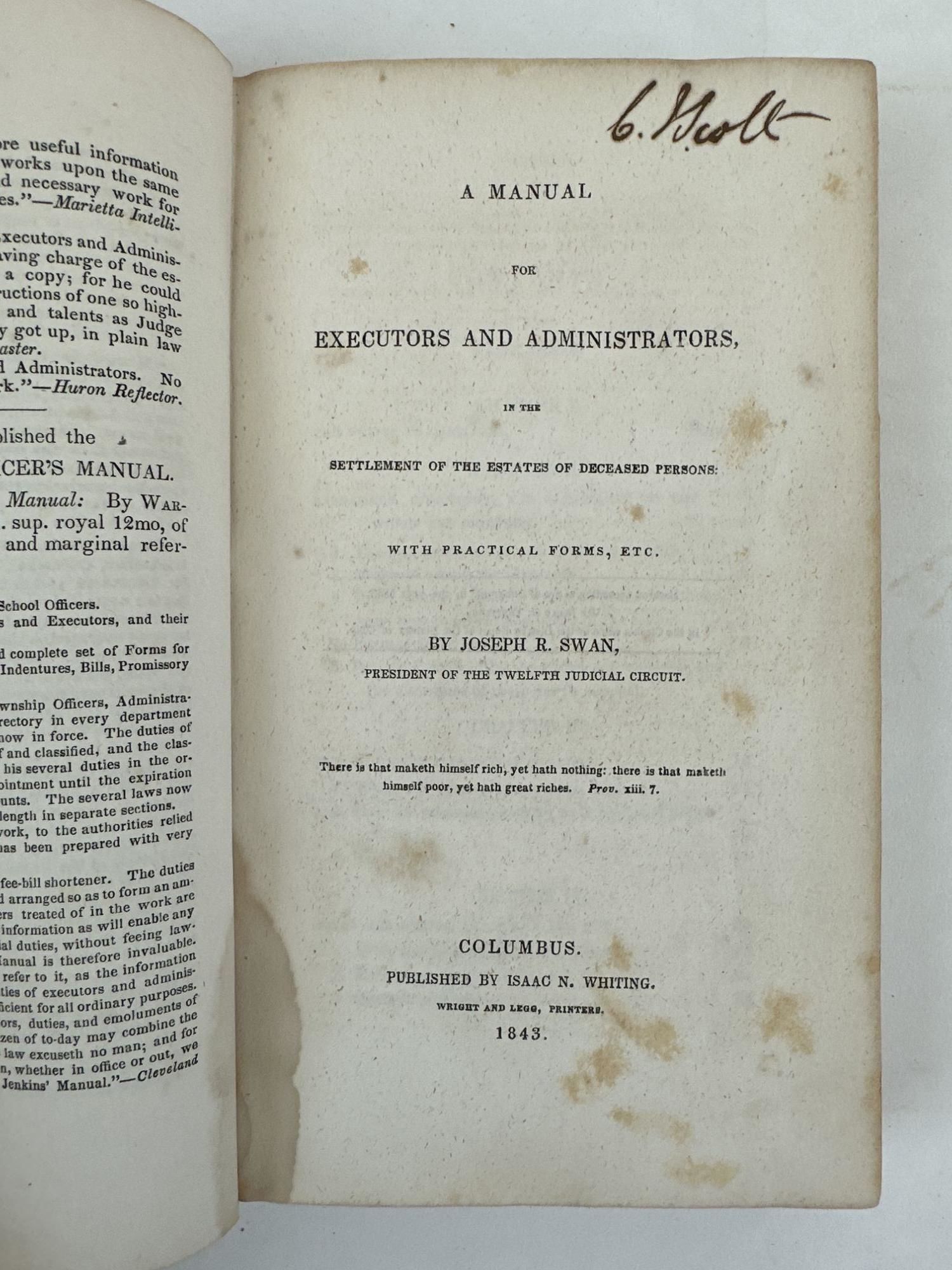 Columbus: Isaac N. Whiting, 1843. First Edition. Hardcover. Octavo, 4, xvii, [2], 332 pages; G-; Bound in full brown sheep skin with off white leather spine label with gilt lettering; Boards show moderate wear and bumping to corners and head/tail of spine, moderate peeling to back board, several instances of light soiling, light + staining boards and spine; Moderate age toning to text block, light to severe uneven foxing throughout pages (most severe on first and last few pages), and previous owners inscription in ink on title page; Four pages of publishes ads in front. RWO. 1364944. Special Collections.