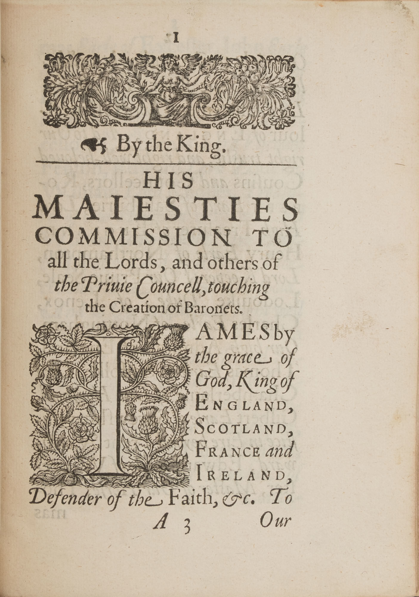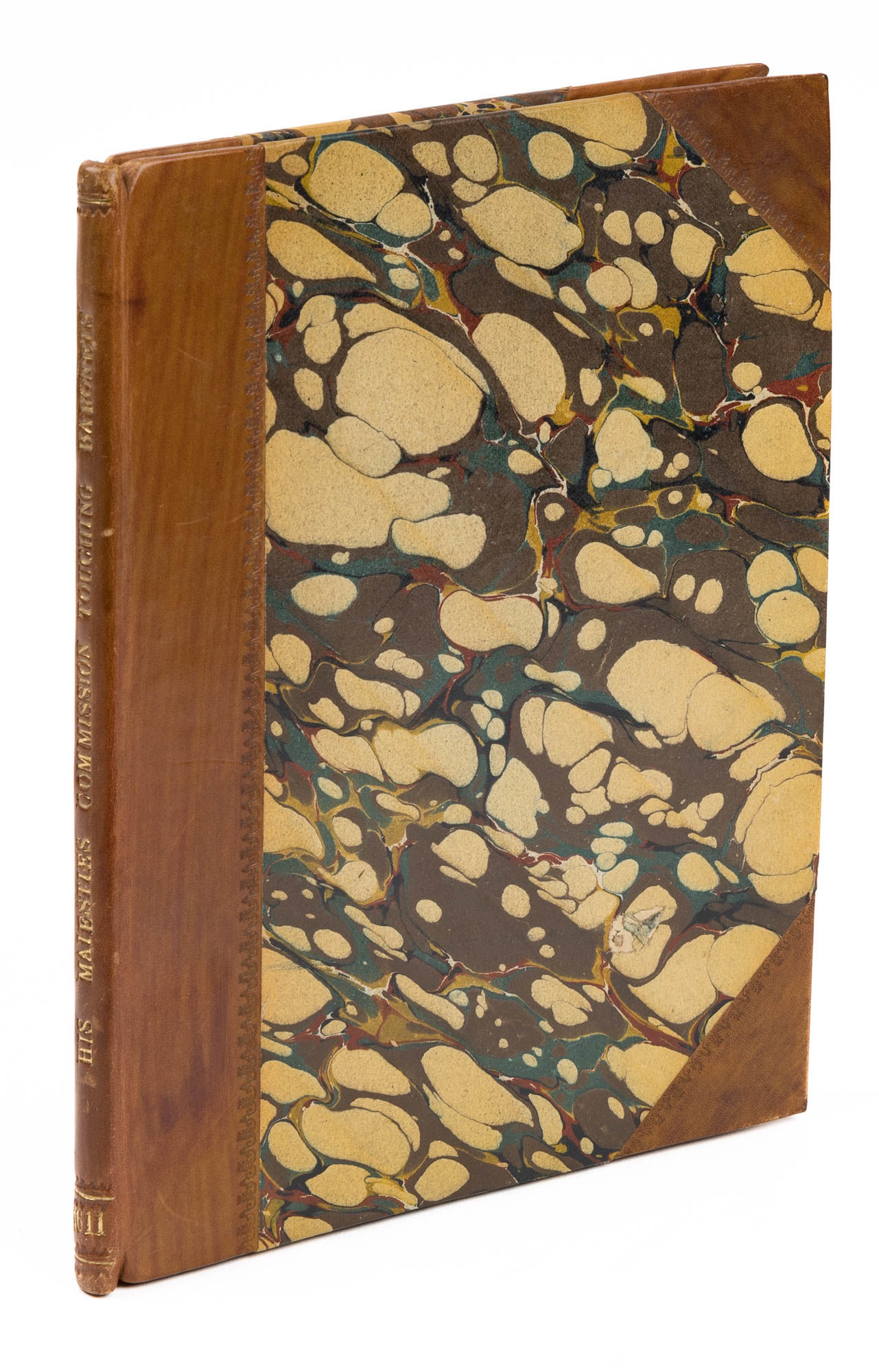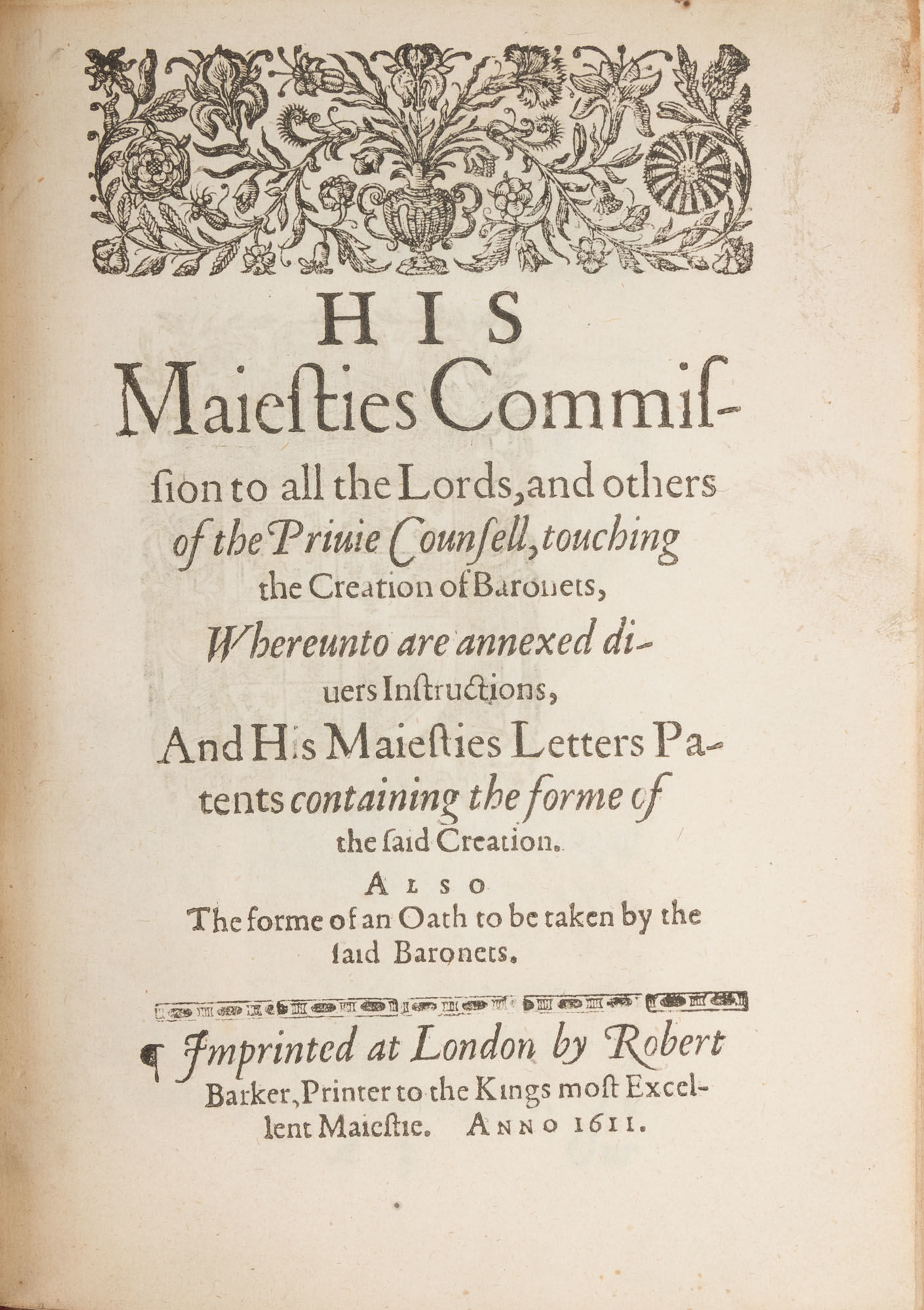 1611. The Creation of Baronets Under James I [Nobility]. [Great Britain]. [James I (1566-1625), King of England and Ireland]. His Majesties Commission to All the Lords, And Others of the Privie Counsell, Touching the Creation of Baronets, Whereunto are Annexed Divers Instructions, And His Majesties Letters Patents Containing the Forme of the Said Creation. Also the Forme of an Oath to be Taken by the Said Baronets. London: Imprinted by Robert Barker, 1611. [iv], 18, p. 18, 18-38, [2], 39-44 pp. First leaf blank (signed "A"). Lacking final leaf, a blank. Quarto (7-1/4" x 5-1/2"). Stab-stitched pamphlet bound into recent three-quarter calf over marbled boards, gilt and blind fillets and gilt title and publication date to spine. Moderate toning to interior, light soiling to first leaf, a small repair to its verso, minor smudges to title page and following leaf. A handsome copy. $850. * Only editions. Enactments dealing with the creation of the baronetage by James I. The title of baronet, "a new dignitie between Barons and Knights," was established by letters patent as a way for James to raise revenue quickly without Parliament. Initially, prospective baronets were required to pay enough money to "maintaine the number of thirtie foote-Souldiers in Ireland" for three years at a rate of eight pence per day, men badly needed to maintain English control in Ulster. The second title largely reprints the letters patent of the first title and includes some additional clarification about matters of precedence. There are 1,274 baronets on the Official Roll of the Baronetage today. English Short-Title Catalogue S122652, S100729.