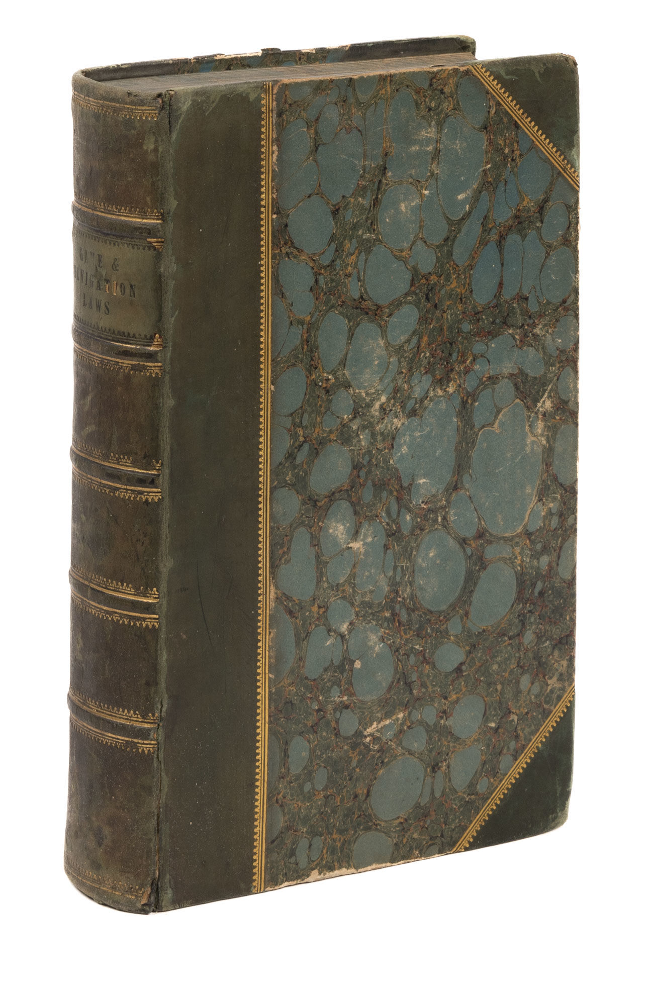 1846. The Abolition of Game and Navigation Laws Welford, Richard Griffiths. Bright, John. The Influences of the Game Laws; Being Classified Extracts from the Evidence Taken Before a Select Committee of the House of Commons on the Game Laws, And Some Introductory Remarks. With an Appendix, And an Address to the Tenant Farmers of Great Britain. London: R. Groombridge and Sons, 1846. 429, [3], lxxi, [1] pp. [Bound with] Ricardo, John Lewis. The Anatomy of the Navigation Laws. London: Charles Gilpin, 1847. [vi], 336 pp. Octavo (8-1/2" x 5-1/4"). Contemporary three-quarter calf over marbled boards, blind fillets to calf edges, raised bands, gilt fillets and tiny fragments of lettering piece to spine, marbled edges and endpapers. Light rubbing to boards, moderate rubbing to extremities, front joint starting at ends, rear joint just starting at head, corners bumped and worn, hinges cracked (front hinge after title page), bookplate (with owner name abraded) to front pastedown. Moderate toning and occasional light foxing to first work, light toning and light foxing in a few places to second work. $200. * Only editions. The first work advocates for the abolition of game laws and reform of the system of game preserving, which, in the authors' view, "is proved to be the origin of the greatest part of the crime committed in rural districts, to cause an extensive destruction of agricultural produce, and to seriously affect the independence and comfort of the tenantry of the kingdom" (Introduction). The second work gives an overview of the "impolicy and mischievous tendency" of the Navigation Acts with an eye to their repeal, which would take place in 1849. Ricardo: Sweet & Maxwell, A Legal Bibliography of the British Commonwealth 2:299.