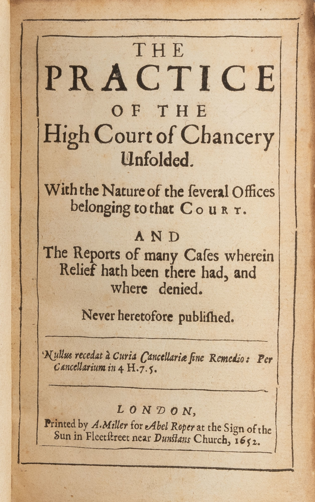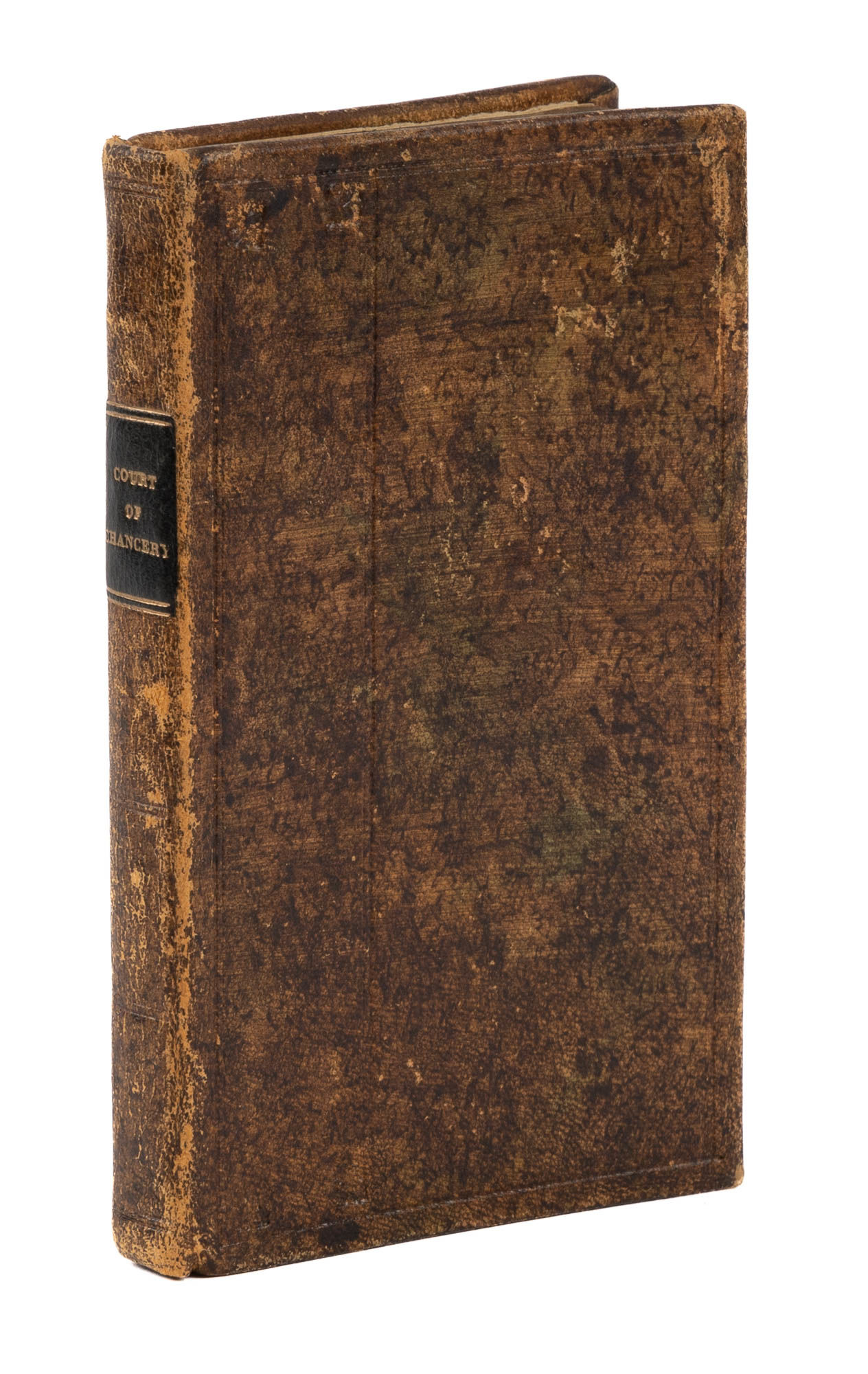 1672. 2d part: Choyce Cases in Chancery. 2d part: Choyce Cases in Chancery. "An Exhibition of Elizabethan Habits, Manners, And Peculiarities" [Court of Chancery]. [Great Britain]. The Practice of the High Court of Chancery Unfolded. With the Nature of the Several Offices Belonging to that Court. And the Reports of Many Cases Wherein Relief Hath Been There Had, And Where Denied. Never Heretofore Published. London: Printed by A. Miller for Abel Roper, 1652 [i.e. 1651]. [xii], 100, 113-188 pp. Second part has headline title: Choyce Cases in Chancery. Octavo (5-1/2" x 3-1/2"). Recent period-style speckled sheep, blind rules and corner fleurons to boards, blind fillets and lettering piece to spine, endpapers renewed. Light rubbing to boards, which are bowed, moderate rubbing to extremities, somewhat heavier to joints, corners lightly bumped, lower left corner of front pastedown torn. Light toning to interior, light foxing in a few places. $950. * First edition. "Like Lambard, Tothill, and a few similar works, this volume is one which those great cases that occur from time to time, and stimulate inquiry into the very foundations of legal science, will occasionally call forth, and it ought, therefore, to be in every public law library. (...) There is a picturesqueness and dramatic interest about them, especially as seen by the half lights in which sitting so far off, we...necessarily view them, that makes them quite entertaining, and, indeed an exhibition of Elizabethan habits, manners, and peculiarities." (Wallace). The period covered by Choyce Cases is 1557-1606. A second edition appeared in 1672. OCLC locates 5 copies of the first edition in North American law libraries (Columbia, Harvard, Library of Congress, University of Minnesota, Yale). Wallace, The Reporters 470-471. English Short-Title Catalogue R222499.