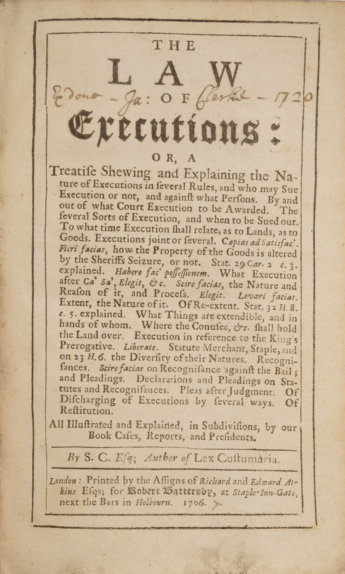1706. Scarce Eighteenth-Century Treatise on Executions C[arter], S[amuel]. The Law of Executions: Or, A Treatise Shewing and Explaining the Nature of Executions in Several Rules, And Who May Sue Execution or Not, And Against What Persons. [...] All Illustrated and Explained, In Subdivisions, By Our Book Cases, Reports, And Presidents. By S. C. Esq; Author of Lex Custumaria. London: Printed by the Assigns of Richard and Edward Atkins, 1706. [xvi], 323, [21] pp. Includes two-page publisher catalogue. Octavo (7" x 4-1/4"). Contemporary calf, blind frames, fillets and corner fleurons to boards, raised bands, blind fillets and fragment of early paper title label to spine, blind tooling to board edges. early hand-lettered title to fore-edge of text block. Light rubbing and a few nicks and scuffs to boards, which are slightly bowed, moderate rubbing to extremities, tiny chip to head of rear joint, corners bumped and somewhat worn, pastedowns loose, a few cracks to text block. Moderate toning to interior, smudges to lower margins of preliminaries, owner inscription (of Richard Goodnough) dated 1745 to front endleaf, owner inscription ("Ex dono- Ja: Clarke- 1720") to head of title page. $650. * Only edition. Carter was the author of two notable treatises: The Infants Lawyer (1697), the first English treatise on laws concerning infants, and Lex Custumaria, Or, A Treatise of Copy-Hold Estates (1696). As indicated by the title, The Law of Executions addresses the various ways (non-criminal) judicial decisions are carried out. OCLC locates 9 copies in North American law libraries (Columbia, Harvard, LA-County, Library of Congress, Ohio Supreme Court, University of Georgia, Social Law, Wisconsin State Law Library, Yale). English Short-Title Catalogue T32964.