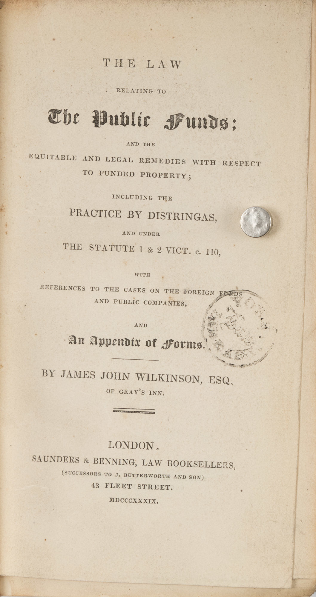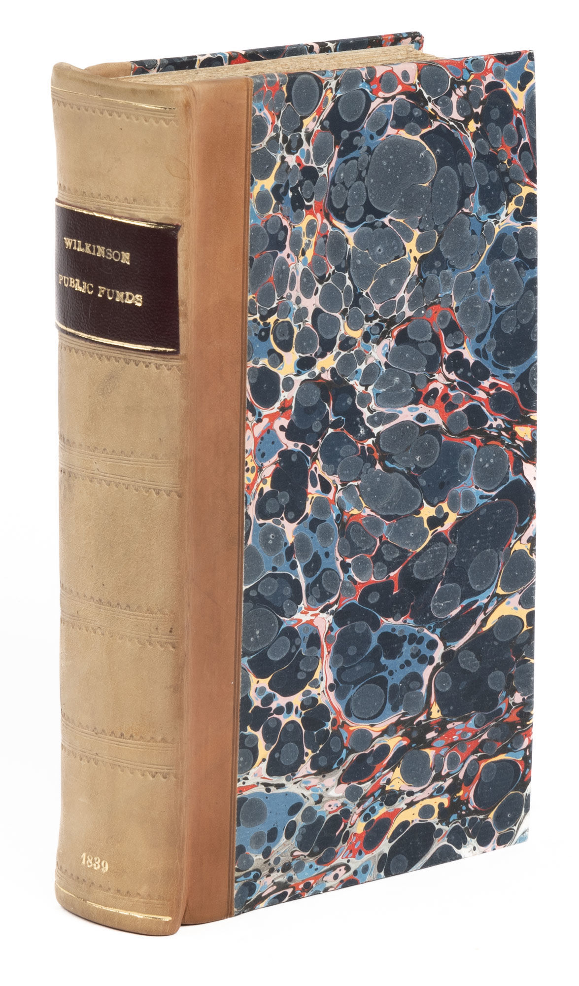 1839. The First Legal Treatise on Government Securities Wilkinson, James John [d.1858]. The Law Relating to the Public Funds; And the Equitable and Legal Remedies with Respect to Funded Property; Including the Practice by Distringas, And Under the Statute 1 & 2 Vict. c. 110, With References to the Cases on the Foreign Funds and Public Companies, And an Appendix of Forms. London: Saunders & Benning, 1839. xix, [1], 411, [1] pp. Octavo (7-1/2" x 4"). Recent quarter calf over marbled boards, blind rules to calf edges, blind fillets, lettering piece and gilt date to spine, endpapers renewed, edges untrimmed. Light fading to spine. Light toning to interior, occasional light soiling, light foxing in a few places, circular ink library stamp to title page and a few other pages, no loss to legibility. $850. * Only edition. The first legal treatise on government securities, this work includes an extensive overview of case law as well as a historical discussion of stockjobbing and speculation. Though it anticipated them in many ways, it also provides a snapshot of the system before the advent of modern hedge funds. Wilkinson, a barrister, special pleader and judge, was the author of several well-regarded works on commercial law and shipping. OCLC locates 4 copies in North American law libraries (Library of Congress, University of Georgia, University of Missouri, University of Cincinnati). Goldsmiths'-Kress Library of Economic Literature 31031.41. Sweet & Maxwell, A Legal Bibliography of the British Commonwealth 2:380.