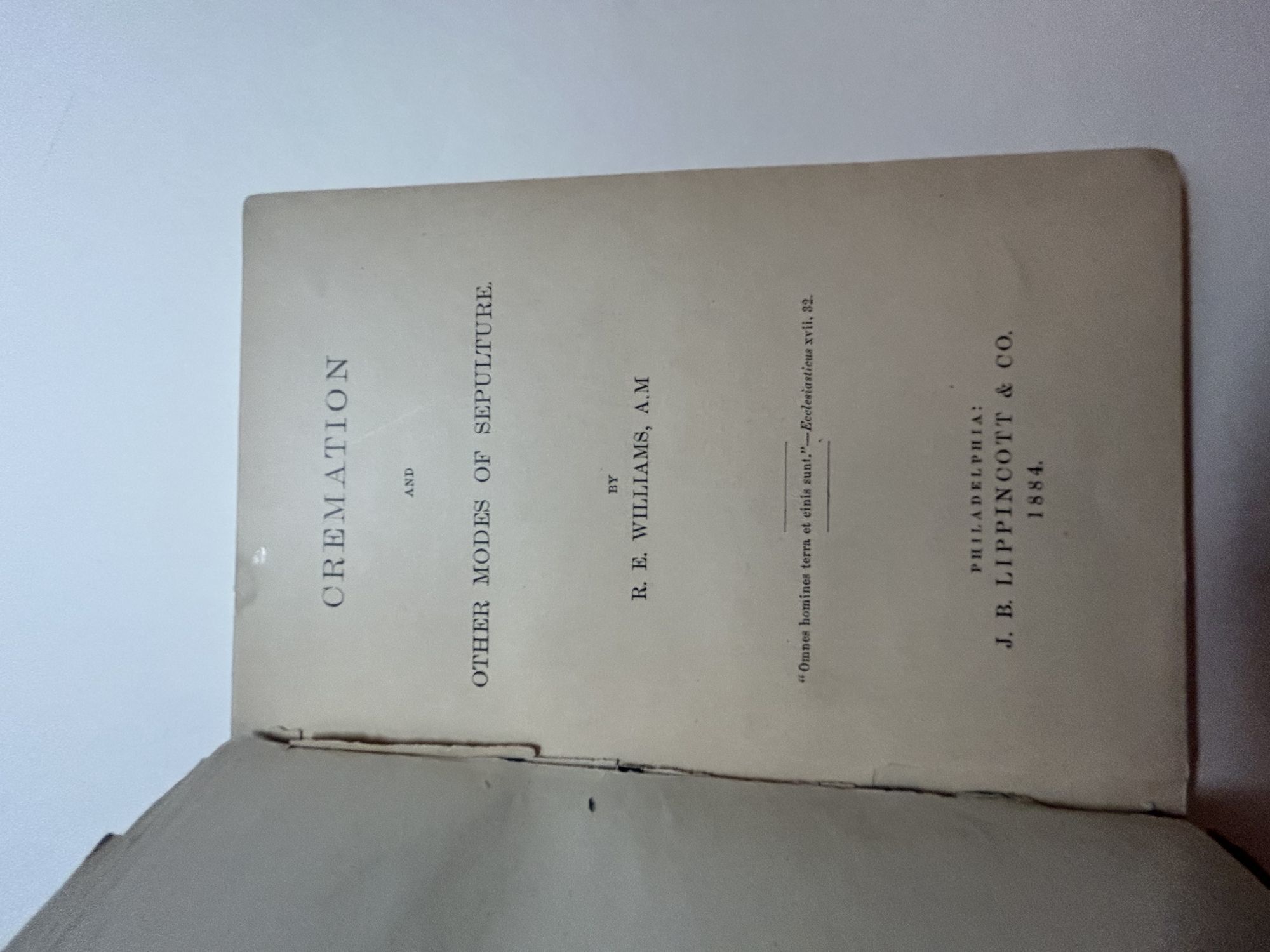 Philadelphia, PA: J.B. Lippincott & Company, 1884. First Edition. Cloth. Very Good. First Edition. Cloth. Discussion of interment and the substitution of a better method of burial wiith facts and arguments to support this theme. Williams points out historical data of other cultures forms of burial as well as religious views. Scarce treatise in any condition. Bound in maroon cloth with gilt titling and blind decorative stamping. Visible edgewear and tears to interior pages, loose front endpaper, otherwise intact and legible. Ex-library stamping to cover, former owner ex libris, and circulation card adhered to rear endpaper. Includes annotation in pencil: "Timothy Nicholson, Esq. Compliments of [sic] ... Henssy...Do not be afraid of this little book as it is full of truth and wisdom." 82 pages, small 8vo.