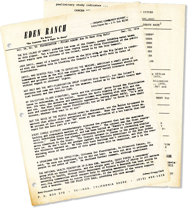 Topanga, CA: Eden Ranch / The National Health Federation, 1974. Original mimeographed newsletter. 1pp on single letter-sized sheet. Together with a supplementary fact sheet, dated 1/6/1975, headlined "preliminary study indictes...Cancer Death Rate Highest in Fluoridated Cities." First sheet with holes punched in left margin for binding; minor edgewear and aging; Very Good.
