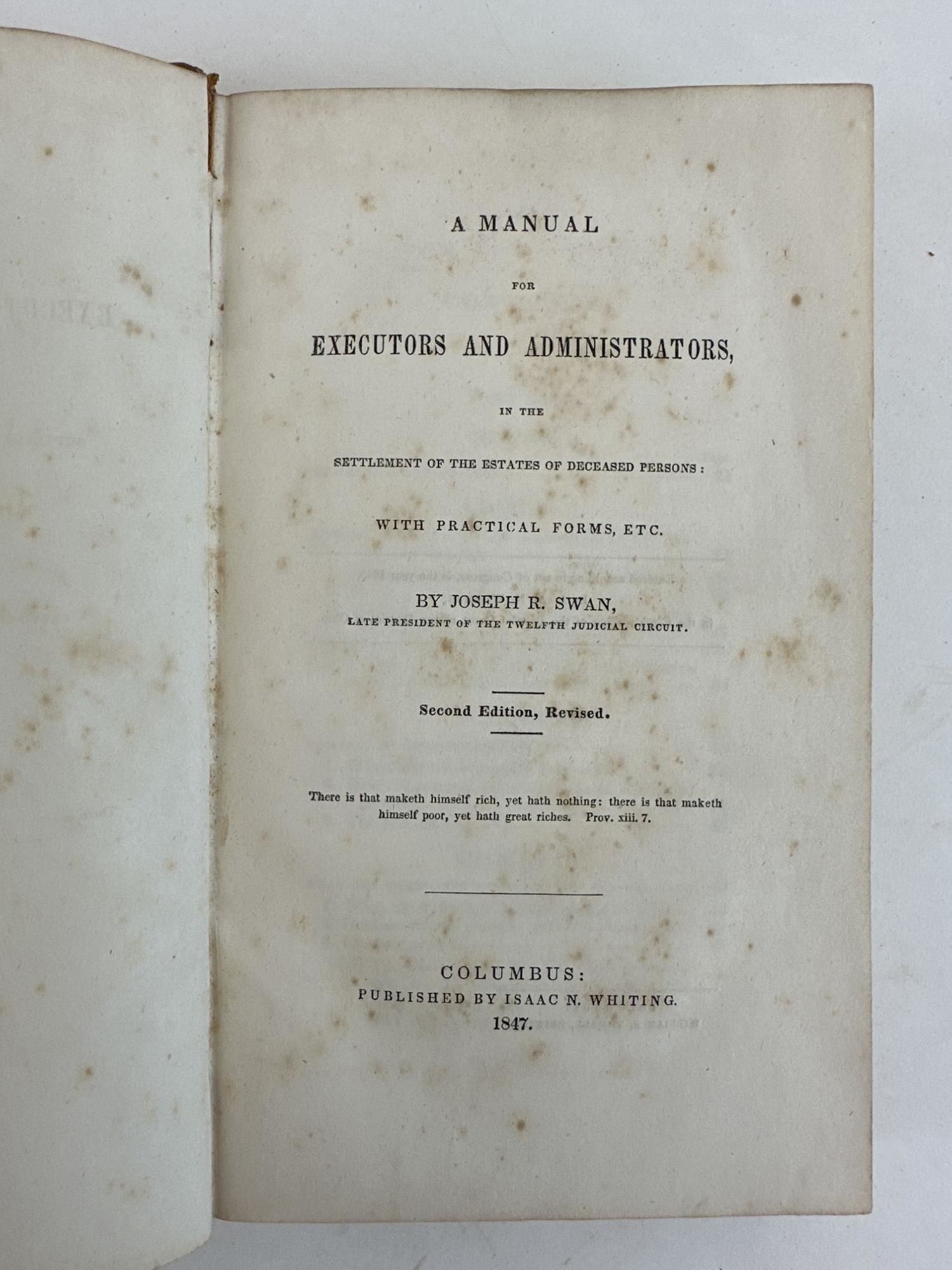 Columbus: Isaac N. Whiting, 1847. Second Edition. Hardcover. Octavo, xiv, 371 pages; G; Fully bound in leather with red labels and gilt lettering to spine; Boards have blindtooling along edges and very light shelfwear overall with rubbing to edges and corners; Textblock shows light age toning to edges, uneven light to moderate foxing throughout interior (including paste downs). RWO. 1365048. Special Collections.