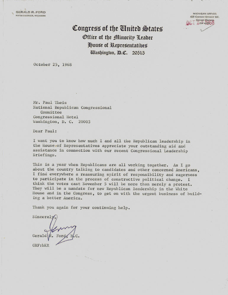 Washington, 25 October 1968. Letter. Light creases from mailing. Fine. TYPED LETTER SIGNED "Jerry" on Office of the Minority Leader stationery to Paul Theis, Director of Public Relations for the Republican National Congressional Committee, expressing his appreciation for his work "in connection with our recent Congressional Leadership Briefings. This is a year when Republicans are all working together. As I go about the country talking to candidates and other concerned Americans, I find everywhere a reassuring spirit of responsibility and eagerness to participate in the process of constructive political change. I think the votes cast November 5 will be more than merely a protest. They will be a mandate for new Republican leadership in the White House and in the Congress, to get on with the urgent business of building a better America." Richard Nixon was elected president that election to his first term. After his vice-president, Spiro Agnew, resigned in disgrace in 1973, Ford was appointed vice-president.
