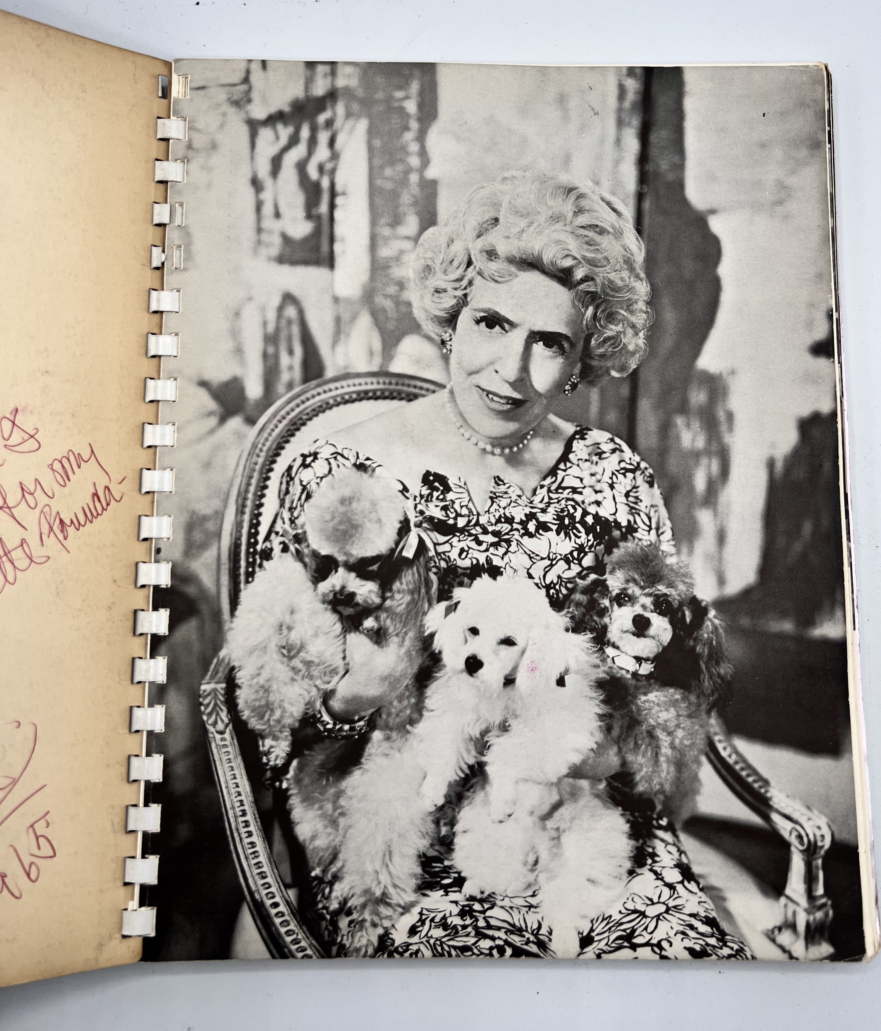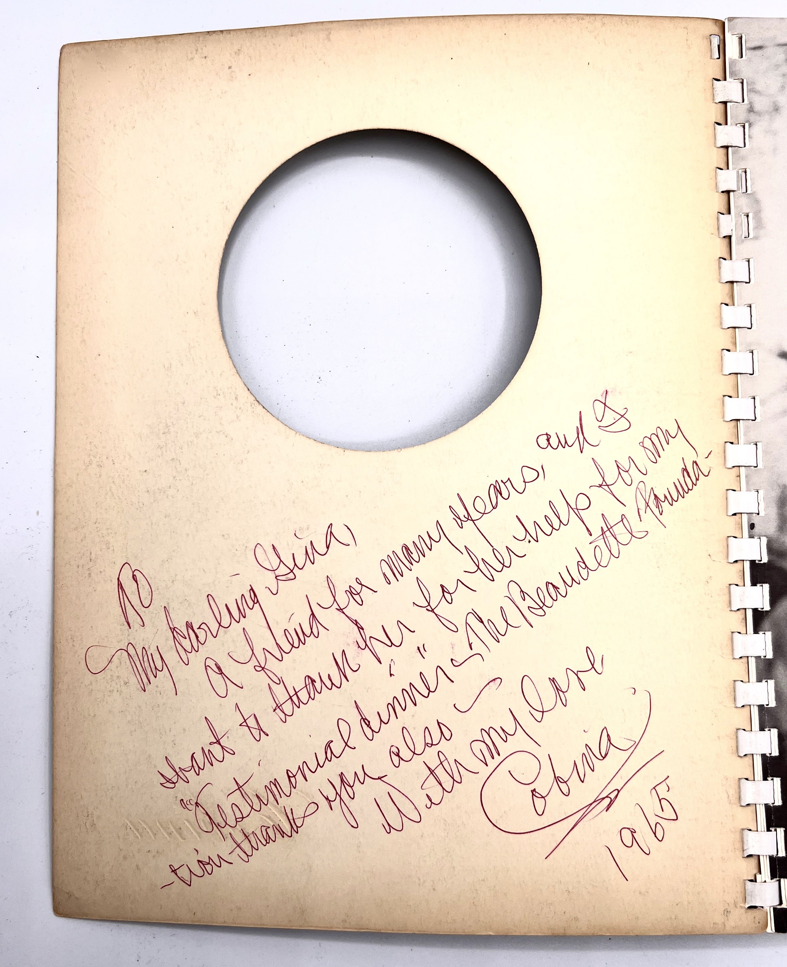 Beverly Hills, California, 1964. Spiral bound wraps. Gold wraps, cutout with black and white photo, white plastic combs. Very good. Unpaginated. This tribute to Cobina Wright Sr. begins with a letter from Mary Pickford thanking Cobina Wright for her "humanitarian nature and interest in science by supporting her favorite project, the Beaudette Foundation for Marine Biology Research." Filled with full page "Ads" from friends including Mrs. Clark Gable, Irene Dunne, Mae West, Nat King Cole, Bob Hope & Family, George Hamilton, Kim Novak, Jerry Lewis, Barry Goldwater, Jayne Mansfield, Kirk Douglas, and many more. The evenings Program included Dinner with Art Linkletter as Master of Ceremonies, a tribute to Cobina by Mary Pickford, Music by Barney Sorkin and a show featuring Red Skelton, Roger Williams, and Johnny Mathis. Two page spread IN Memoriam to JOHN FITGERALD KENNEDY, testimonials, and a description of the Beaudette Foundation For Biological Research.