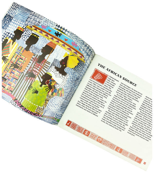 Uncommon educational booklet reproducing the lyrics and piano music of songs that "celebrate the colorful beauty of the magnificent musical legacy proudly embraced by African-American culture." The text and music accompanied by splendid vibrant illustrations by Varnette P. Honeywood.