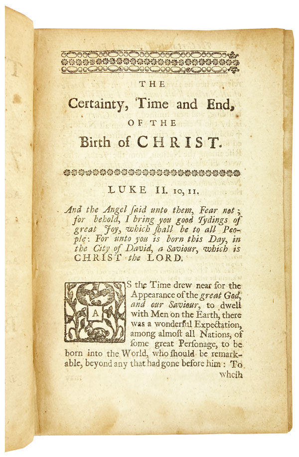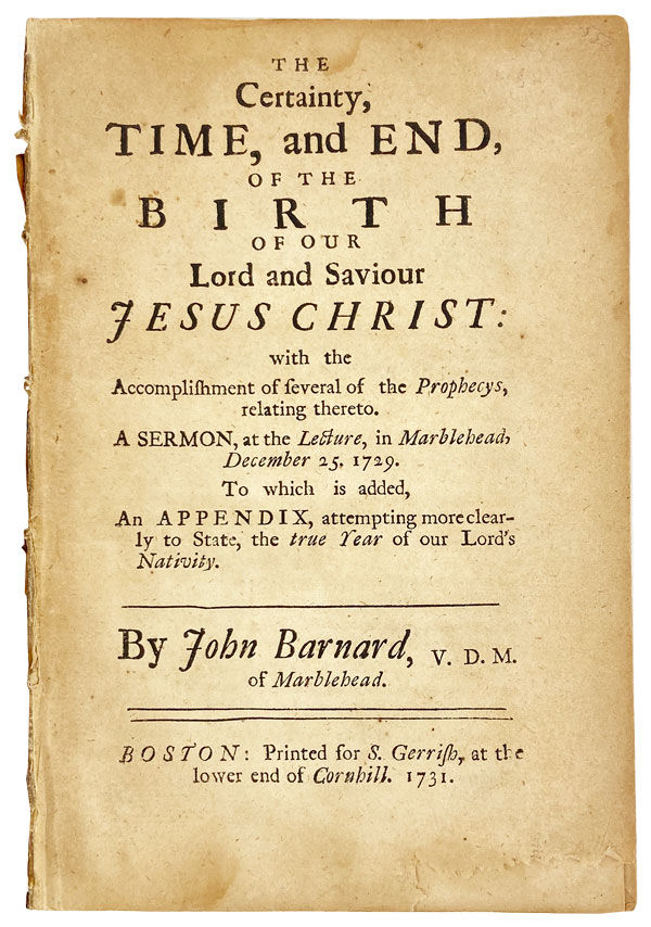 Lengthy Christmas sermon by the colorful "Old Light" Congregationalist minister of Marblehead, Massachusetts. After sixty-five pages of calculations, the orator finally concludes that "I cannot but look upon it, as more than a vain Conjecture, even, an established proposition, That Jesus Christ, our Blessed Saviour, was born some Time in October, An. J.P. 4711: Two Years, and two Months and some Days, before the common Aera" (p. 66).