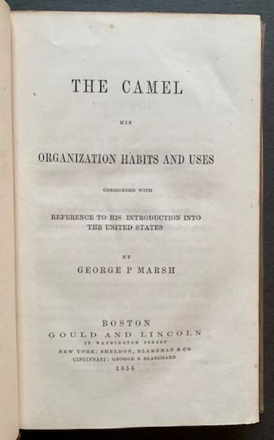 Boston: Gould and Lincoln, 1856. Decorative Boards. Very Good. The 1856 1st edition. Solid and VG in its chocolate-brown boards, with decorative blindstamping at the panels and bright gilt-titling along the spine. Spotting to the panels (more pronounced along the rear panel), very light wear at the spine ends. Internally very clean, with no writing or markings to speak of. 12mo, chapter headings include "Speed and Gait", "The Foot", "Anatomy of the Stomach", "Geographical Range of the Camel", etc.