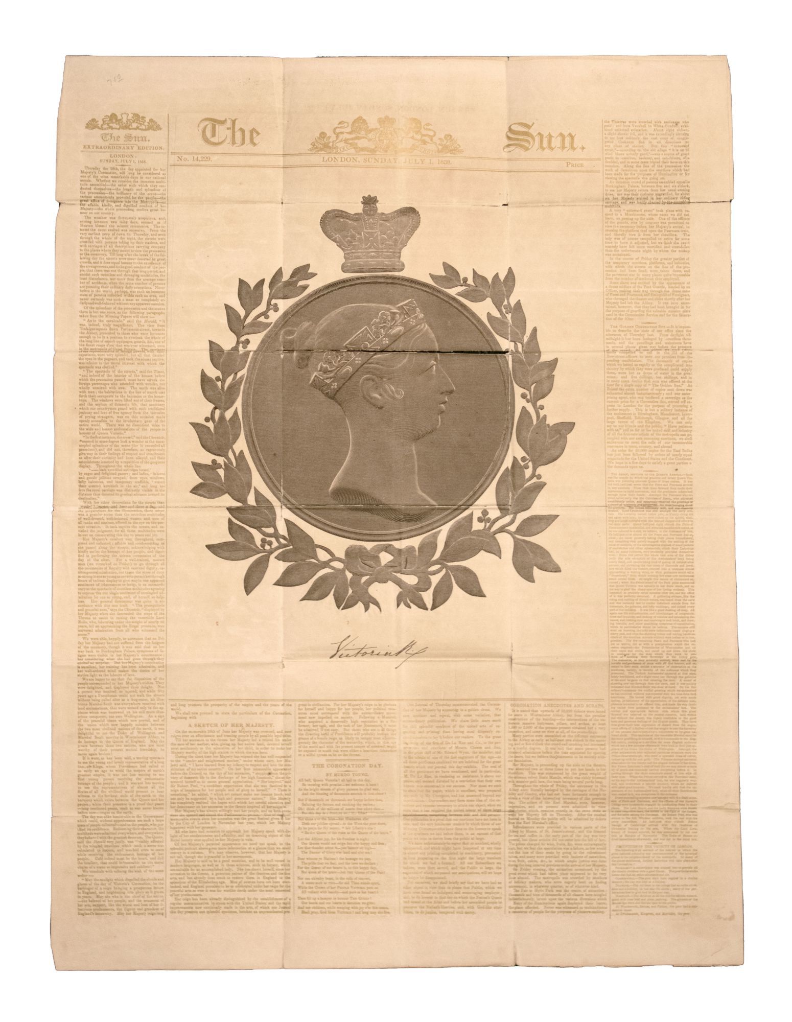 London: Printed and published by Murdo Young of No. 112, Strand, at The Sun Ofice, 1838. Printed in gold, with a large portrait of the young queen in profile within laurels in black line engraving. 4 pp. 1 vols. Broadsheet 65 x 48 cm. One penny newspaper stamp in margin. Old folds with splits. Housed in brown morocco backed cloth case. Printed in gold, with a large portrait of the young queen in profile within laurels in black line engraving. 4 pp. 1 vols. Broadsheet 65 x 48 cm. "Gold edition" commemorating the coronation of Queen Victoria, June 28, 1838.