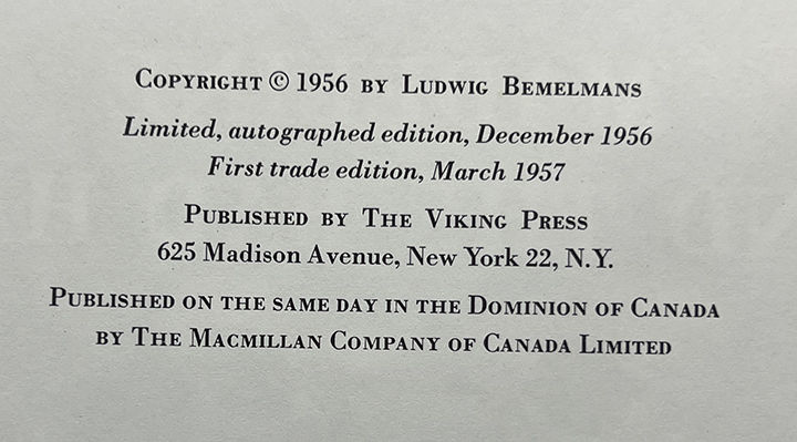 New York: The Viking Press, 1957. First Edition. Hardcover. Very Good/Good. Very Good in a Good jacket, unclipped ($3.50), large chip at the front board, small chips and tears throughout. Red buckram, rubbed and frayed at the edges and corners. Square, bound with some reading wear, small stains throughout. The third Madeline novel, the first published by Viking.