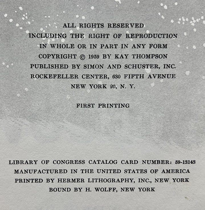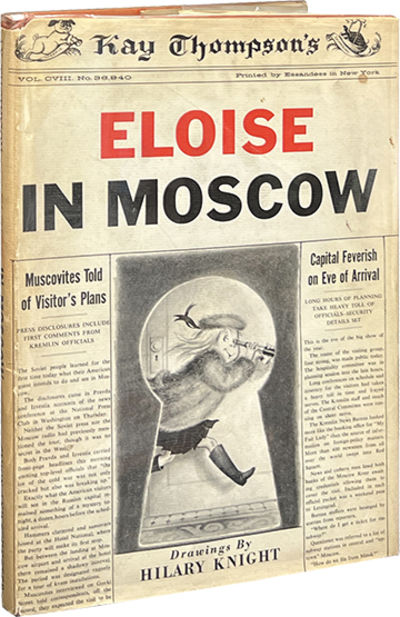 New York: Simon and Schuster, 1959. First Edition. Hardcover. Very Good/Very Good. Drawings by Hilary Knight. Very Good in a Very Good jacket, unclipped ($3.75), generally toned, rubbed at the spine with some loss to the head and foot of the spine. Orange paper on the boards, bumped at the corners, with black ink lettering and designs on the spine and front board. Square, bound with some reading wear, former owner's blindstamp on the front endpaper. The fourth book in Thompson's Eloise series, this time seeing the titular character travel to the Soviet Union.