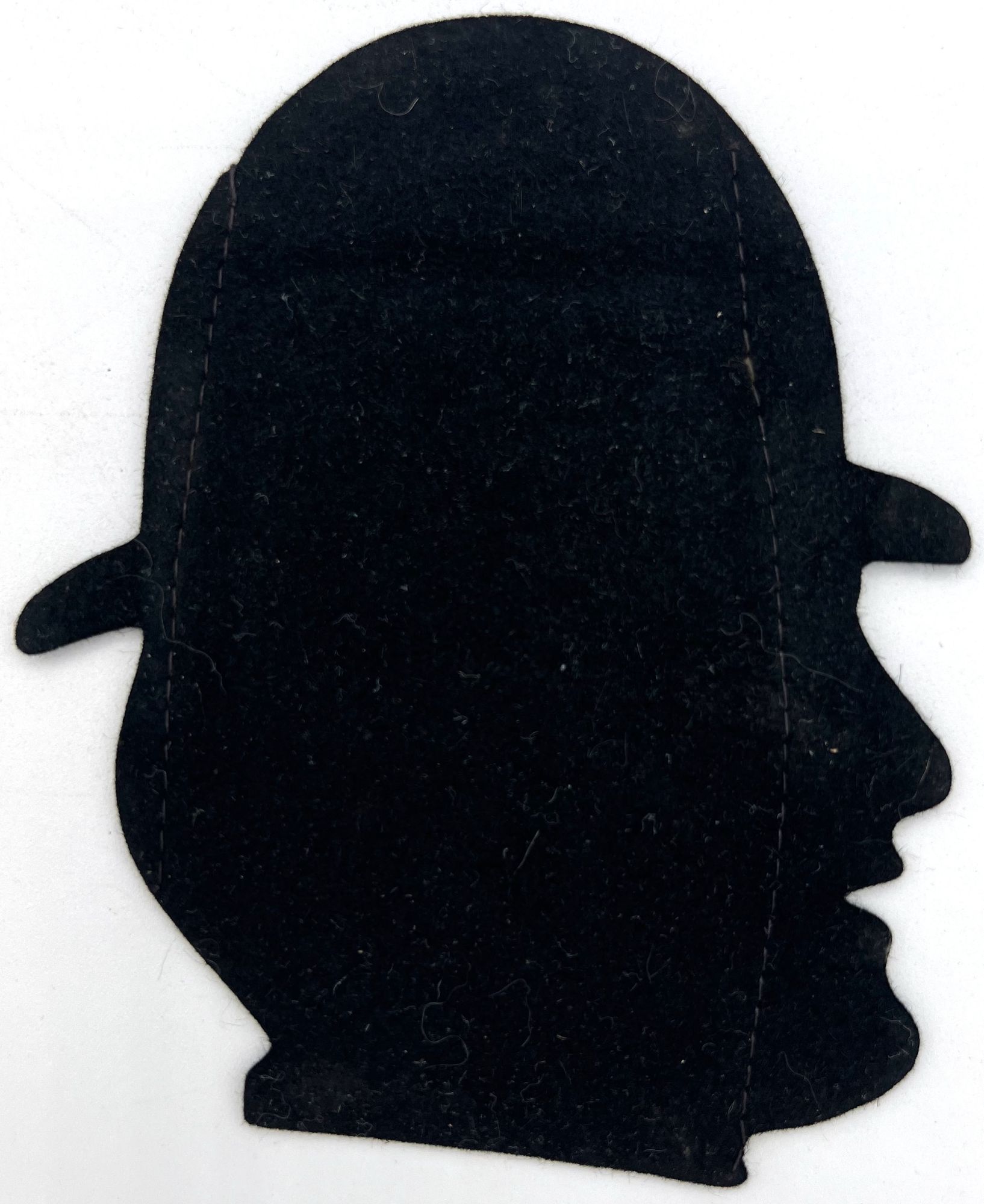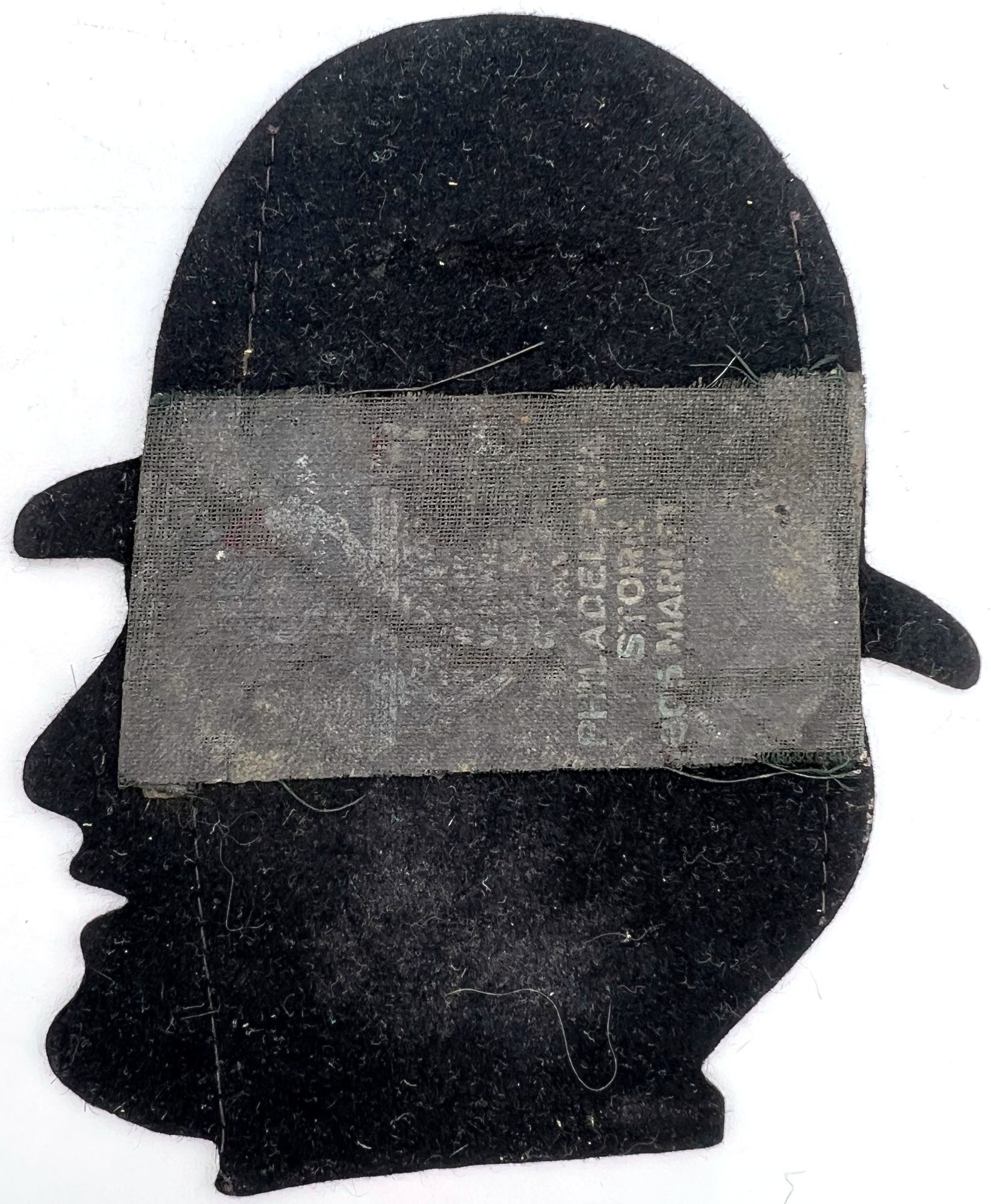 1900. Diecut in the shape of a man in a derby, this is a felt hat cleaner, a loop on the back through which one slips fingers, for gripping the cleaner and; Instructions can't be read, though the words "Philadelphia Store, 605 Market" can be read.; In very good condition.; 4 3/8" X 5 ¼".