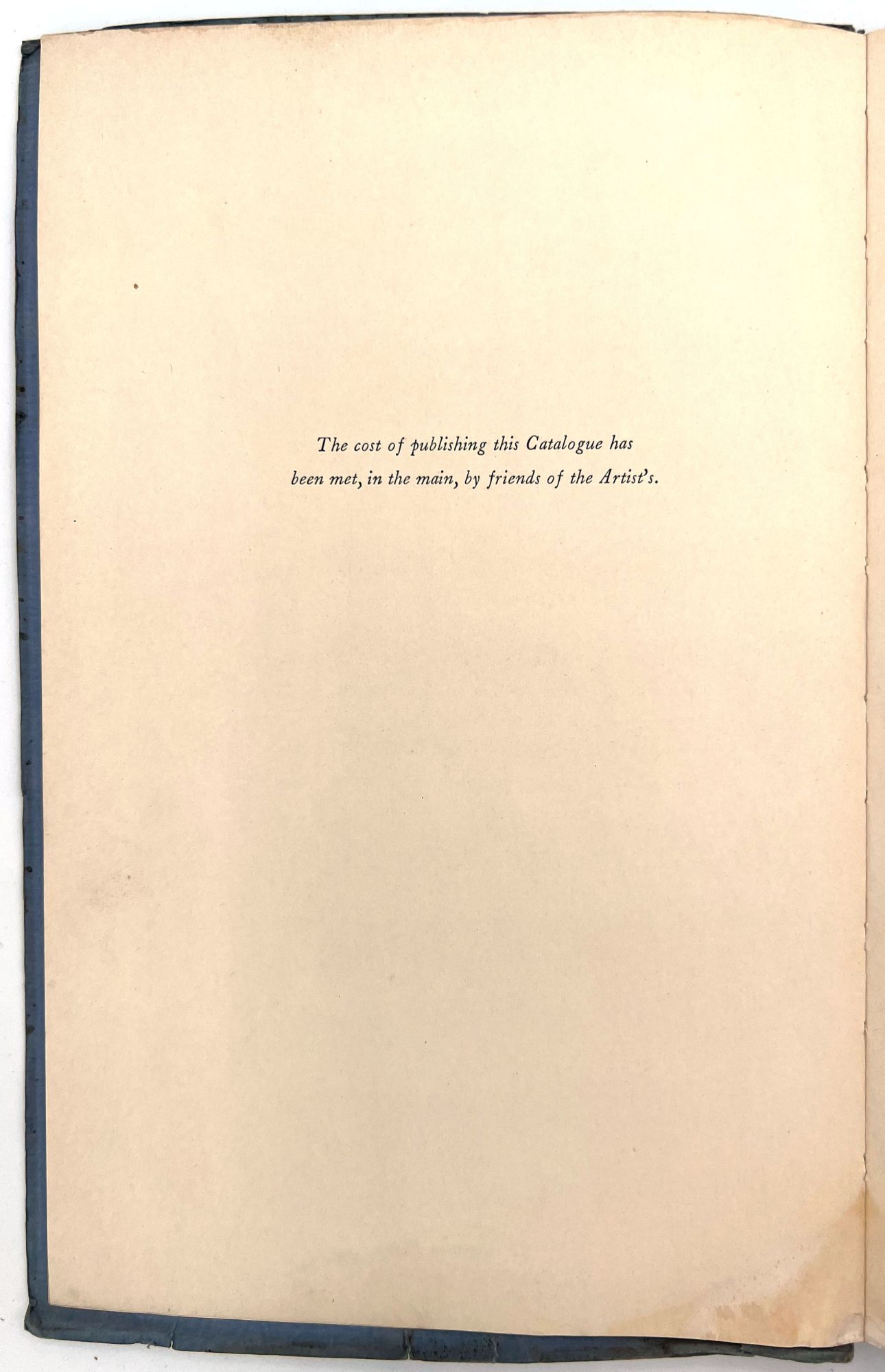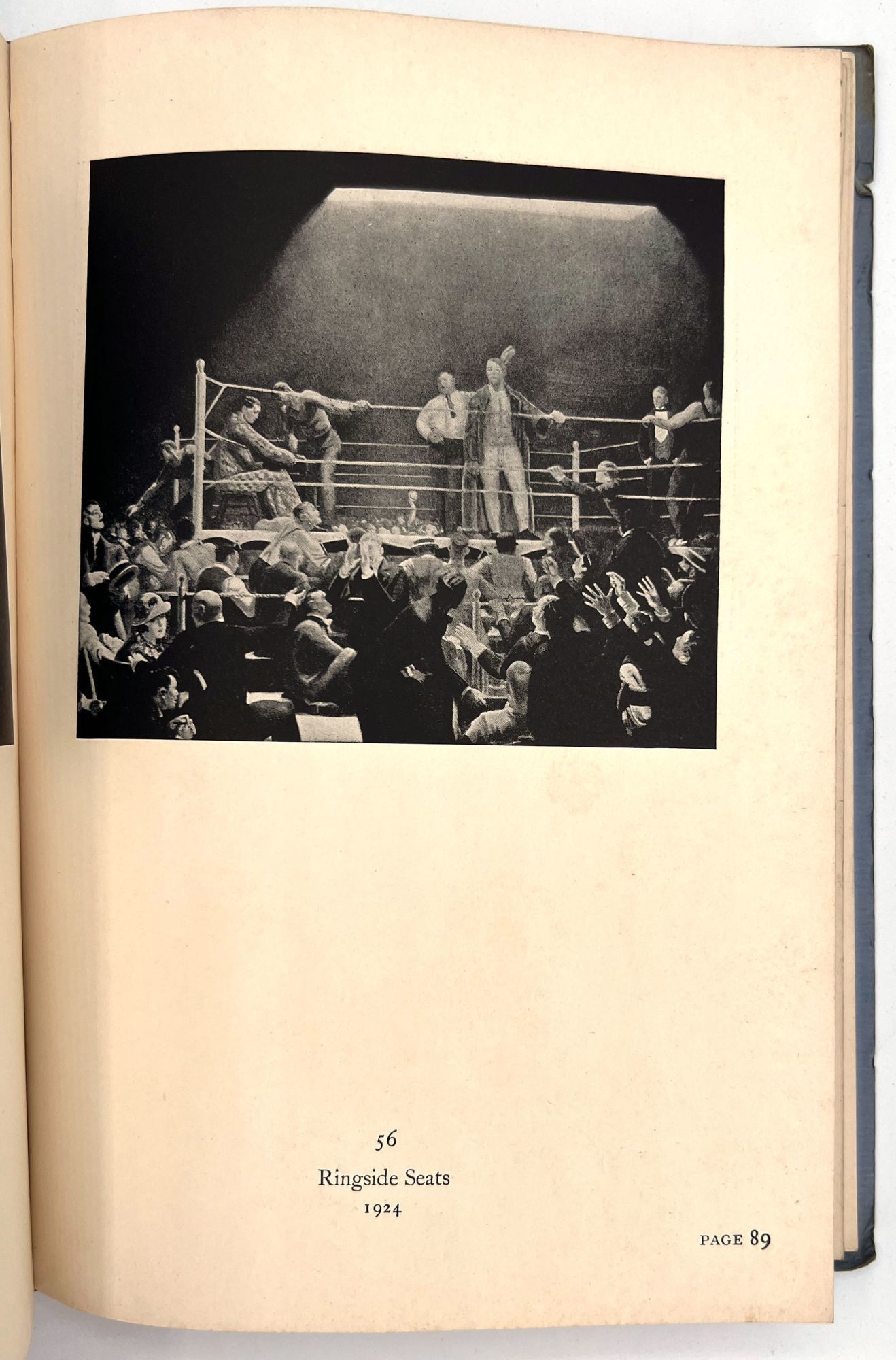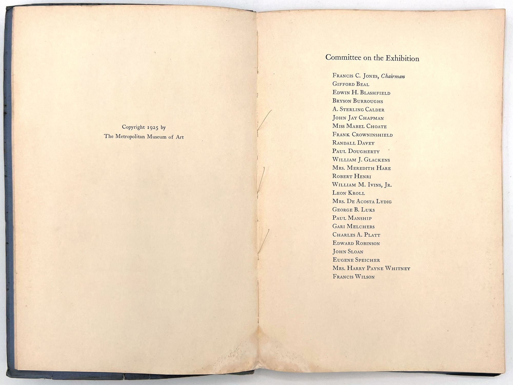 Catalog of the George Bellows Memorial Exhibition, held in 1925 at The Metropolitan Museum of Art, 132 pages. Contains catalogs of oil paintings, drawings and lithographs. All of the paintings, twelve of the drawings, and thirteen of the lithographs, have been reproduced in the catalog, a total of eighty-eight plates in all. Condition: covers soiled, its edges creased, with few small margin tears. Soiling on first and last pages (no illustrations on these pages). Staining on fore edges, top edges. Otherwise VG. Small name stamp imprint on first blank.
