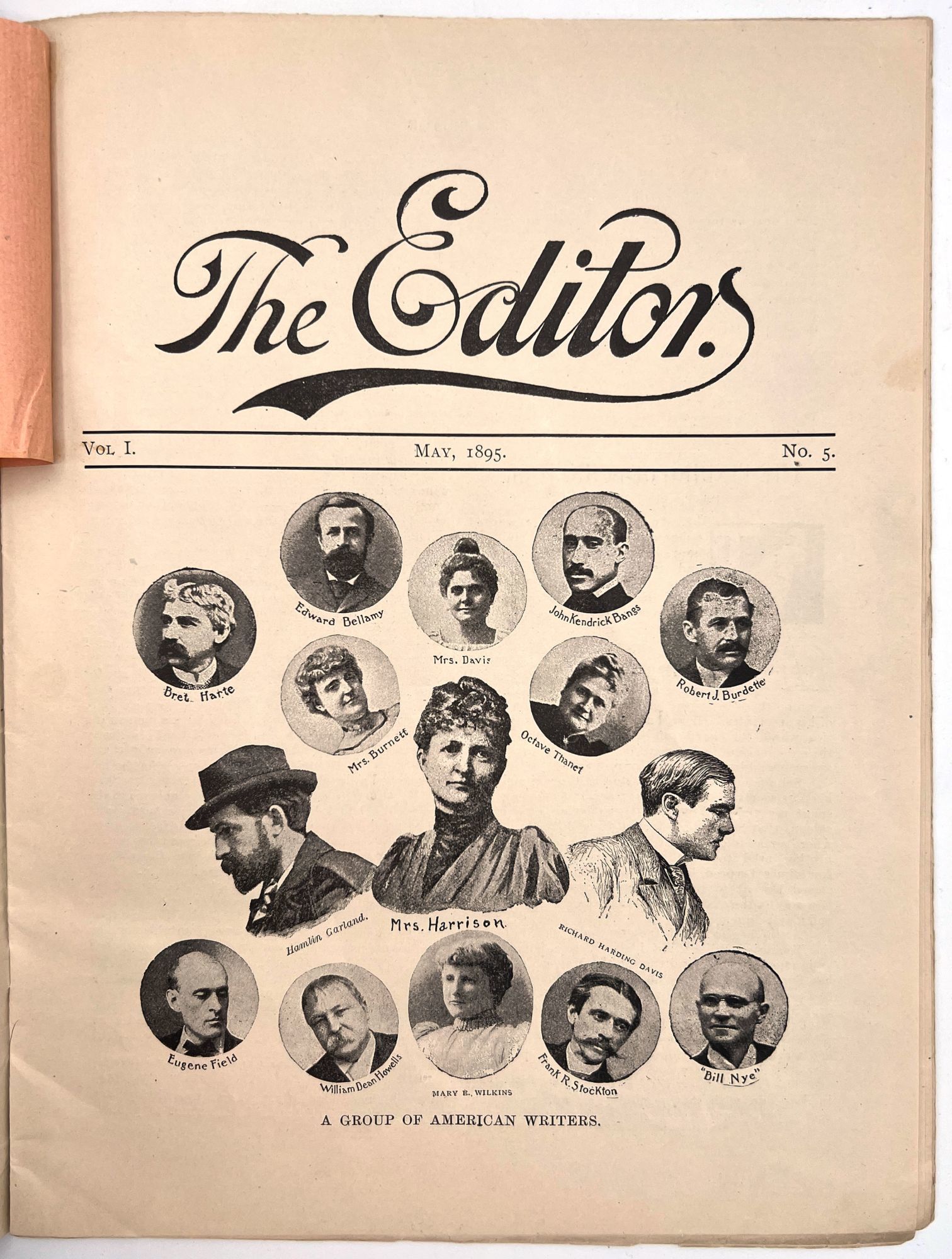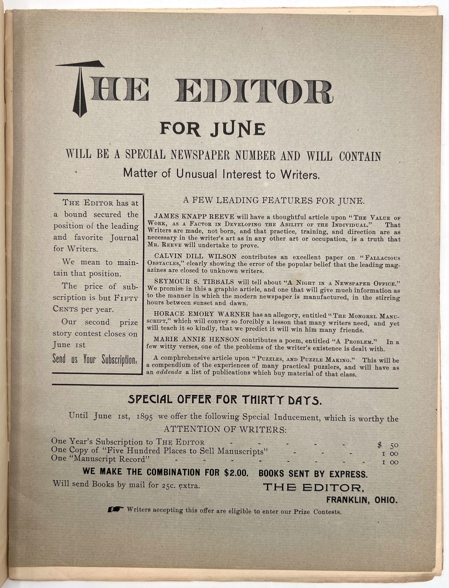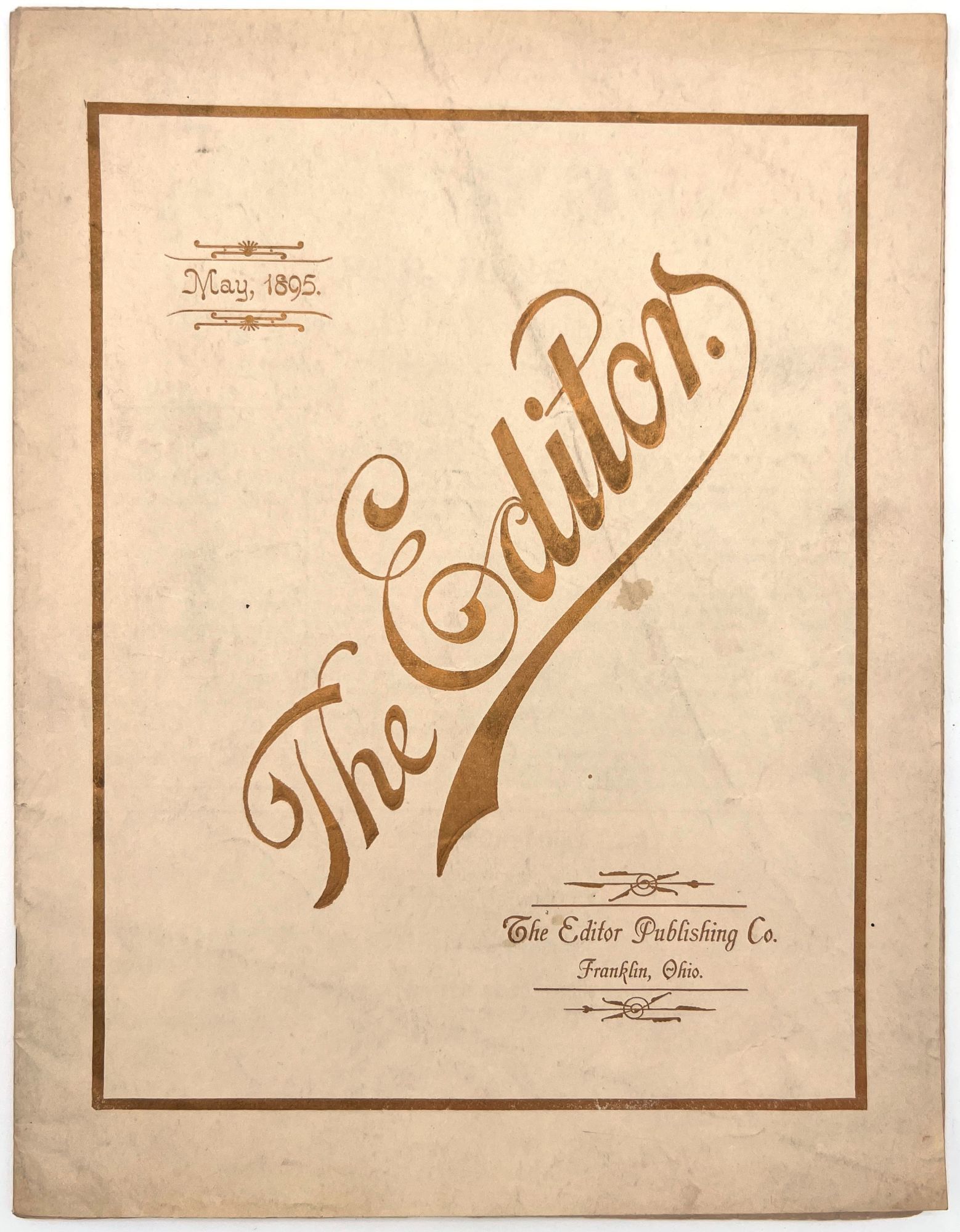 Franklin, Ohio: The Editor Publishing Co, 1895. Magazine with cover, loose paper notification inserted and 1/3 sheet "special notice" attached to first page of magazine,magazine includes Volume I, no. 5, pp 66-80. The editor consists of a variety of materials, published monthly the first few and end few pages are advertisements and bound together in a final cover. Final cover stamped with "this cover is a sample of Hornet Linen, manufactured by Harding Paper Co". 11" x 8 1/2" some wear and slight staining, slight tearing beginning at edges.