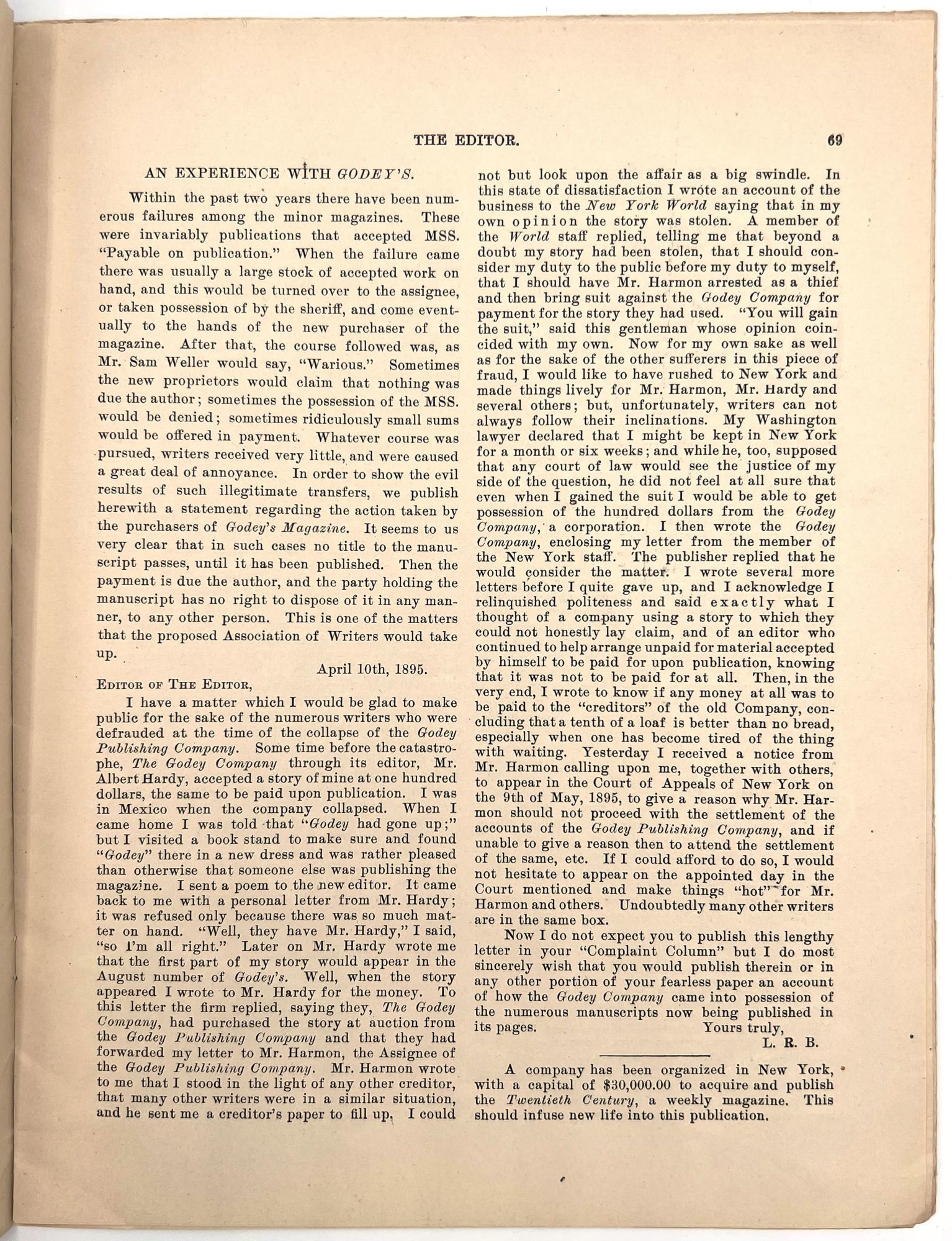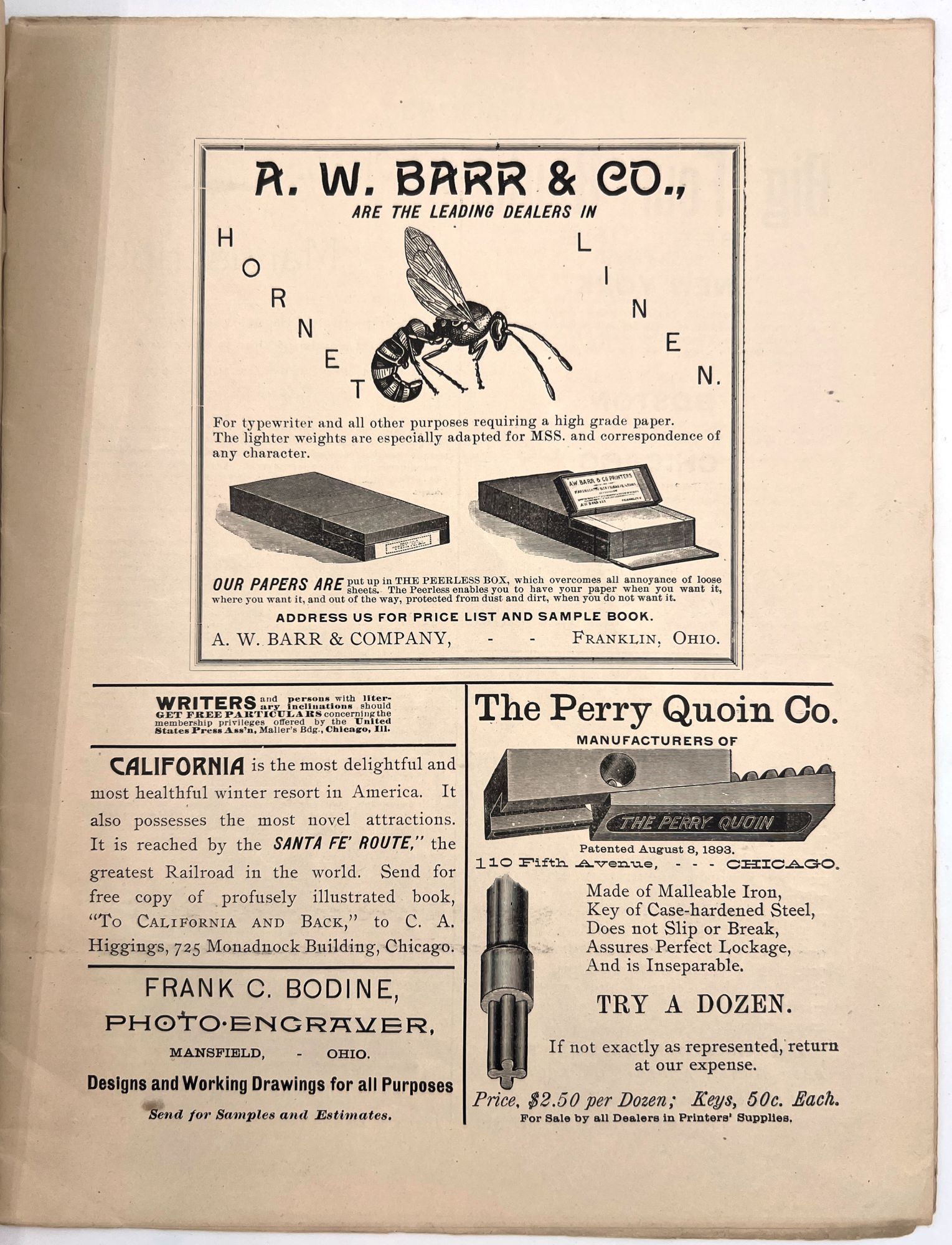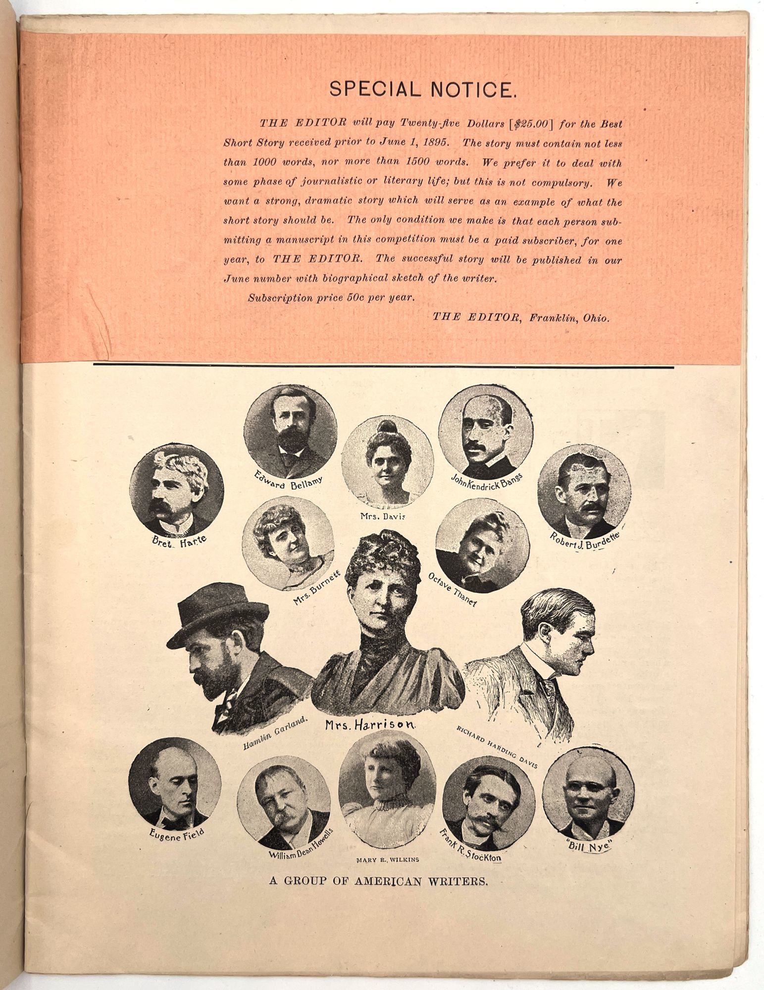 Franklin, Ohio: The Editor Publishing Co, 1895. Magazine with cover, loose paper notification inserted and 1/3 sheet "special notice" attached to first page of magazine,magazine includes Volume I, no. 5, pp 66-80. The editor consists of a variety of materials, published monthly the first few and end few pages are advertisements and bound together in a final cover. Final cover stamped with "this cover is a sample of Hornet Linen, manufactured by Harding Paper Co". 11" x 8 1/2" some wear and slight staining, slight tearing beginning at edges.