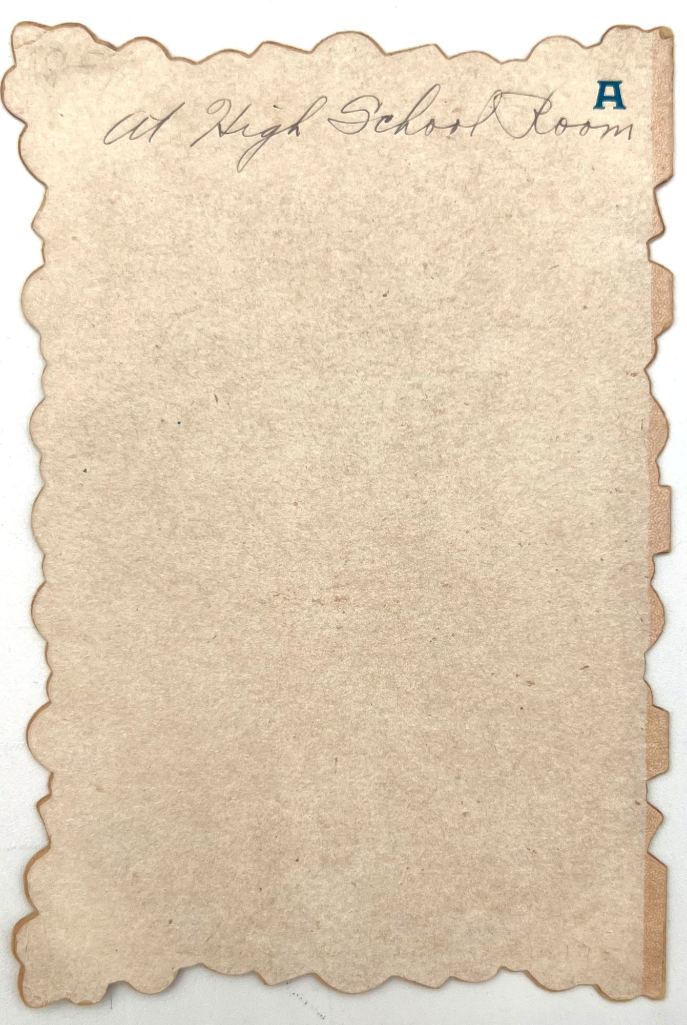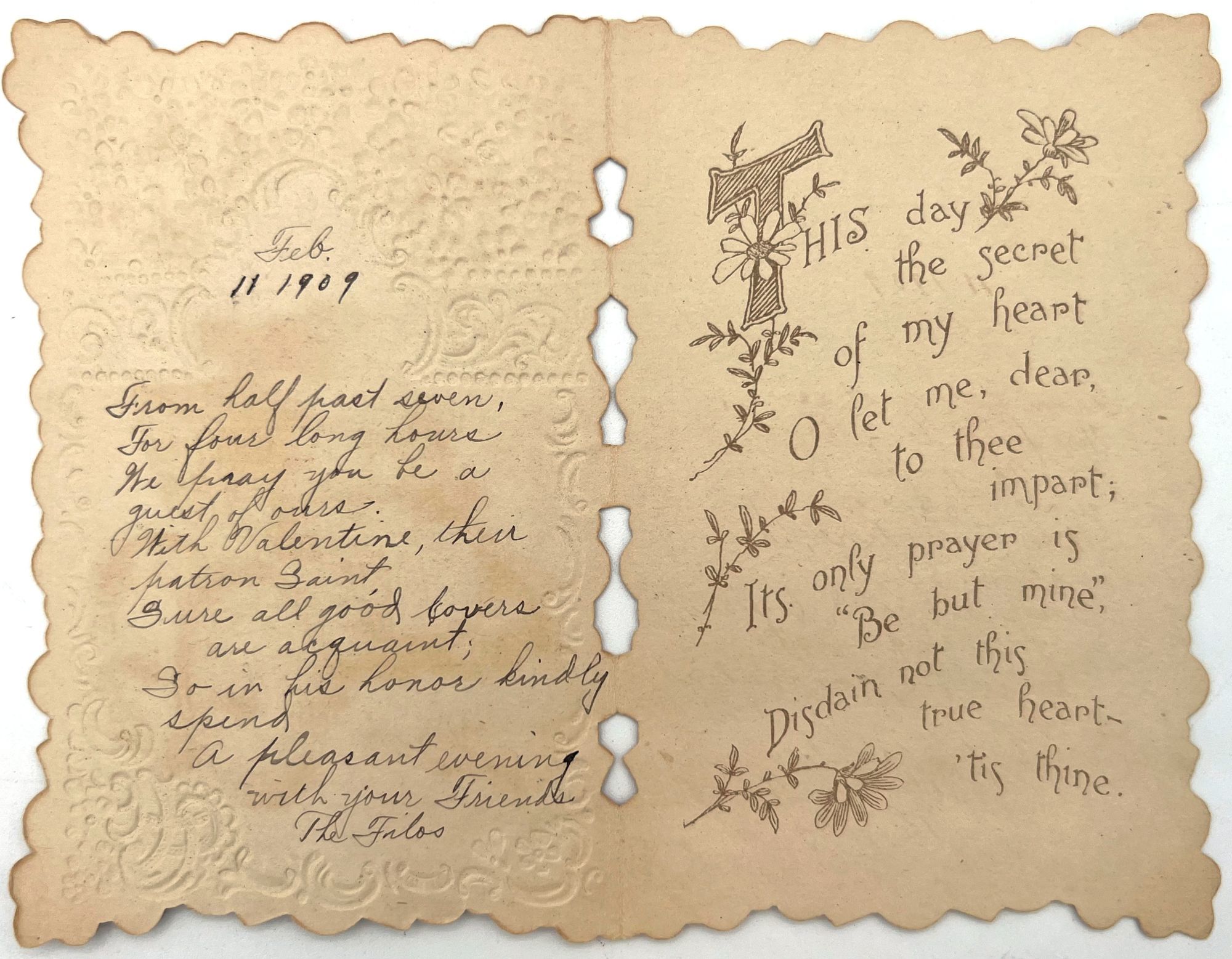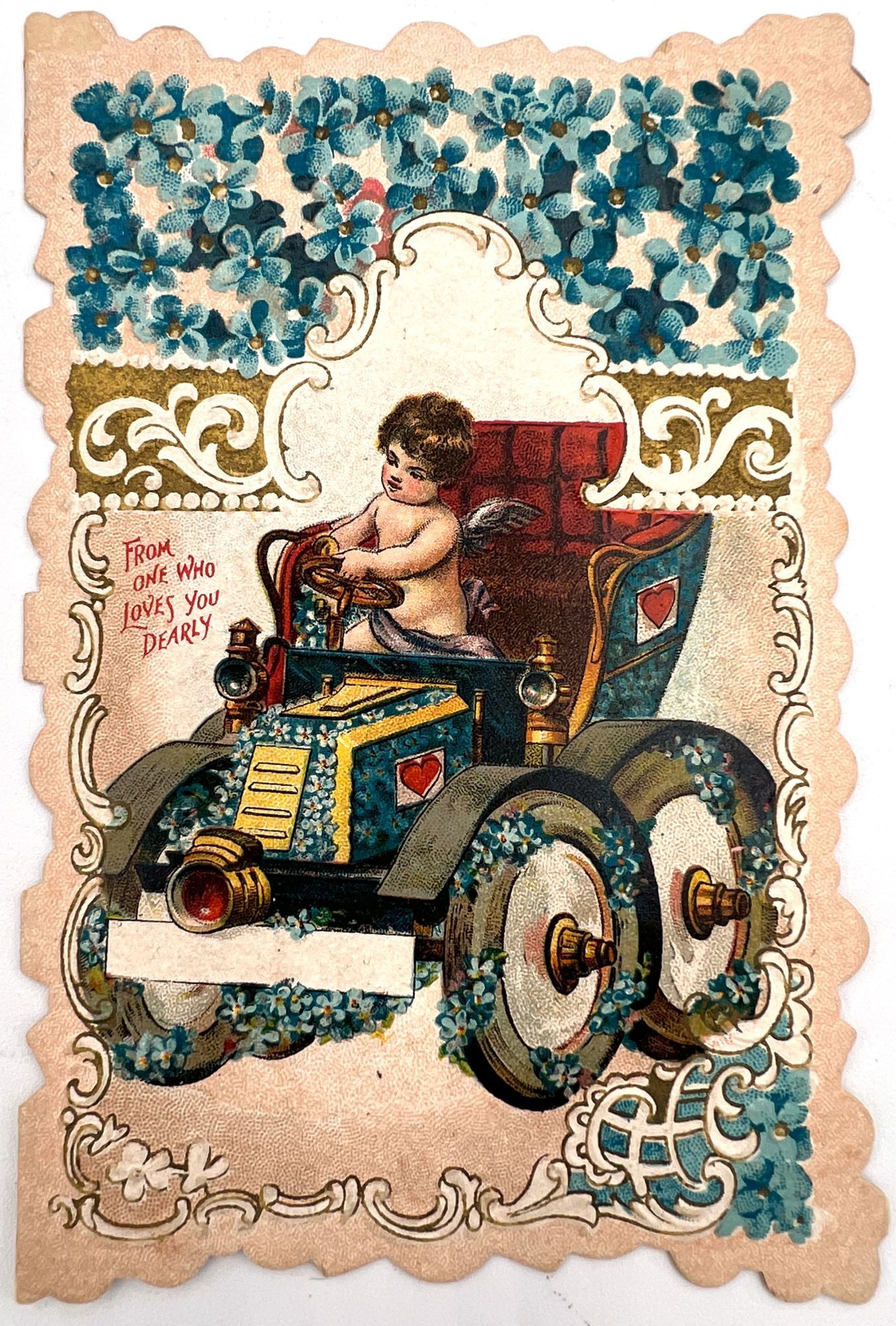 An embossed, die cut, 5 1/2" x 3 3/4" Love Chariot. This cherub is driving a chariot through a white archway. This special chariot is made of blue forget-me-nots. The sentiment on front 'From One Who Love's You Dearly.' Inside the card on the left side, is a personal pencil inscription dated Feb. 11, 1909. On the right side is a verse. The Condition is good and more pencil inscription on the back.,
