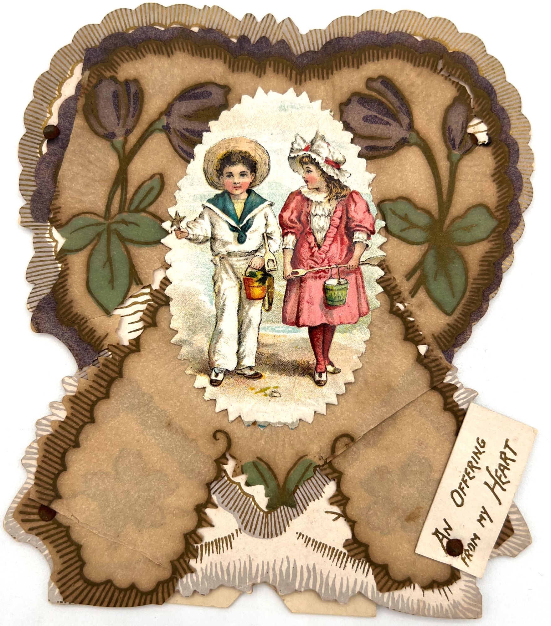 A 5 3/4" x 5" die-cut, heart shaped, easel backed valentine with applied parchment with floral and leaf design held in place with rivets.The center has an image of a sailor walking with a pretty young girl. The backgroundhas an ocean scene. The final tier has gray stripe edging.The lower right corner has a sentiment'An Offeringfrom My Heart'. The condition is good. Parchment and Rivet Art Nouveau influenced design.