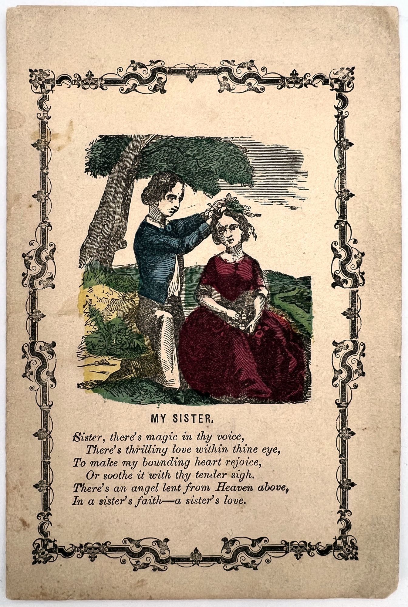 [United States], 1850. Very good. Minor toning, dust soiling.. A sweet Valentine from brother to sister, with hand colored wood engraving, that reads: "Sister, there's magic in thy voice, / There's thrilling love within thine eye, / To make my bounding heart rejoice, / Or soothe it with thy tender sigh. / There's an angel lent from Heaven above, / In a sister's faith--a sister's love."