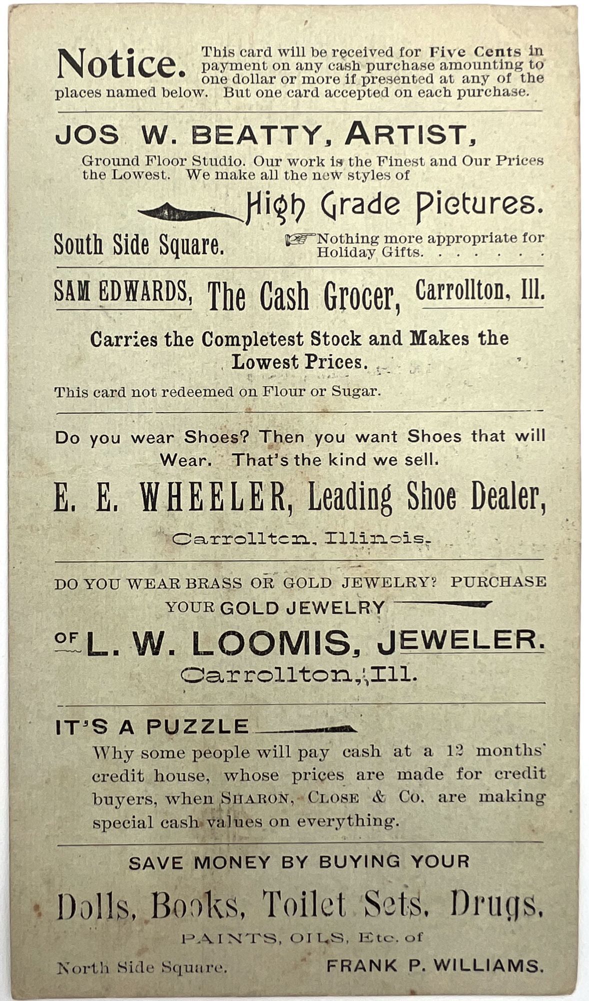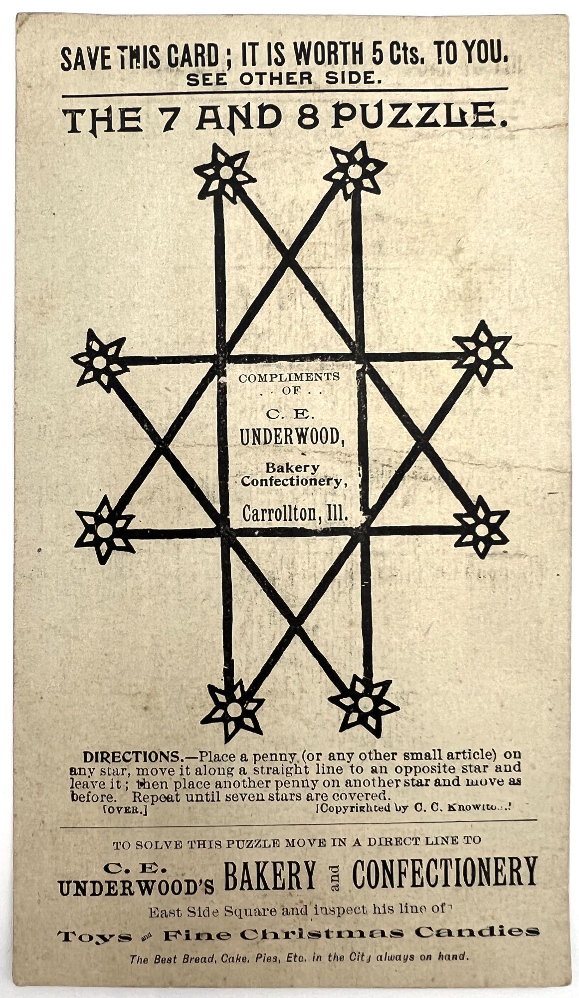 Carrollton, Illinois: C.E. Underwood's Bakery and Confectionary, 1900. Very good. Minor toning, edge wear, minor toning.. A delightful puzzle and premium, printed on card and used to advertise C.E. Underwood's Bakery and Confectionary. The directions are as follows: "Place a penny (or any other small article) on any star, move it along a straight line to an opposite star and leave it; then place another penny on another star and move as before. Repeat until seven stars are covered. Advertisements for other local businesses included on verso. Measures 6.25" by 3.5