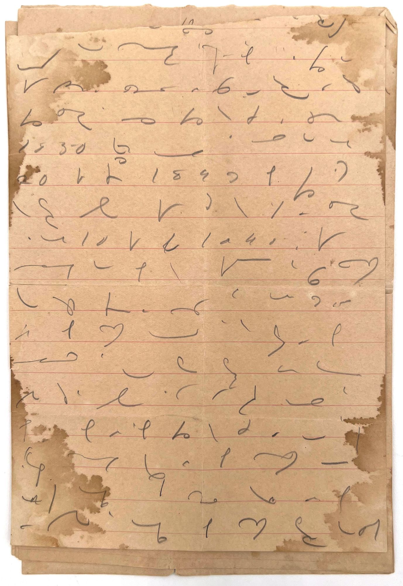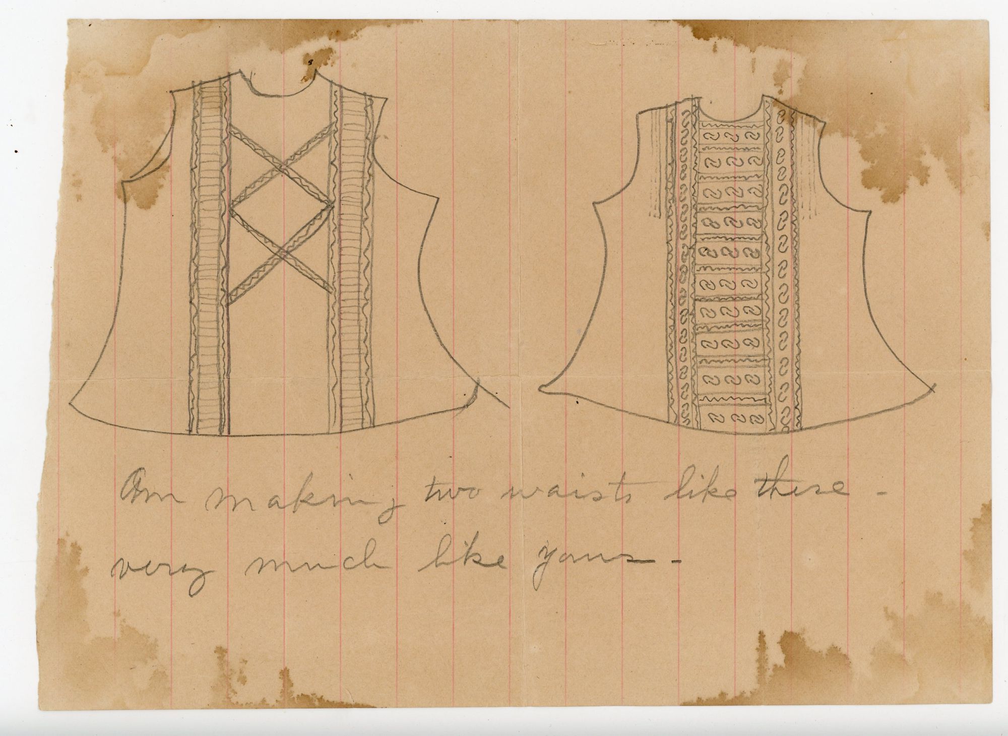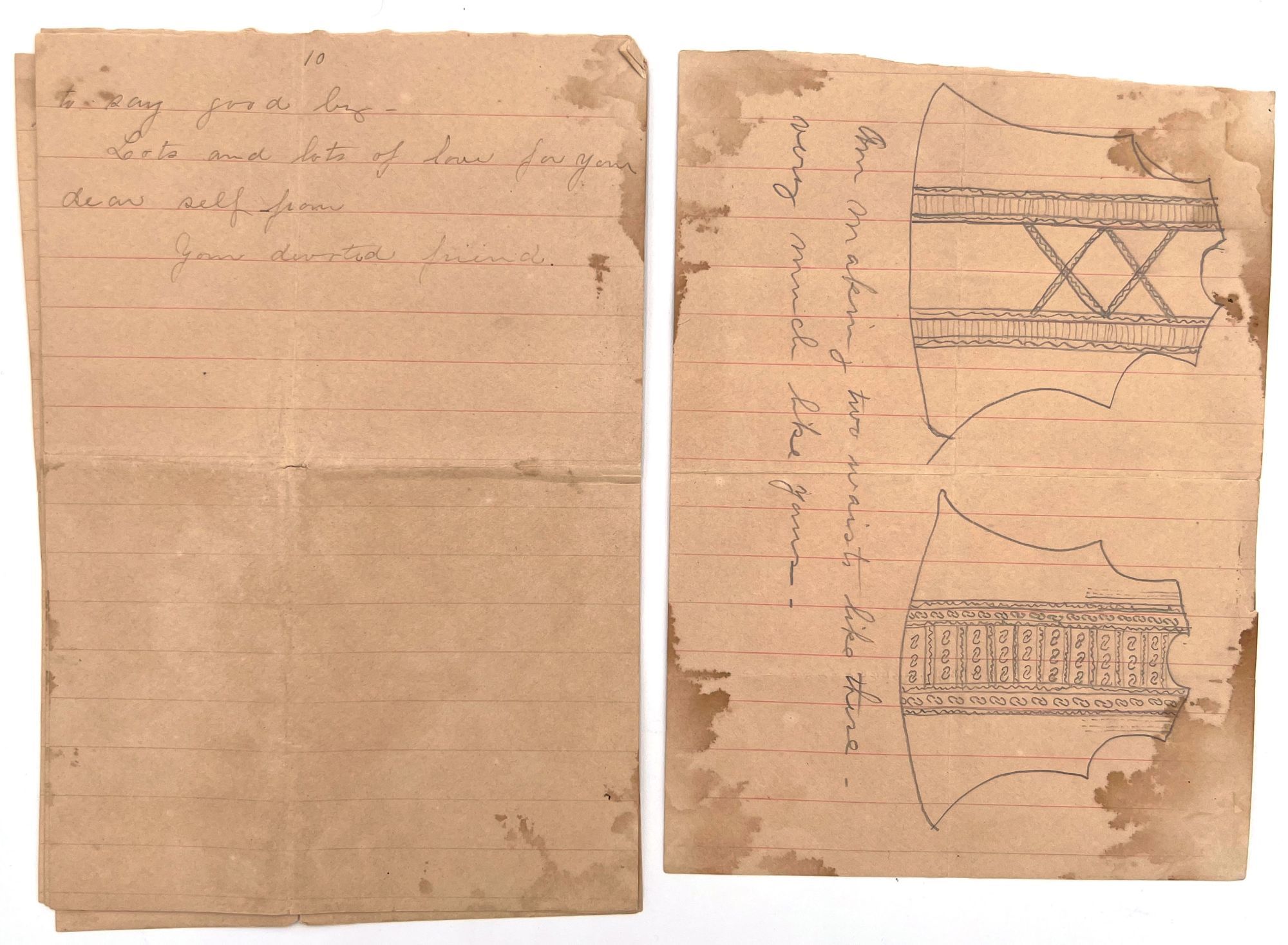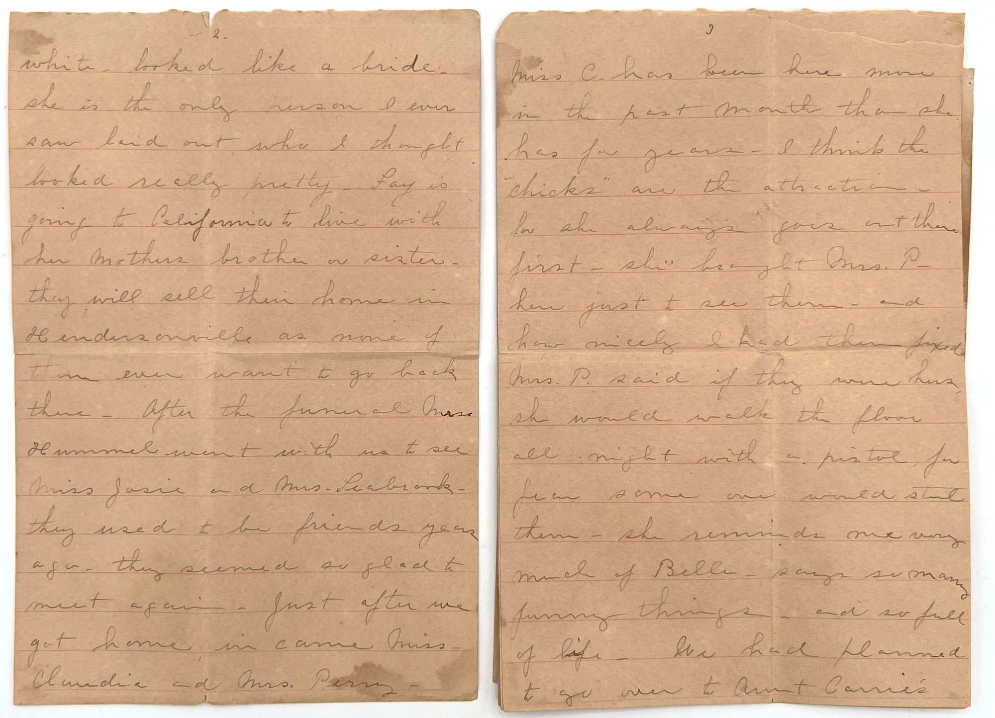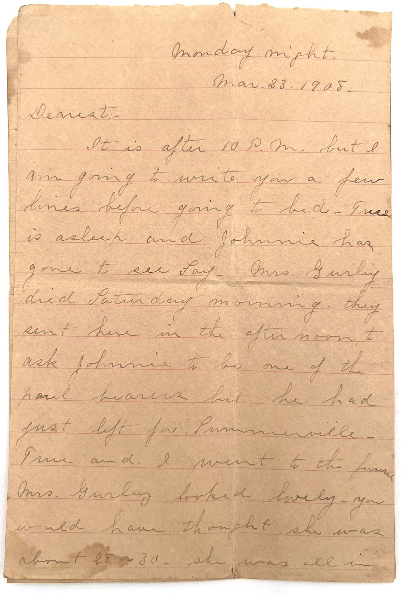 [Hendersonville, North Carolina], 1908. Good to very good. Toned, minor short tears, water stains. Letter folds.. A letter written to "Dearest" from "Your devoted friend", giving the heartbreaking news of the death of an acquaintance, Mrs. Gurley of Hendersonville (tragically, her husband Professor E.W. Gurley would die later that year in November, leaving their daughter Fayetta Gurley orphaned). The author also relates news about friends and family, and that she has "been sewing on two white waists-- the hardest part is done-- would like to finish them tomorrow, but guess I will not as it is my day to cook" (p. 5). At the end of the letter, the author includes pencil sketches of the two waists with the caption, "Am making two waists like these-- very much like yours." Six leaves of lined notebook paper measuring 8.75" by 6". Shorthand notes on the verso of the final leaf. Accompanied by a modern transcription of the letter.