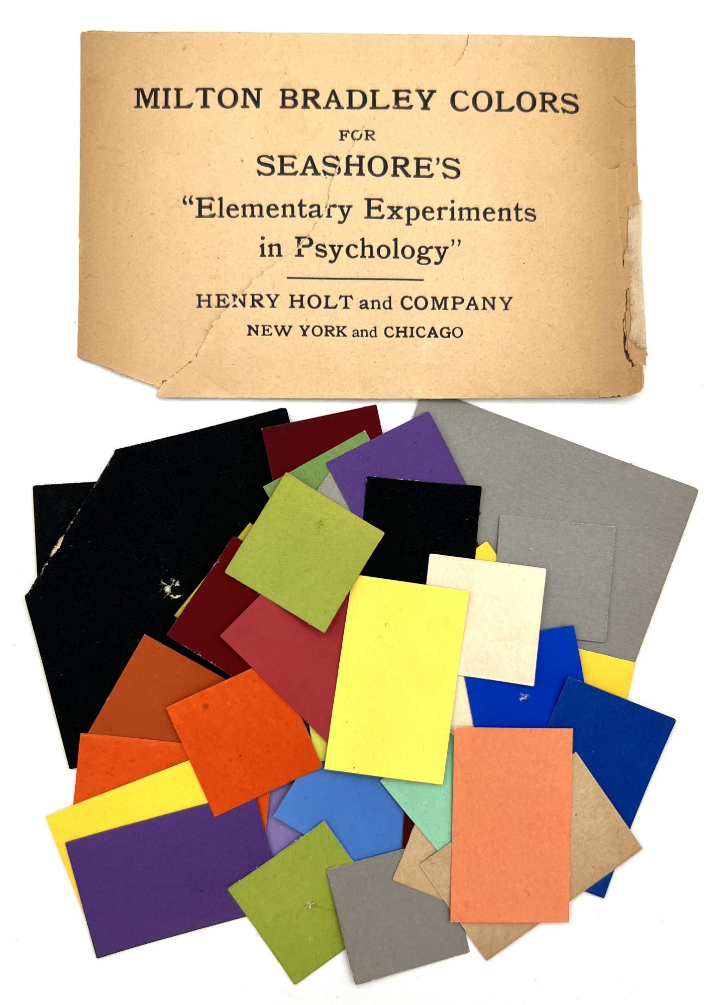 New York and Chicago: Henry Holt and Company, 1908. Good. Toned. Chipping and short tears to envelope, including one larger closed tear spanning approx. 4 inches. Minor damage or creasing to a couple of the colored slips. Housed in the original printed envelope, this item is comprised of thirty-nine (39) individual slips of colored paper produced to be used in conjunction with Carl E. and Robert Holmes Seashore's "Elementary Experiments in Psychology" (Henry Holt, 1908). The book contains sixteen experiments to accompany an introductory course in psychology. Several investigate vision and visual processes (hence the need for the colored slips here). Original printed envelope measures 3" by 4.75"; colored slips range in size from approx. 1" by 1" to 2.5" by 2.5