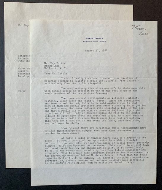 1952. Letters. Near Fine. A 2 pg. Robert Moses typed letter signed, written on his personal stationary (with the Babylon, Long Island letterhead) and addressed to radio and theatre producer and director Day Tuttle. Moses here discusses the challenges and complexities of building on Fire Island and displays a firm grasp of the material, citing specific causeways, projects and developments. The letter (2 separate 9"x11" pages) has held up very well. Clean and crisp and very well-preserved, with a strong ink signature by Moses.