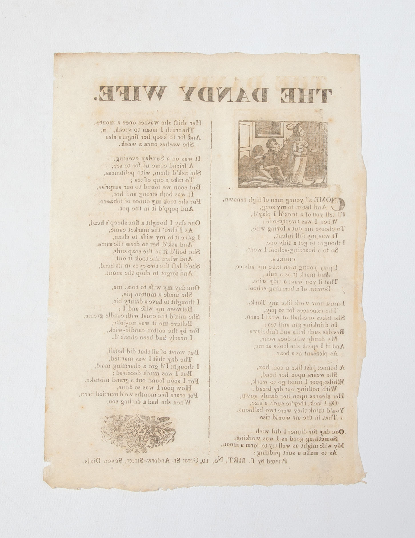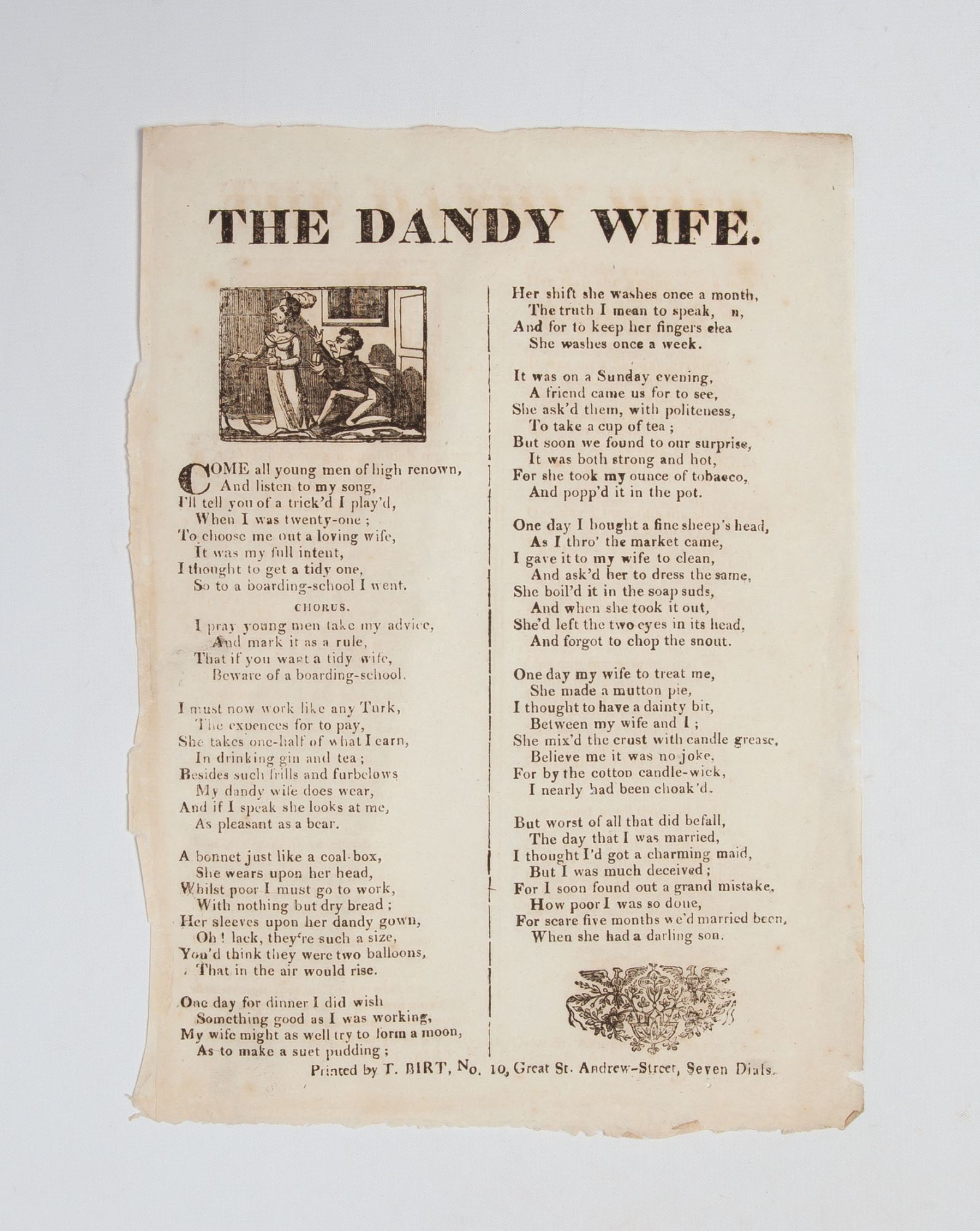 The Dandy Wife is narrated by a man who aimed "to choose me out a loving wife" at the age of twenty-one, but whose experience becomes a warning to "all young men of high renown": "If you want a tidy wife, Beware of a boarding school." What unfolds is a satire of how the marriage economy is affected when women have access to knowledge -- intellectual and physical -- and how by meeting a man's superficial expectations a woman can fulfill her own more pressing needs.