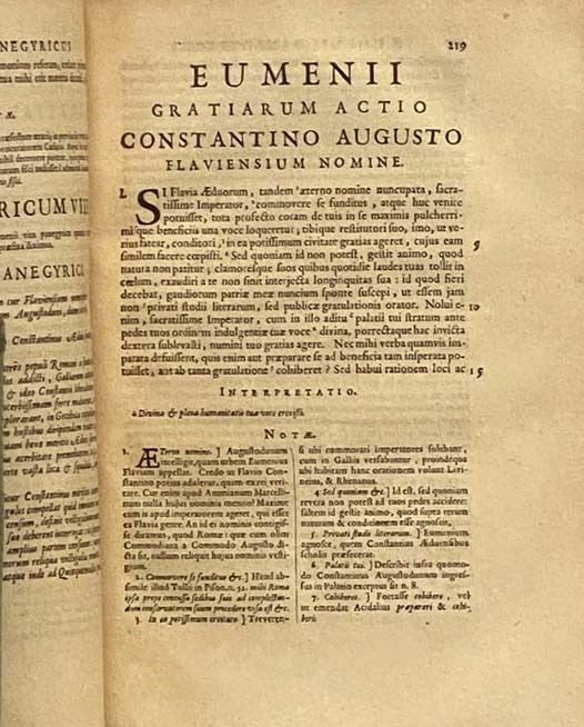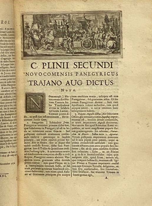 Parisiis [Paris]: Simonem Benard, via Jacobaea, e regione Collegii Claromontani Societatis Jesu, 1676. First Edition. Full-Leather. Good/No Jacket. First edition. Lacks frontispiece by Louis Cossin, otherwise complete. Joints beginning to split with minor loss from backstrip, minor loss from front board and corners, surface tear to front endpaper (as if a bookplate was removed), bookplate with single initial J adhered to top corner of same endpaper, top corner of front flyleaf clipped. 1676 Full-Leather. 350, [158] pp. a4, ẽ4, ĩ4, A- Vv4, Xx1, a-v4. Latin text. Full leather, morocco spine label, gilt titles, rules, and decorations in compartments, marbled edges and endpapers. Engraved title page and headers, including several numismatic copper engravings (depicting Roman coins). Collection of panegyrics of Roman emperors from the 1st to the 4th century (Trajan, Maximian Augustus, Julian the Apostate, Constantine I and II, Theodosius the Great) by Pliny the Younger, Mamertinus, Eumenes, Nazaire and Drepanius Pacatus. This was used as a source for Edward Gibbon's Decline and Fall of the Roman Empire, based on auction records showing that his bookplate appeared in a copy sold by Maggs. Contents include: C. Plinii Panegyricus Trajano dictus.; Claudii Mamertini Panegyricus Maximiano Augusto.; Ejusdem Claudii Mamertini Genethliacus Maximiani Augusti.; Eumenii oratio pro restaurandis Scholis.; Ejusdem Panegyricus Constantio Caesari.; Incerti Panegyricus Maximiano & Constantino; Eumenii Panegyricus Constantio Augusto.; Ejusdem gratiarum actio Constantino Augusto Flaviensium nomine; Incerti Panegyricus Constantino Augusto.; Nazarii Panegyricus Constantino Augusto.; Mamertini pro consulatu gratiarum actio Juliano Augusto.; Latini Pacati Drepanii Panegyricus Theodosio Augusto. Following text are two indices: Index Vocabulorum Omnium, Quae in Plinii Panegyrico Leguntur.; Index Vocabulorum Omnium, Quae in Sequentibus Undecim Panegyricis Continentur.
