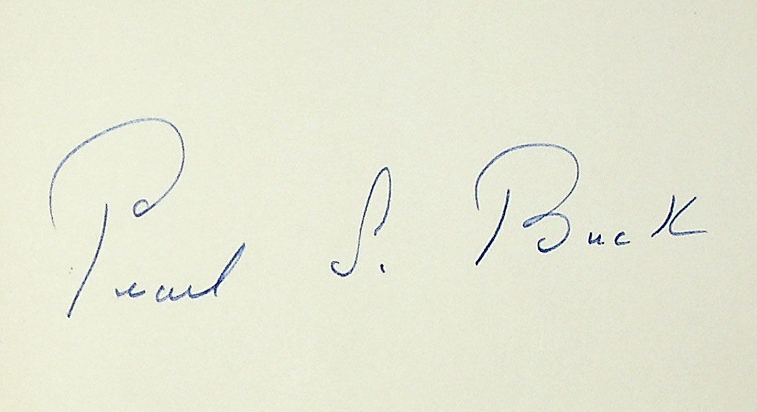 New York: The John Day Company, 1939. First Edition. Advance Issue, one of an unspecified number of copies signed by Buck on the front endpaper, and sent with "Dear Bookseller" letters (roughly a month prior to publication) with the compliments of The John Day Company. Octavo (22cm); black cloth, with titling and author's facsimile signature stamped in gilt on spine and front cover; red topstain; dustjacket; publisher's slipcase; [ii],[4],5-59,[3]pp, with a photographic frontispiece portrait of the author. Touch of dust-soil to cloth, else a clean, Near Fine copy. Dustjacket is unclipped (priced $1.50), lightly edgeworn, with some light surface wear, and a diagonal crease to rear flap; Very Good+ in like slipcase.