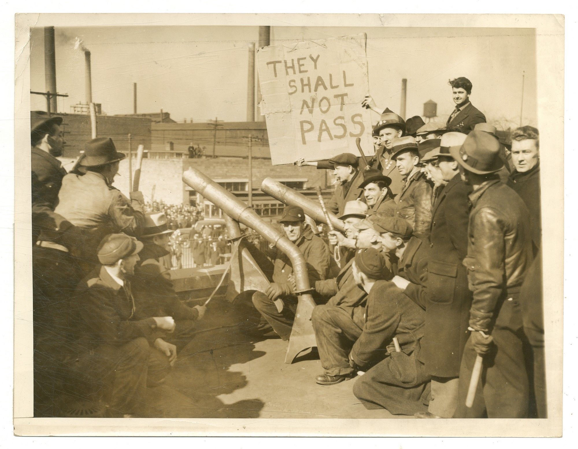 (New York: Pictures Incorporated, 1937. Unbound. Very Good. Gelatin silver photograph. Measuring 9” x 7”. Modest wear, very good. Stamp and printed snipe on the verso. Images of strikers on the rooftop of Detroit’s Dodge plant sitting by their “crudely constructed cannon” and a sign reading “They Shall Not Pass.” The snipe notes that at that moment 20,000 union sympathizers were holding a demonstration in the street. The strikers had defied a court injunction ordering them to evacuate. A compelling image.