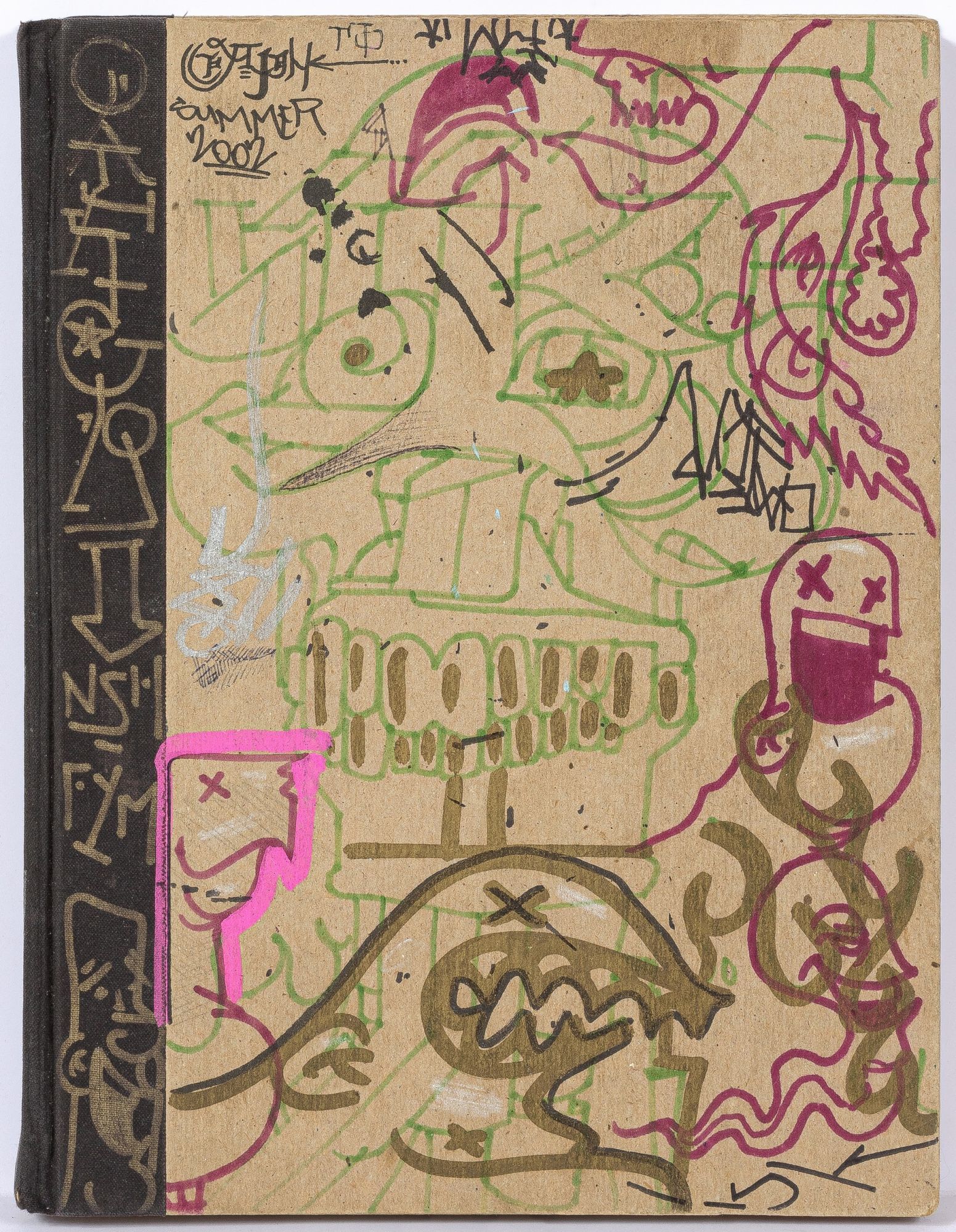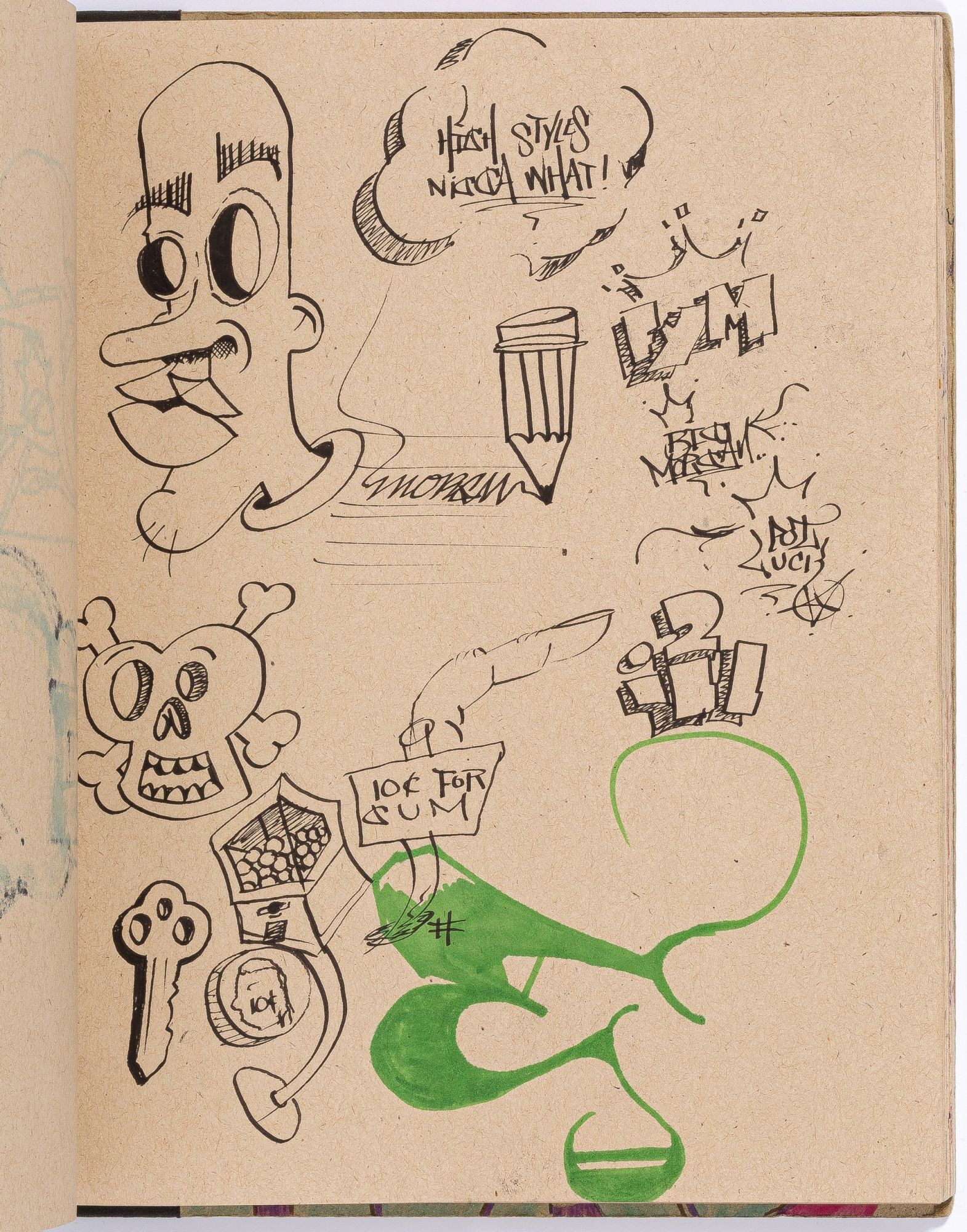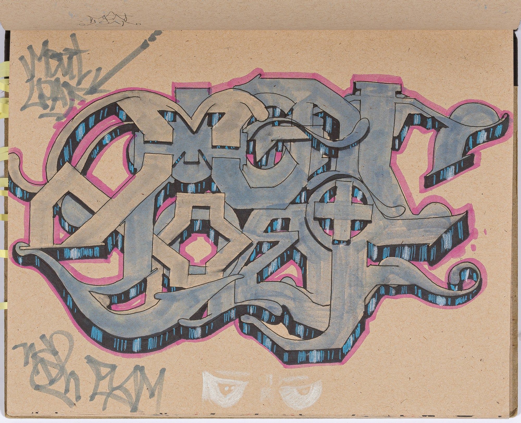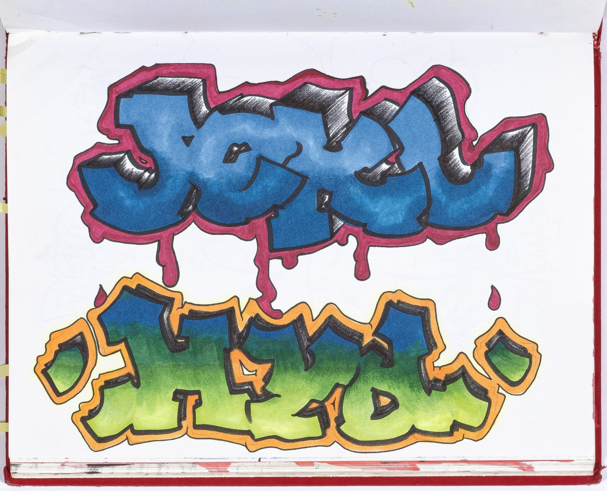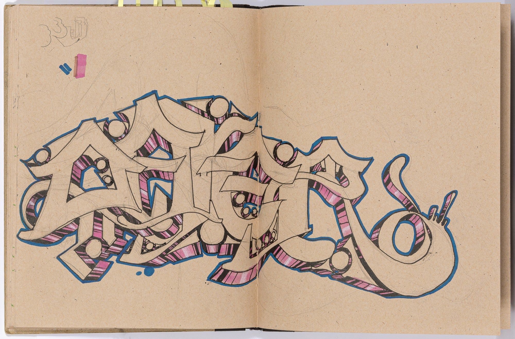 A group of four Black Books and accompanying photographs documenting the work of a Chicago area graffiti writer, who was active on the north side of Chicago between 2001-2007. The books include a range of images, styles and studies, from simple tags to increasingly larger and more elaborate examples. They vary from rough sketches to highly detailed finish drawings, mostly in pencil or ink, but a number in magic marker or paint pens. Three books are largely dedicated to perfecting existing tags, designing new versions, or incorporating additional element, such as figures, faces or highly stylizes backgrounds. One book appears to have doubled as a notebook for an art class, that shows more of a focus on figurative drawings. A number of pages are devoted to faces, hands, body poses, and shading of increasing sophistication, with some clearly resembling tattoo styles. In addition to the artist's own work, there is a smattering of art by fellow graffiti writers. In one image he incorporates a list of his crew into the design.