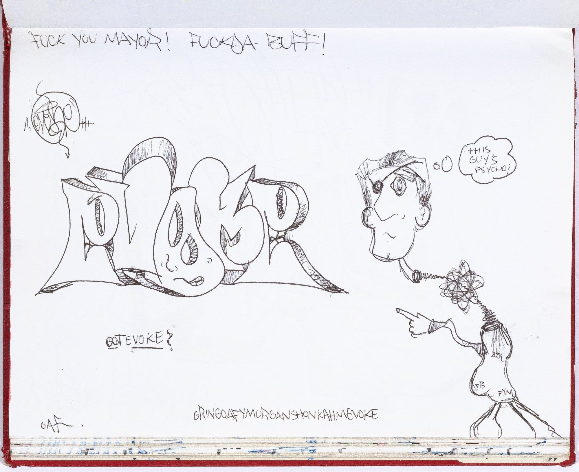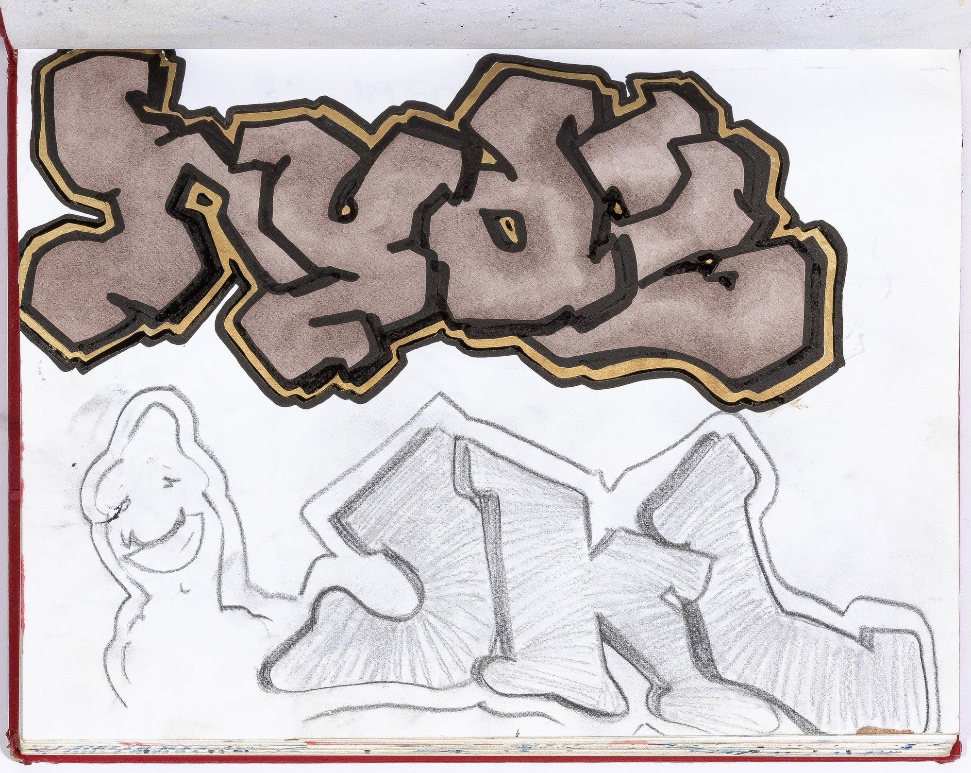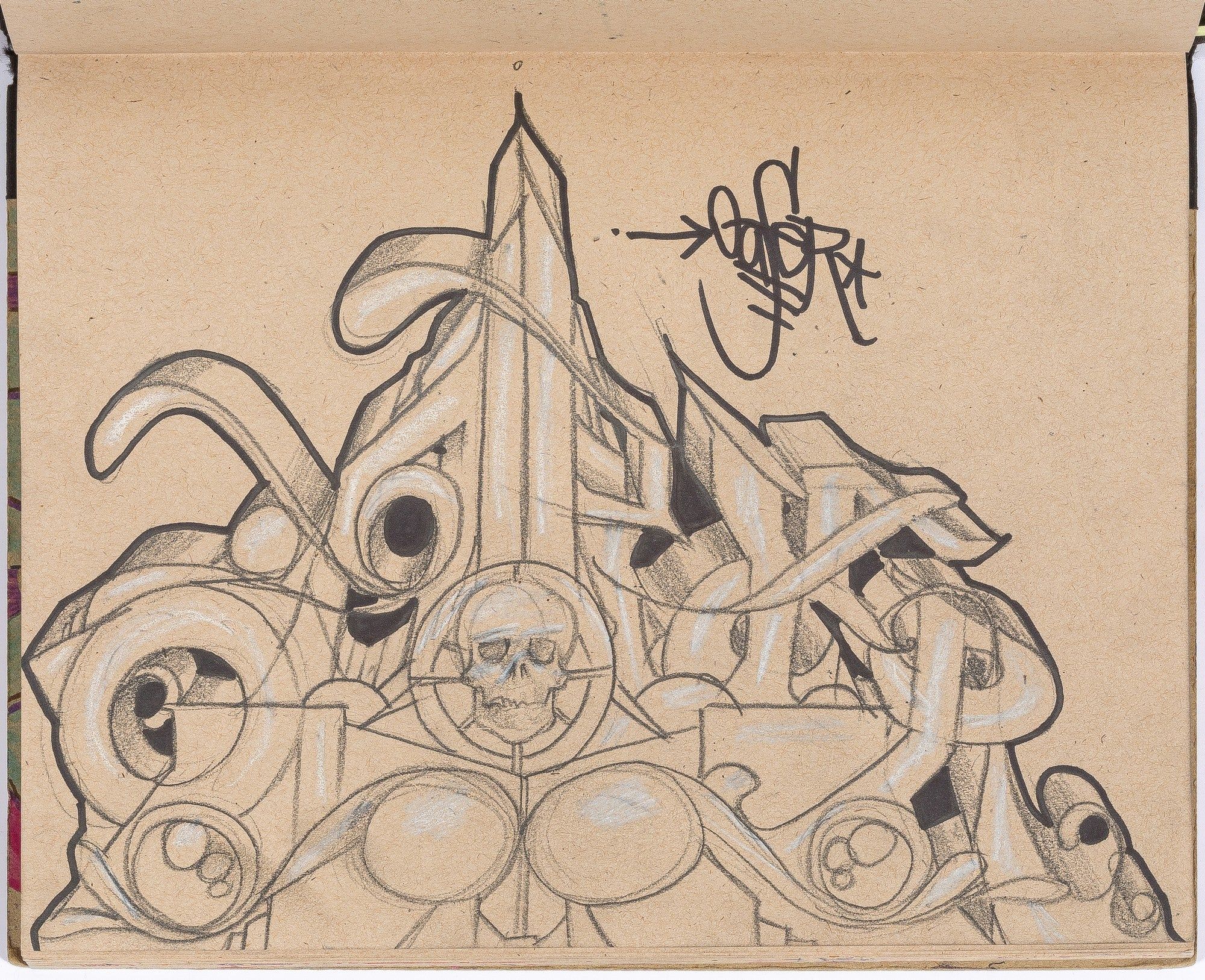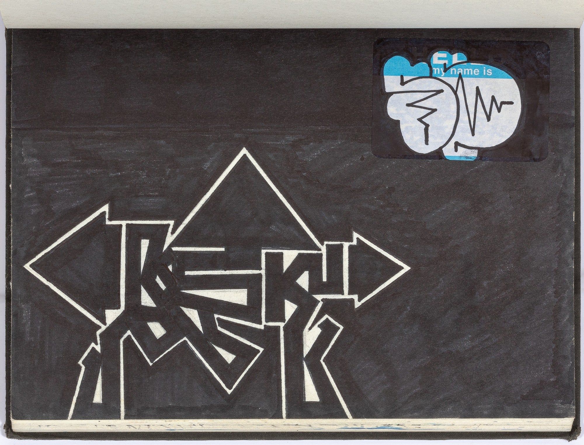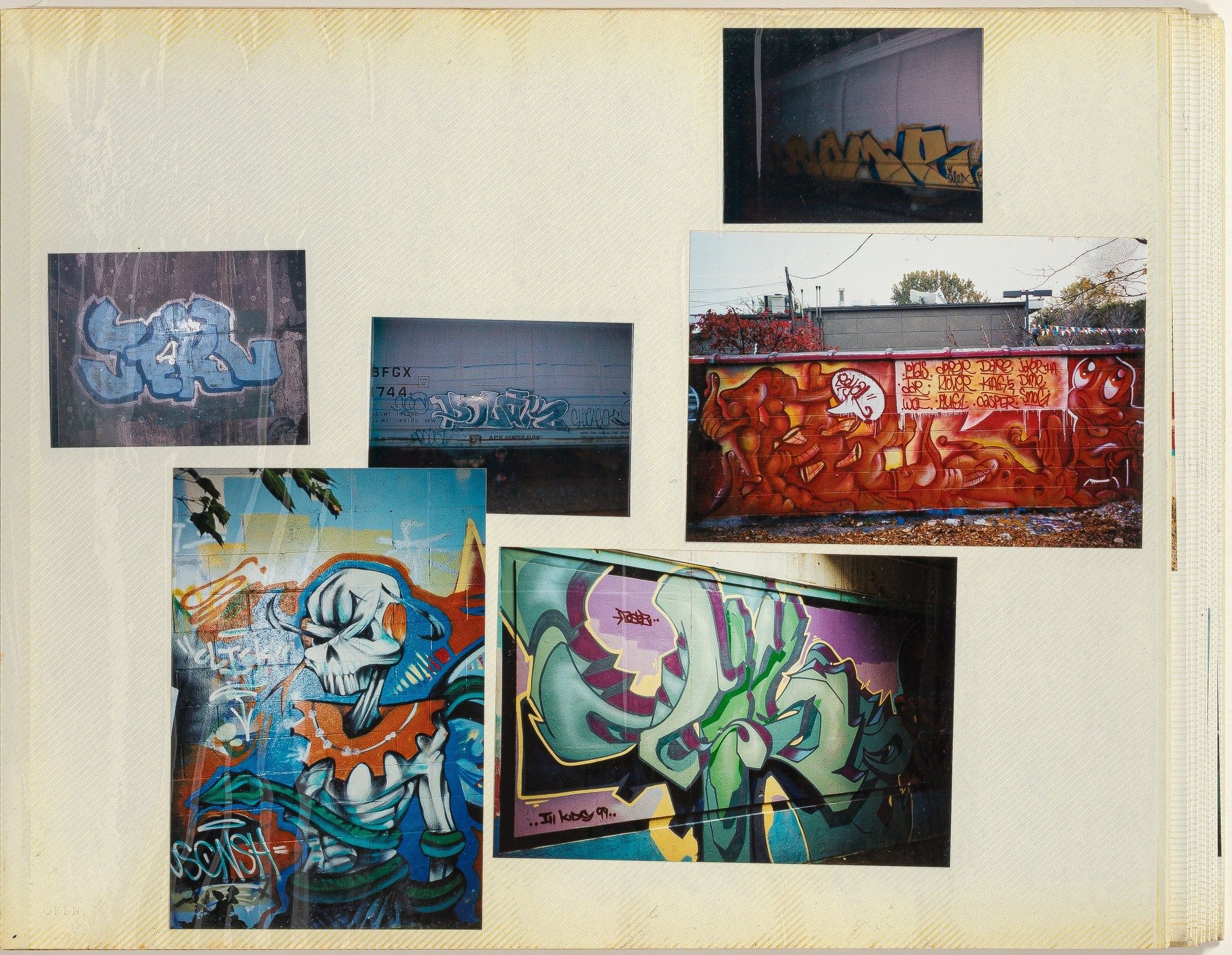 A group of four Black Books and accompanying photographs documenting the work of a Chicago area graffiti writer, who was active on the north side of Chicago between 2001-2007. The books include a range of images, styles and studies, from simple tags to increasingly larger and more elaborate examples. They vary from rough sketches to highly detailed finish drawings, mostly in pencil or ink, but a number in magic marker or paint pens. Three books are largely dedicated to perfecting existing tags, designing new versions, or incorporating additional element, such as figures, faces or highly stylizes backgrounds. One book appears to have doubled as a notebook for an art class, that shows more of a focus on figurative drawings. A number of pages are devoted to faces, hands, body poses, and shading of increasing sophistication, with some clearly resembling tattoo styles. In addition to the artist's own work, there is a smattering of art by fellow graffiti writers. In one image he incorporates a list of his crew into the design.