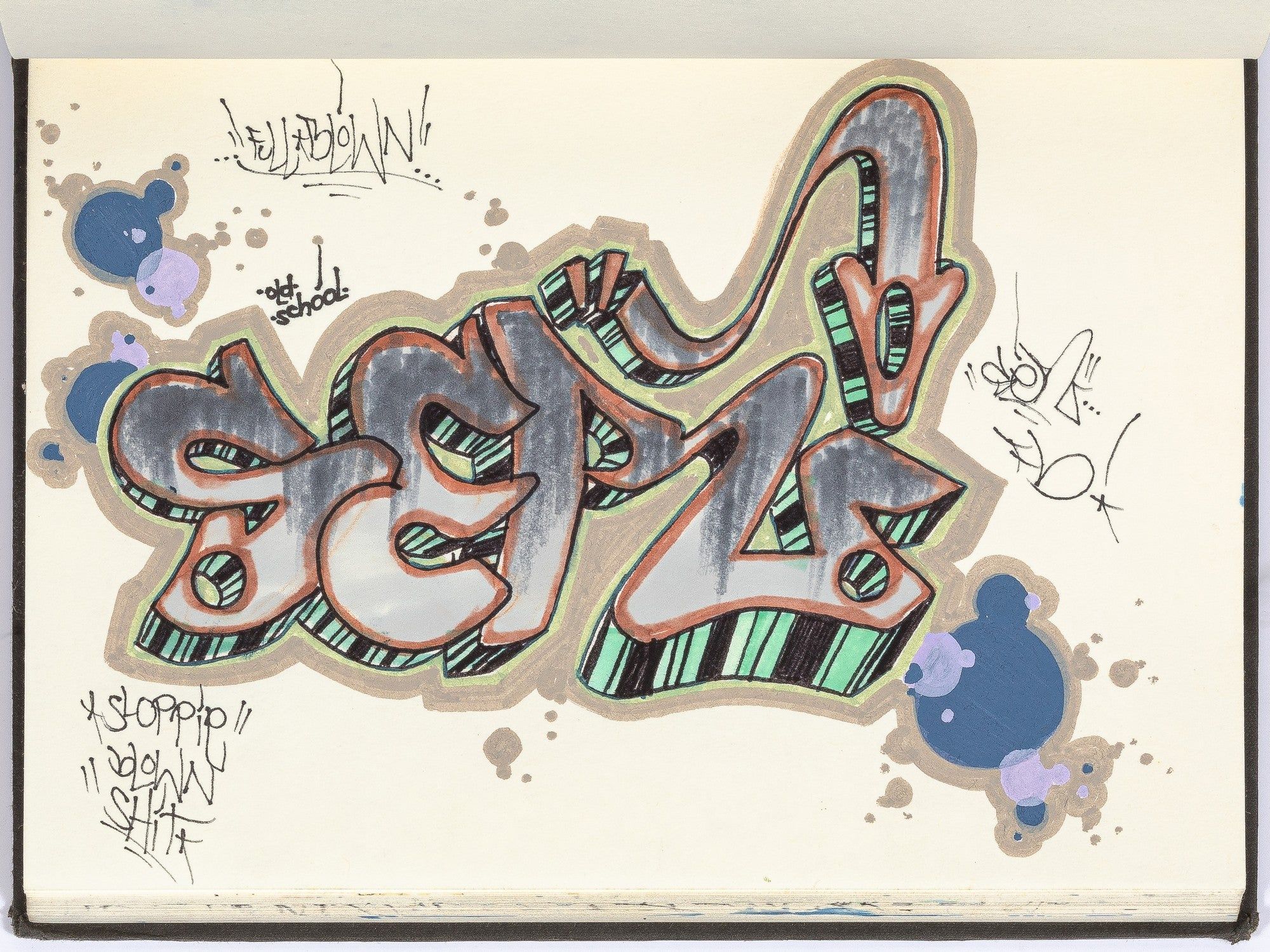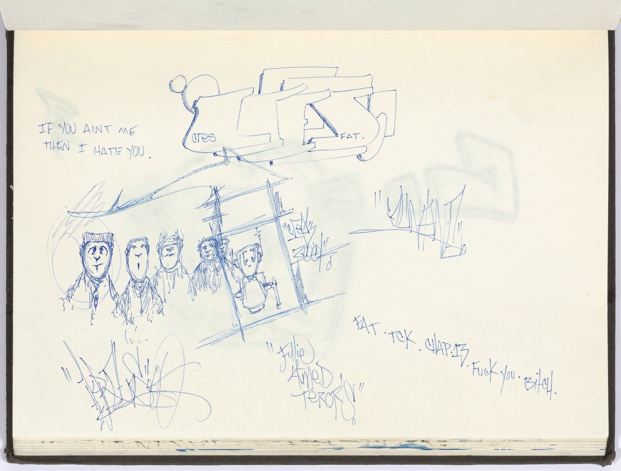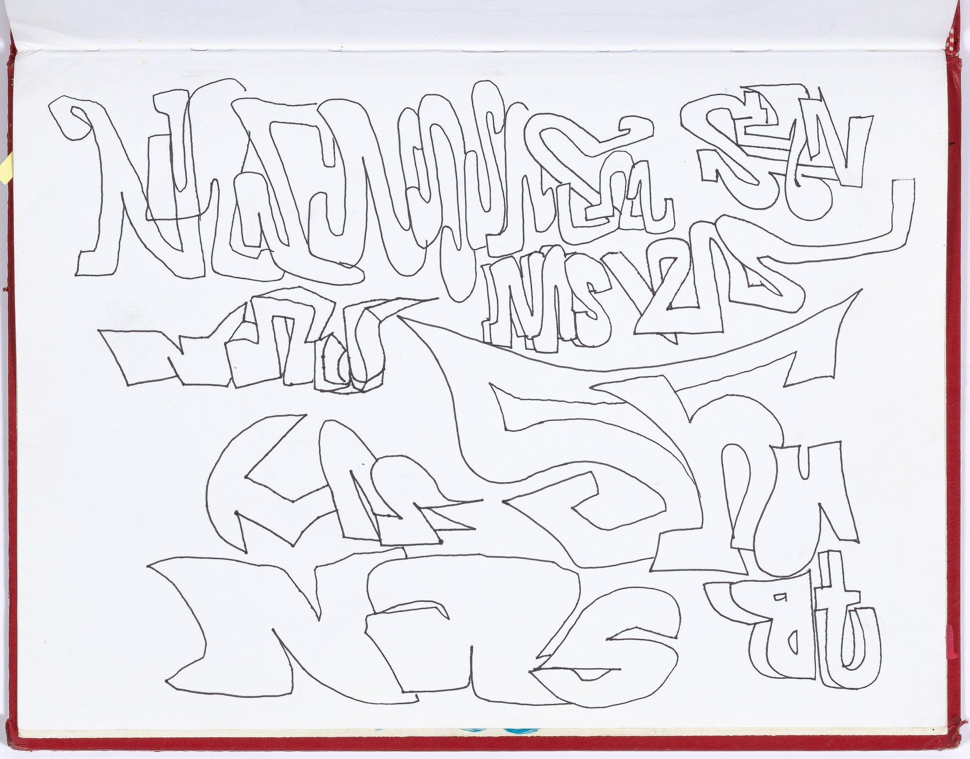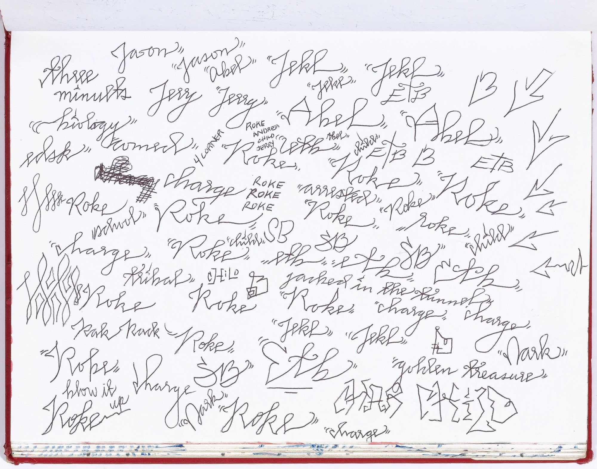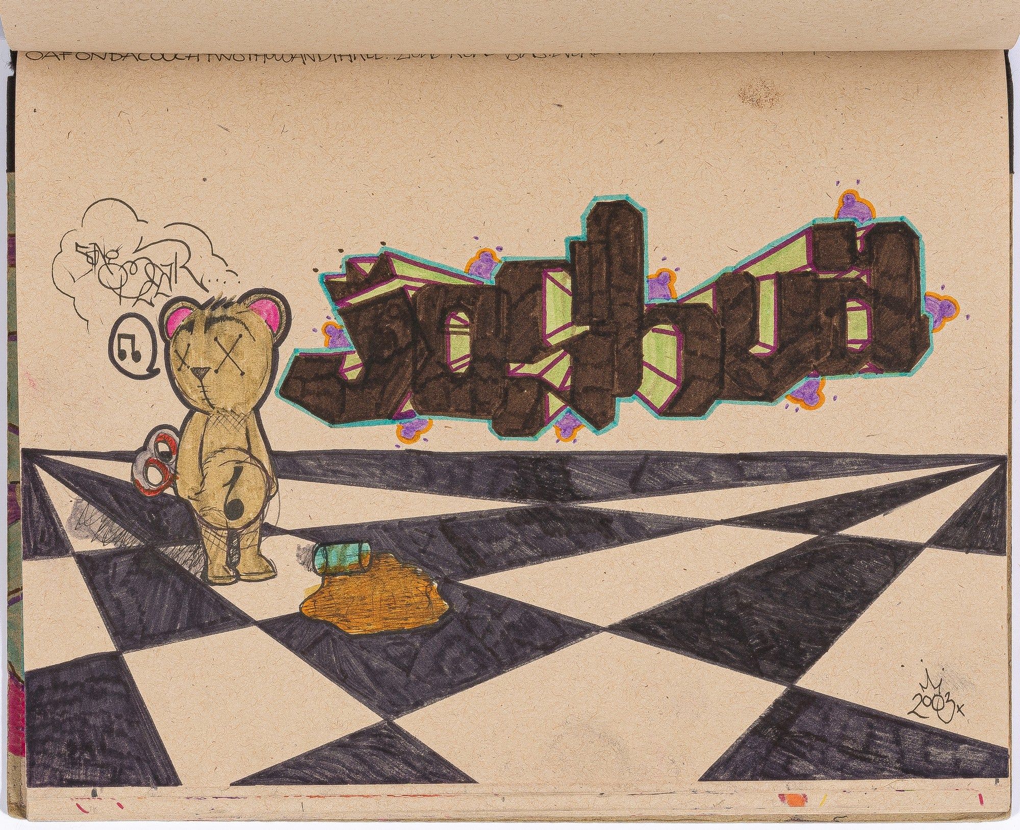A group of four Black Books and accompanying photographs documenting the work of a Chicago area graffiti writer, who was active on the north side of Chicago between 2001-2007. The books include a range of images, styles and studies, from simple tags to increasingly larger and more elaborate examples. They vary from rough sketches to highly detailed finish drawings, mostly in pencil or ink, but a number in magic marker or paint pens. Three books are largely dedicated to perfecting existing tags, designing new versions, or incorporating additional element, such as figures, faces or highly stylizes backgrounds. One book appears to have doubled as a notebook for an art class, that shows more of a focus on figurative drawings. A number of pages are devoted to faces, hands, body poses, and shading of increasing sophistication, with some clearly resembling tattoo styles. In addition to the artist's own work, there is a smattering of art by fellow graffiti writers. In one image he incorporates a list of his crew into the design.
