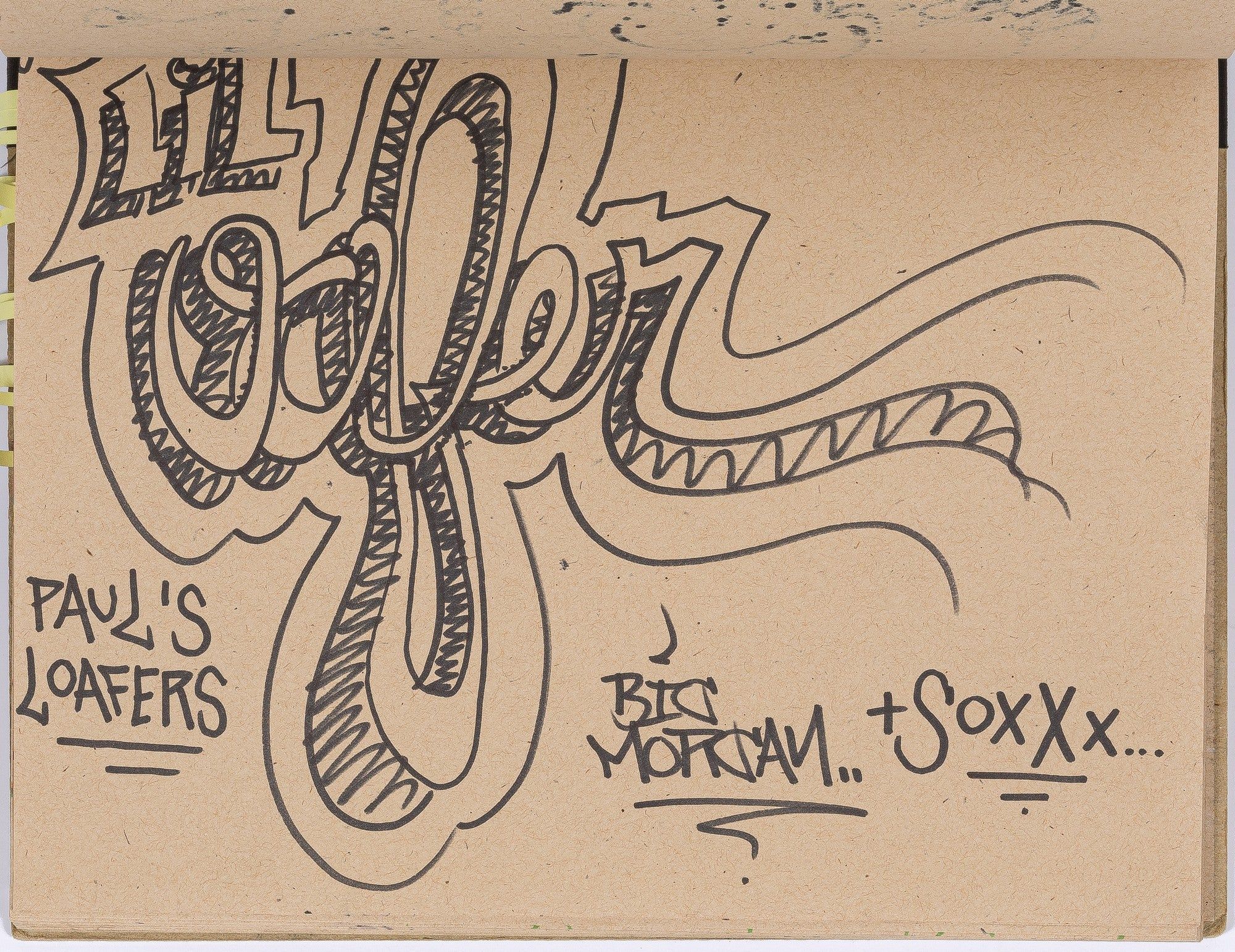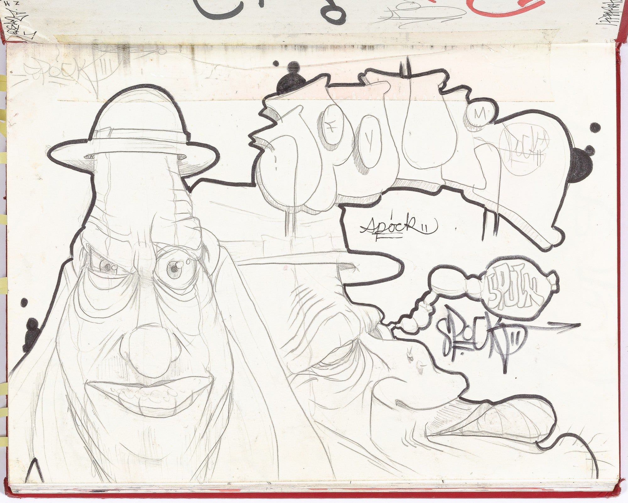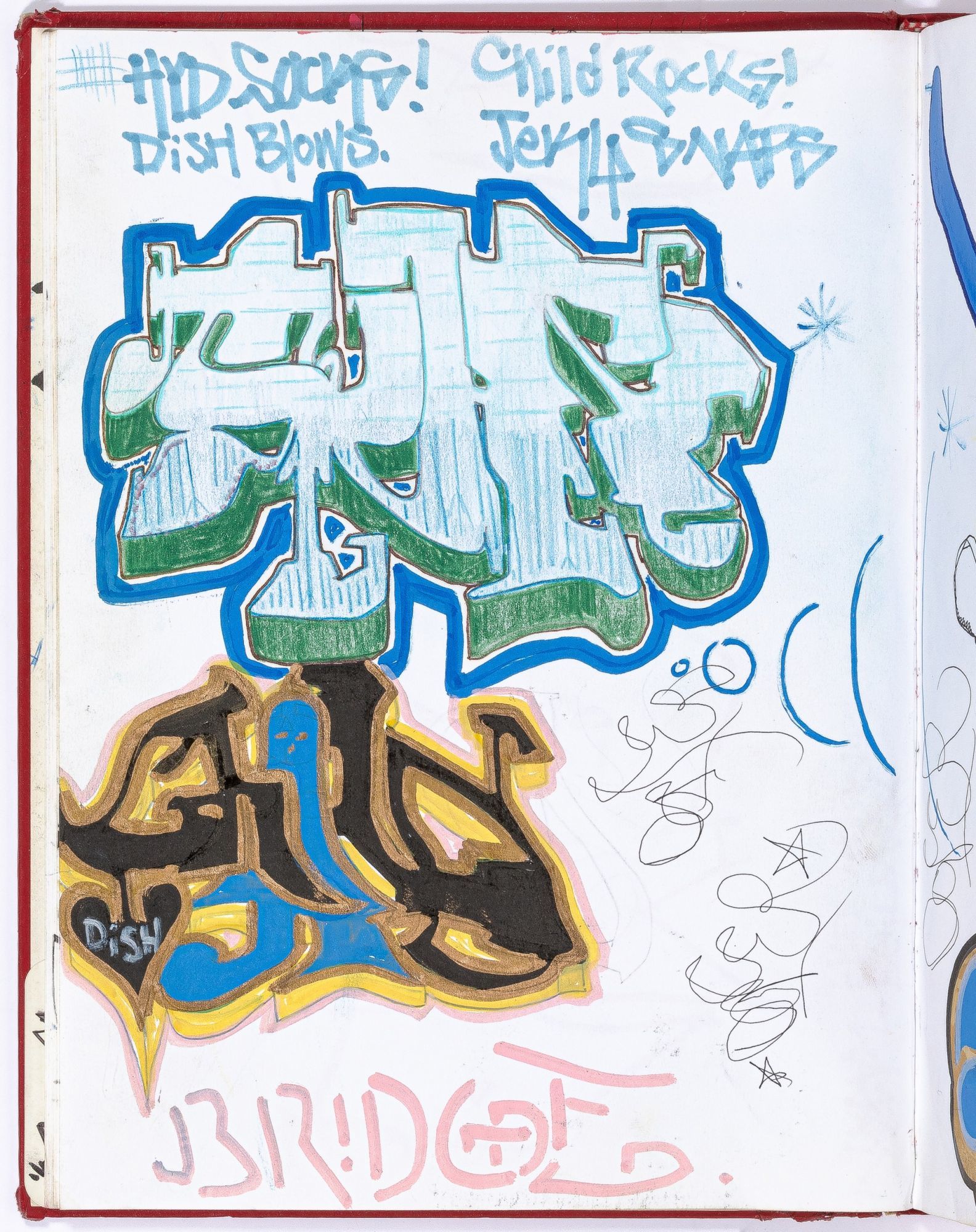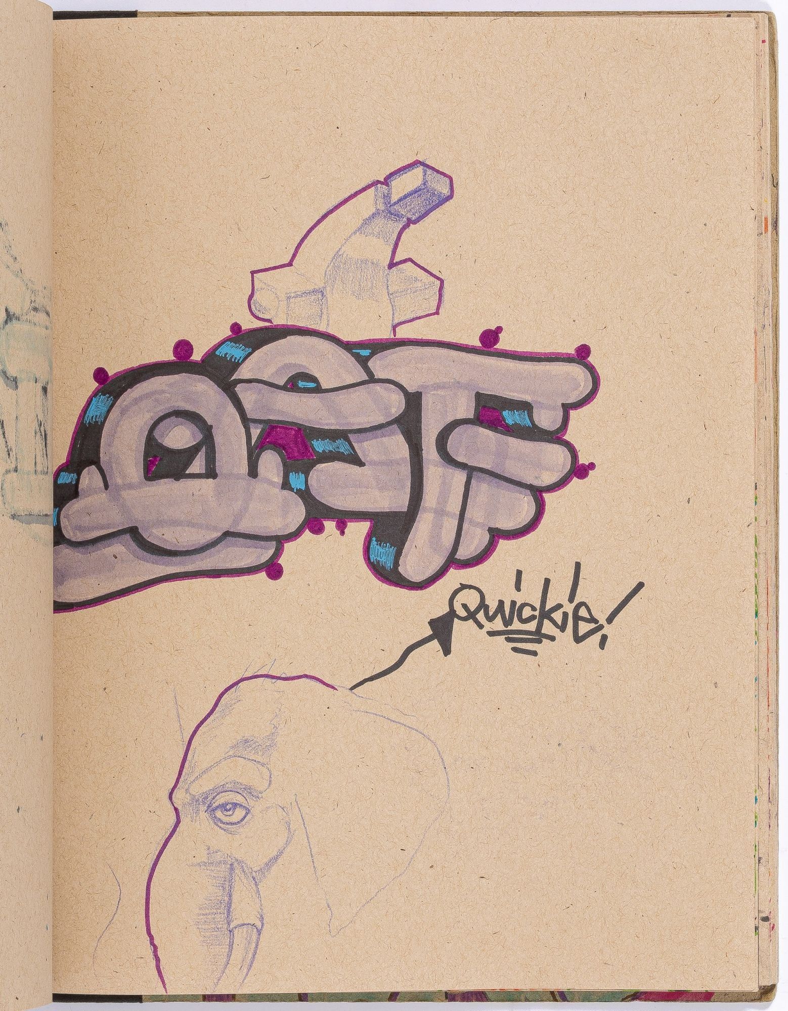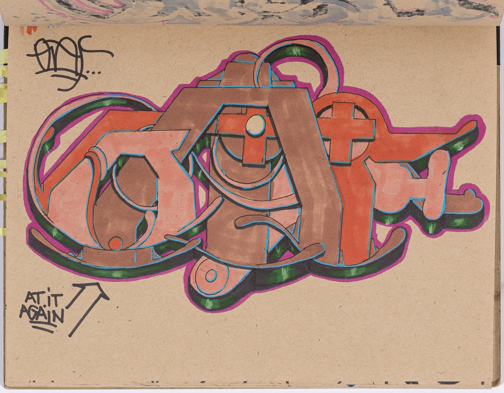 A group of four Black Books and accompanying photographs documenting the work of a Chicago area graffiti writer, who was active on the north side of Chicago between 2001-2007. The books include a range of images, styles and studies, from simple tags to increasingly larger and more elaborate examples. They vary from rough sketches to highly detailed finish drawings, mostly in pencil or ink, but a number in magic marker or paint pens. Three books are largely dedicated to perfecting existing tags, designing new versions, or incorporating additional element, such as figures, faces or highly stylizes backgrounds. One book appears to have doubled as a notebook for an art class, that shows more of a focus on figurative drawings. A number of pages are devoted to faces, hands, body poses, and shading of increasing sophistication, with some clearly resembling tattoo styles. In addition to the artist's own work, there is a smattering of art by fellow graffiti writers. In one image he incorporates a list of his crew into the design.