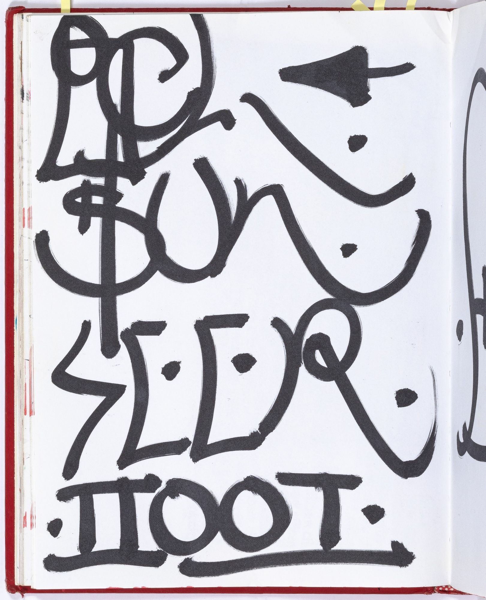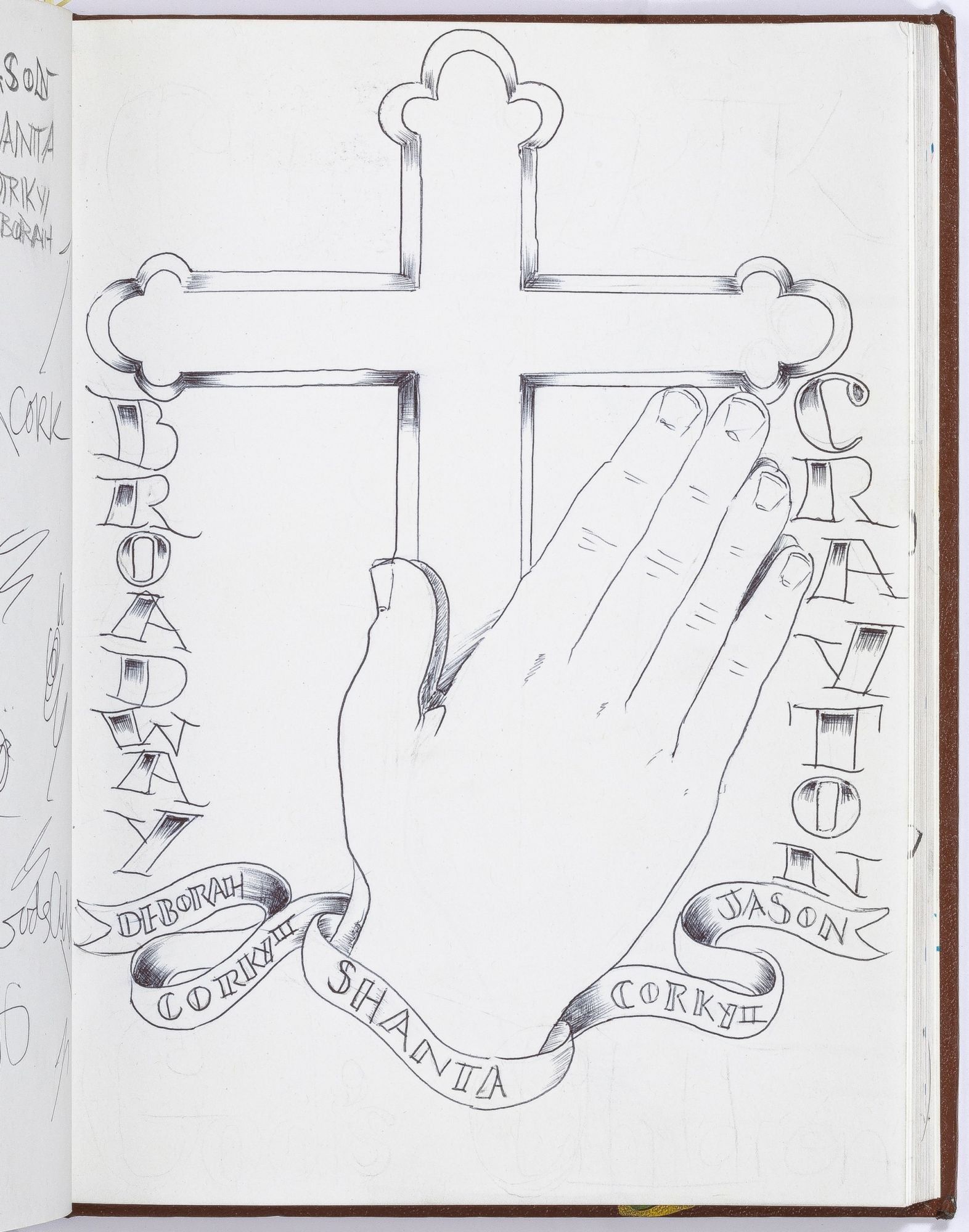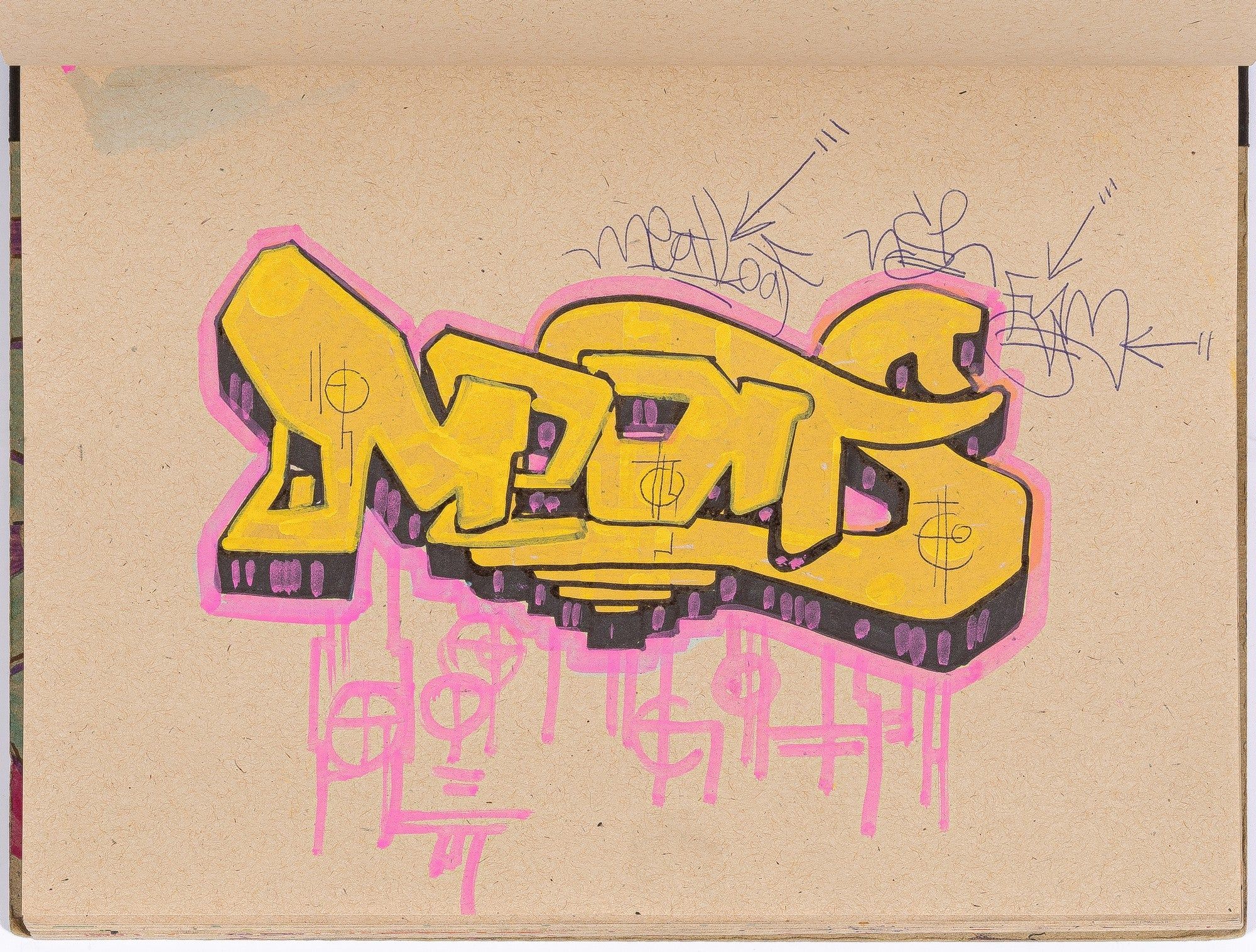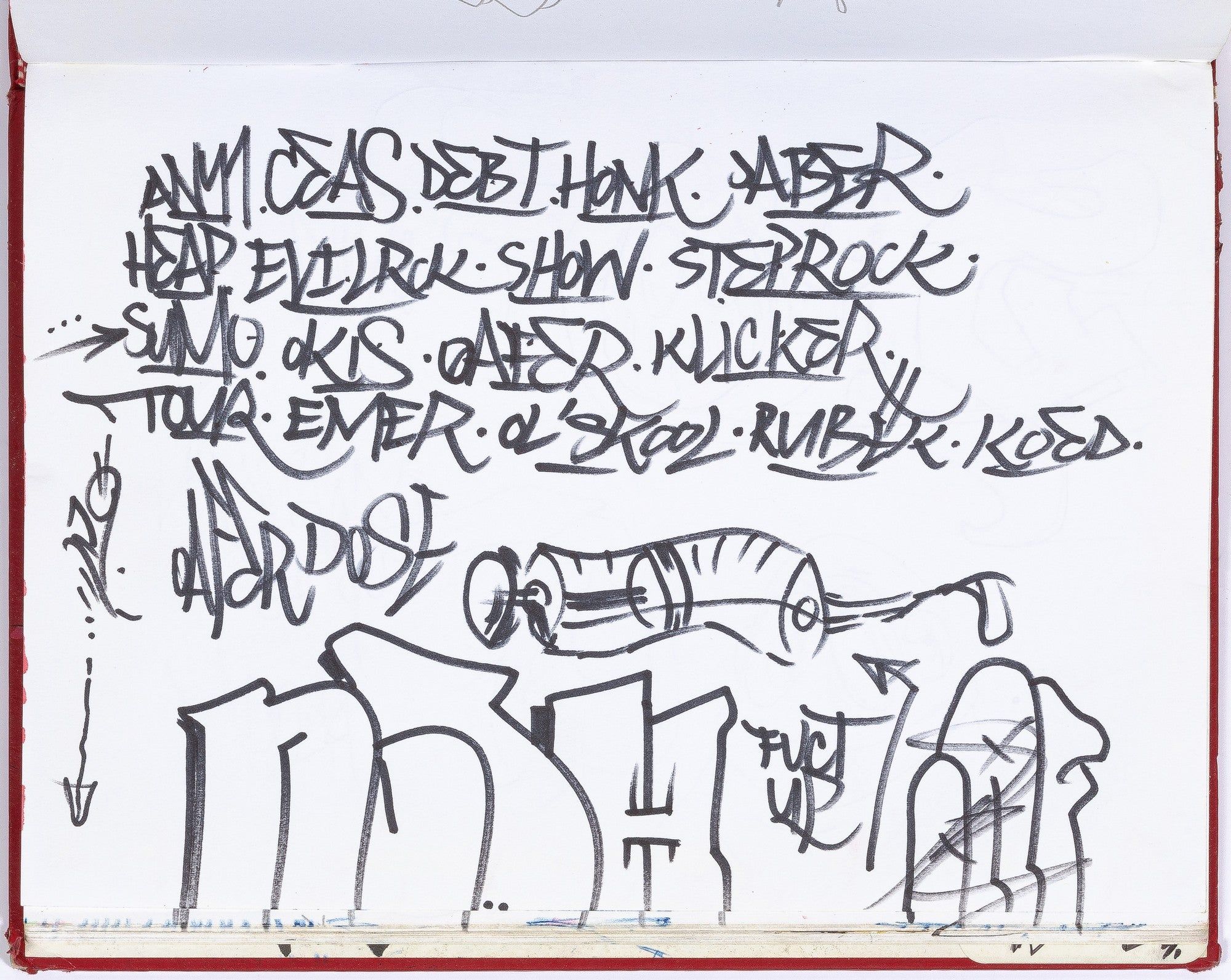A group of four Black Books and accompanying photographs documenting the work of a Chicago area graffiti writer, who was active on the north side of Chicago between 2001-2007. The books include a range of images, styles and studies, from simple tags to increasingly larger and more elaborate examples. They vary from rough sketches to highly detailed finish drawings, mostly in pencil or ink, but a number in magic marker or paint pens. Three books are largely dedicated to perfecting existing tags, designing new versions, or incorporating additional element, such as figures, faces or highly stylizes backgrounds. One book appears to have doubled as a notebook for an art class, that shows more of a focus on figurative drawings. A number of pages are devoted to faces, hands, body poses, and shading of increasing sophistication, with some clearly resembling tattoo styles. In addition to the artist's own work, there is a smattering of art by fellow graffiti writers. In one image he incorporates a list of his crew into the design.