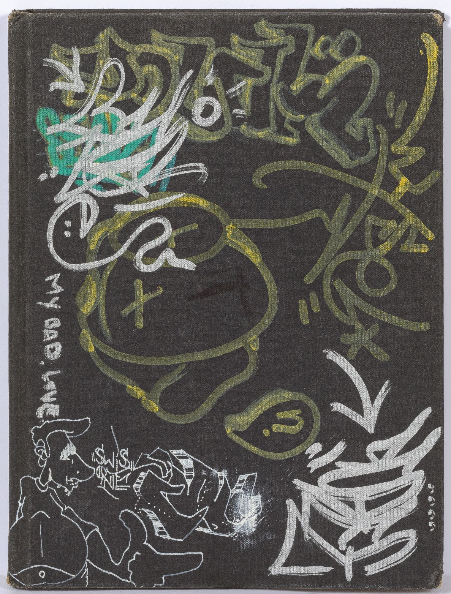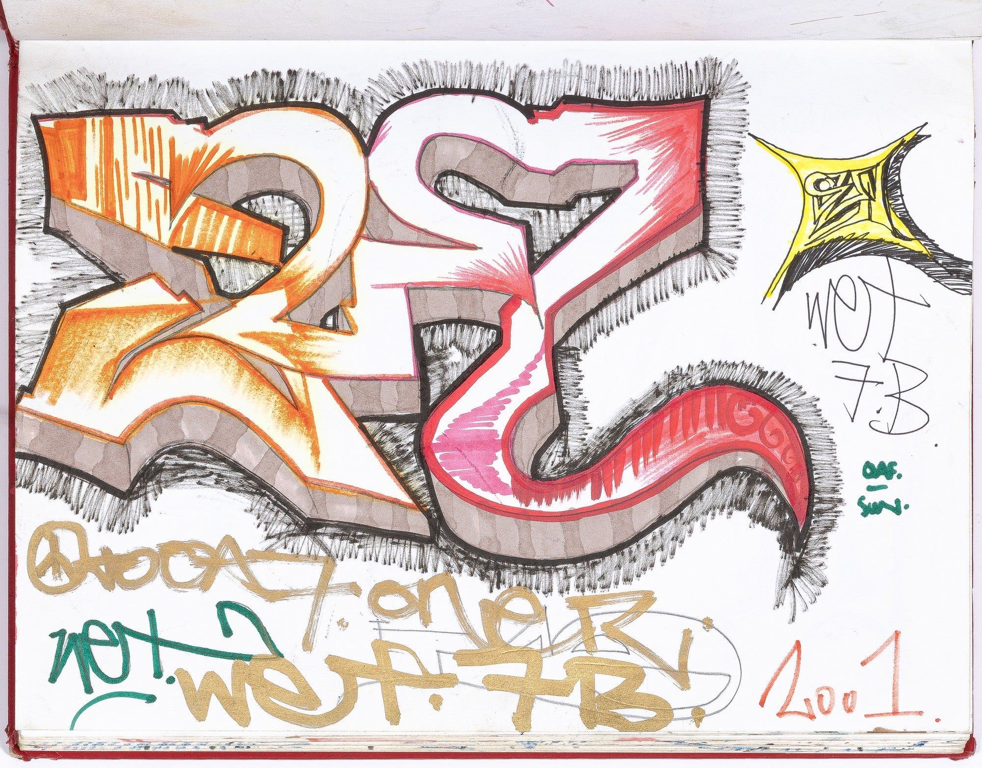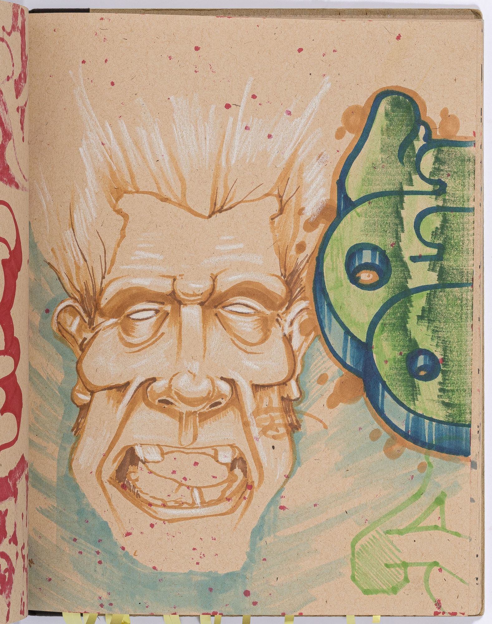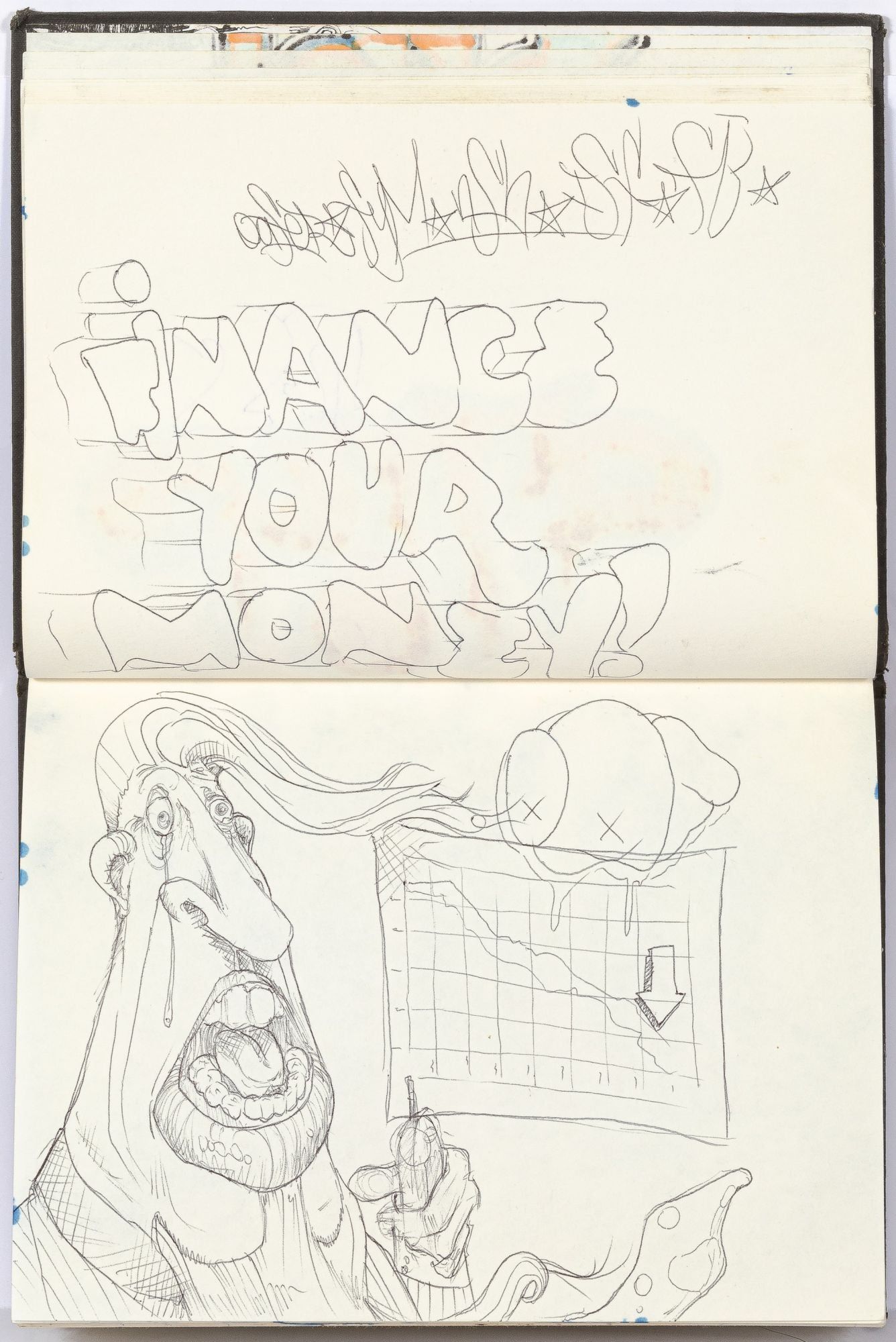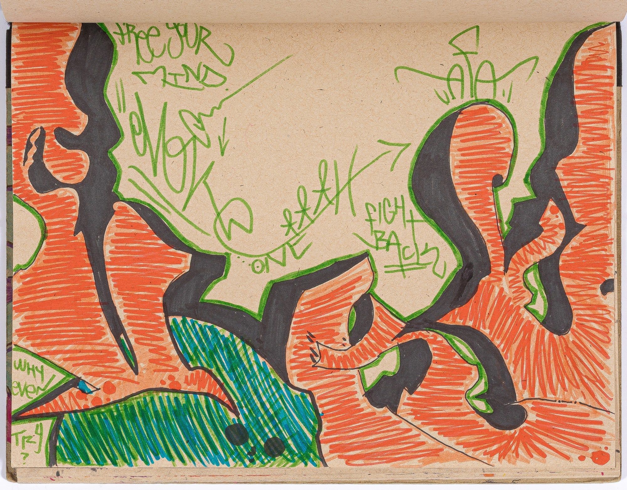 A group of four Black Books and accompanying photographs documenting the work of a Chicago area graffiti writer, who was active on the north side of Chicago between 2001-2007. The books include a range of images, styles and studies, from simple tags to increasingly larger and more elaborate examples. They vary from rough sketches to highly detailed finish drawings, mostly in pencil or ink, but a number in magic marker or paint pens. Three books are largely dedicated to perfecting existing tags, designing new versions, or incorporating additional element, such as figures, faces or highly stylizes backgrounds. One book appears to have doubled as a notebook for an art class, that shows more of a focus on figurative drawings. A number of pages are devoted to faces, hands, body poses, and shading of increasing sophistication, with some clearly resembling tattoo styles. In addition to the artist's own work, there is a smattering of art by fellow graffiti writers. In one image he incorporates a list of his crew into the design.