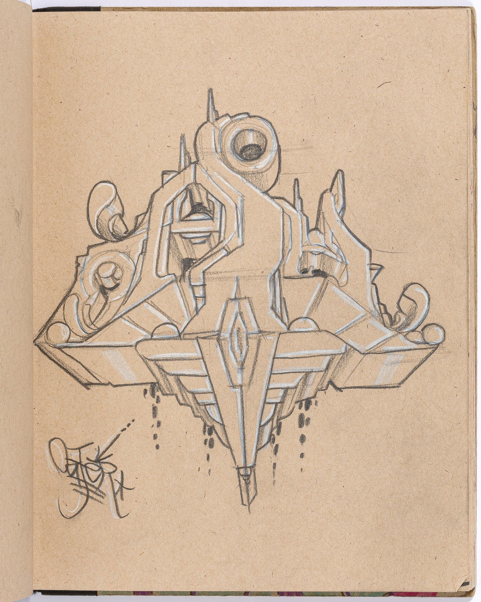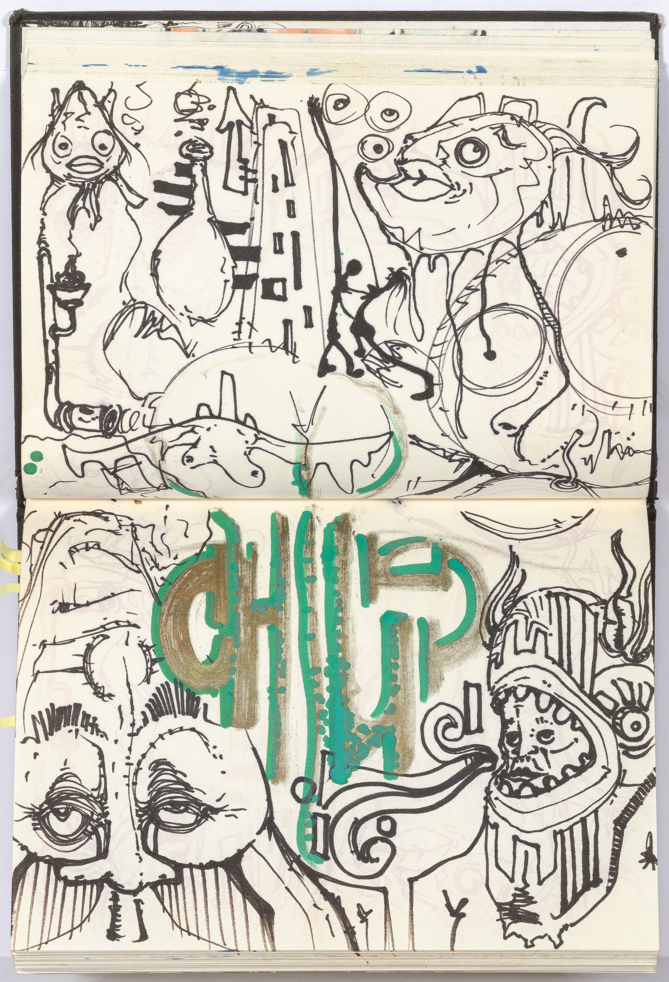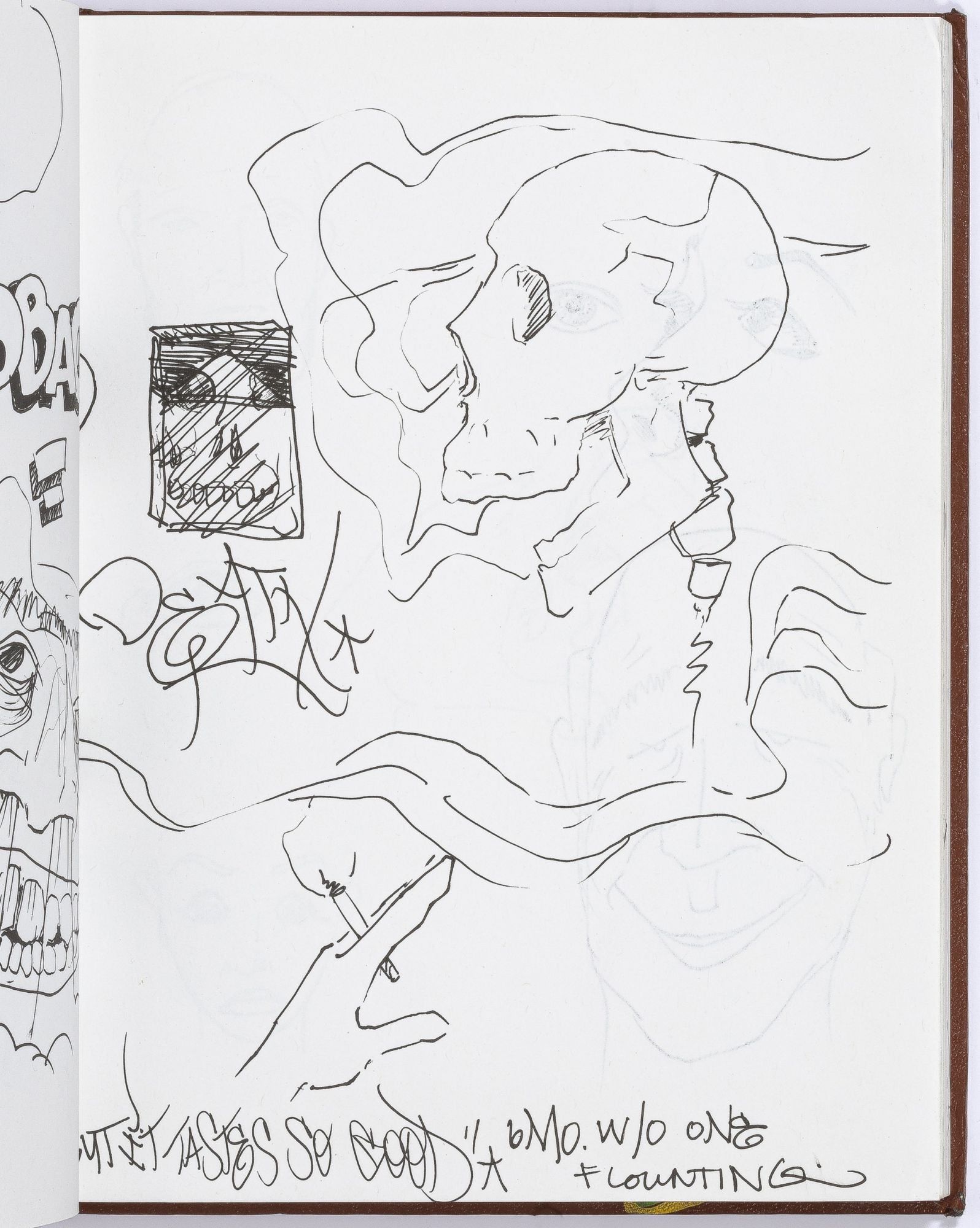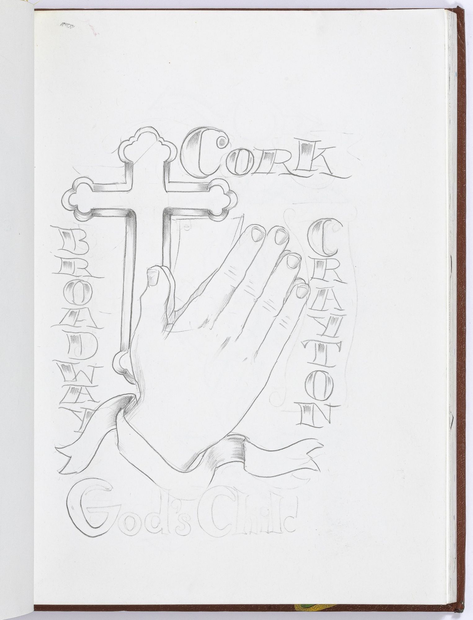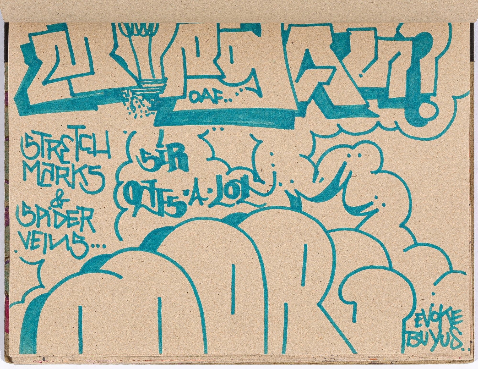 A group of four Black Books and accompanying photographs documenting the work of a Chicago area graffiti writer, who was active on the north side of Chicago between 2001-2007. The books include a range of images, styles and studies, from simple tags to increasingly larger and more elaborate examples. They vary from rough sketches to highly detailed finish drawings, mostly in pencil or ink, but a number in magic marker or paint pens. Three books are largely dedicated to perfecting existing tags, designing new versions, or incorporating additional element, such as figures, faces or highly stylizes backgrounds. One book appears to have doubled as a notebook for an art class, that shows more of a focus on figurative drawings. A number of pages are devoted to faces, hands, body poses, and shading of increasing sophistication, with some clearly resembling tattoo styles. In addition to the artist's own work, there is a smattering of art by fellow graffiti writers. In one image he incorporates a list of his crew into the design.