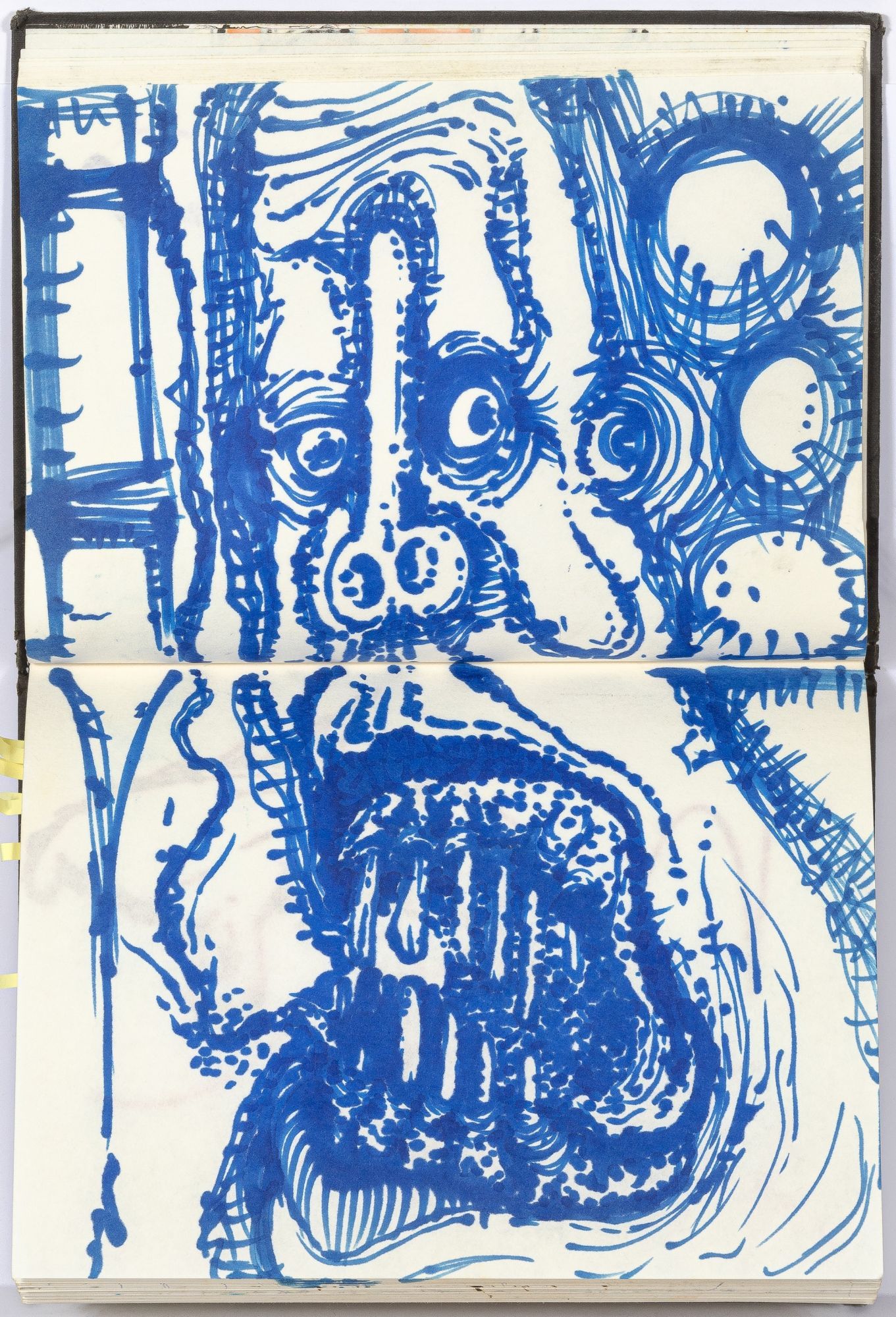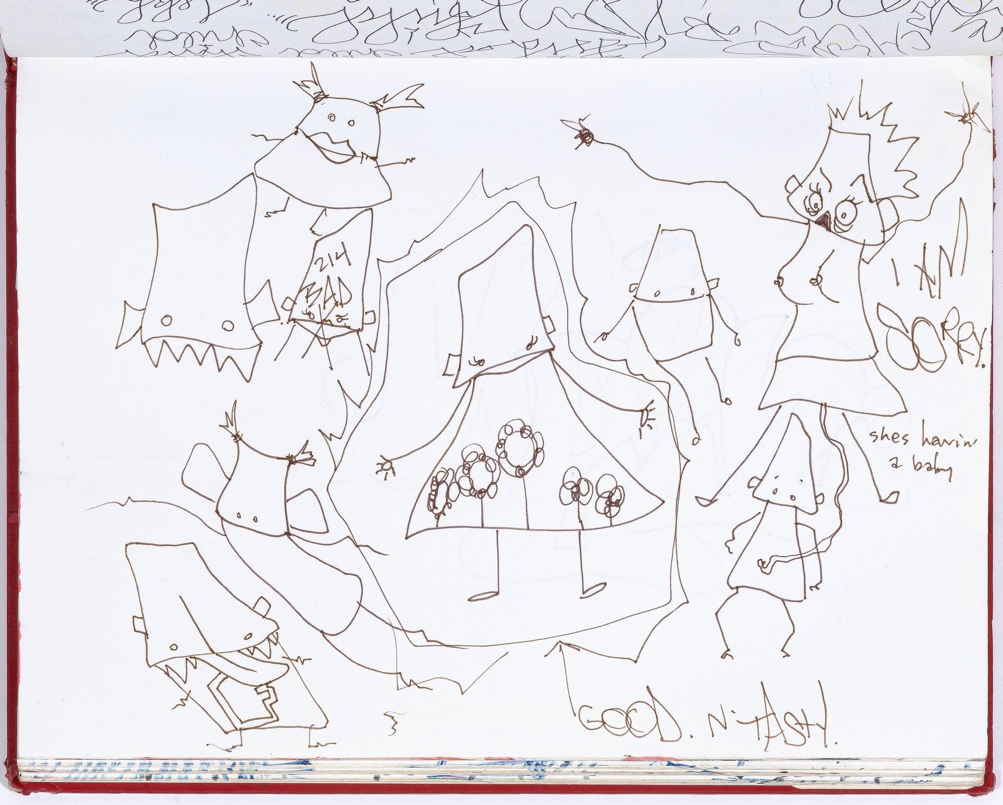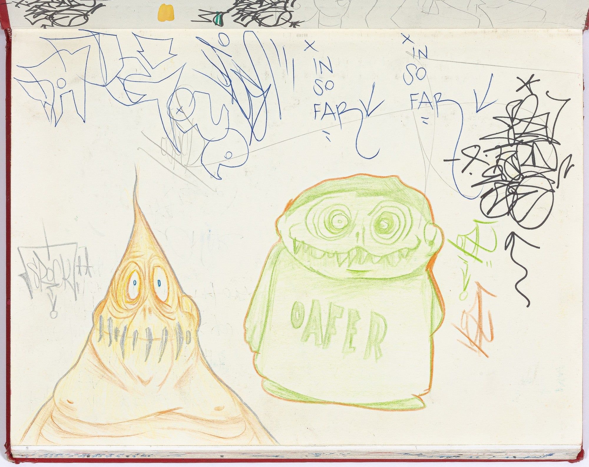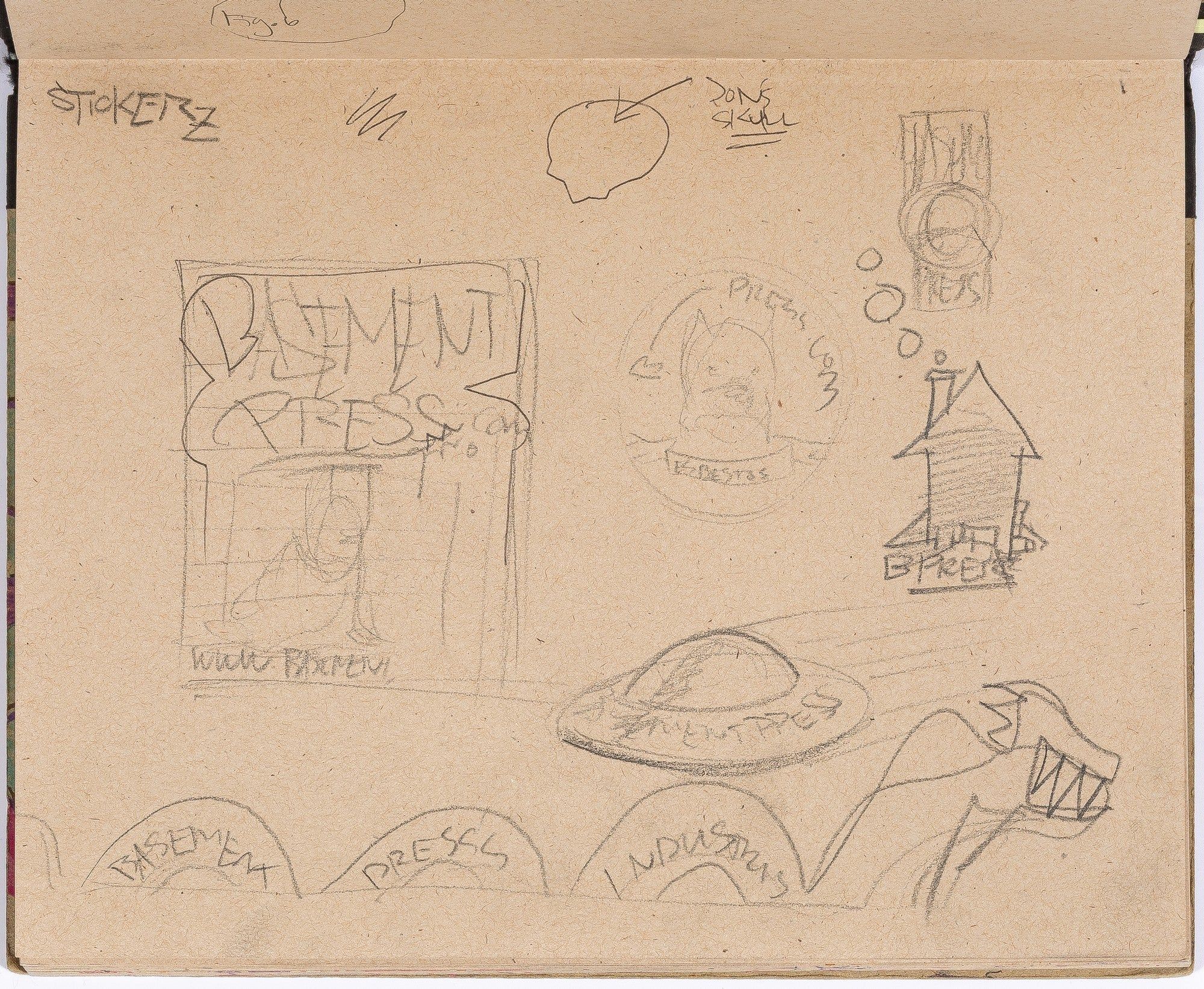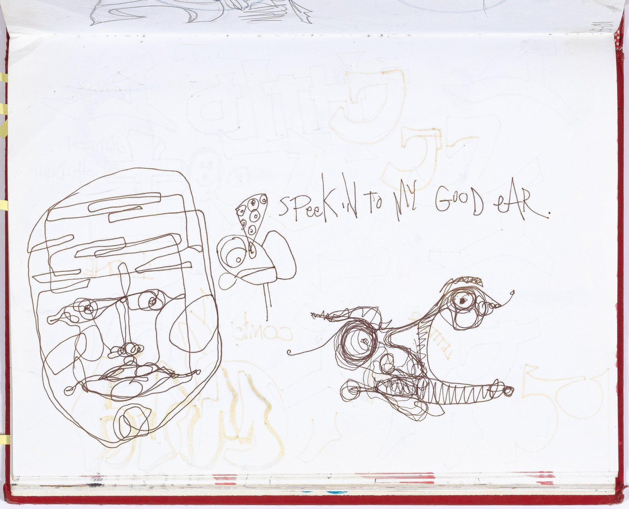 A group of four Black Books and accompanying photographs documenting the work of a Chicago area graffiti writer, who was active on the north side of Chicago between 2001-2007. The books include a range of images, styles and studies, from simple tags to increasingly larger and more elaborate examples. They vary from rough sketches to highly detailed finish drawings, mostly in pencil or ink, but a number in magic marker or paint pens. Three books are largely dedicated to perfecting existing tags, designing new versions, or incorporating additional element, such as figures, faces or highly stylizes backgrounds. One book appears to have doubled as a notebook for an art class, that shows more of a focus on figurative drawings. A number of pages are devoted to faces, hands, body poses, and shading of increasing sophistication, with some clearly resembling tattoo styles. In addition to the artist's own work, there is a smattering of art by fellow graffiti writers. In one image he incorporates a list of his crew into the design.