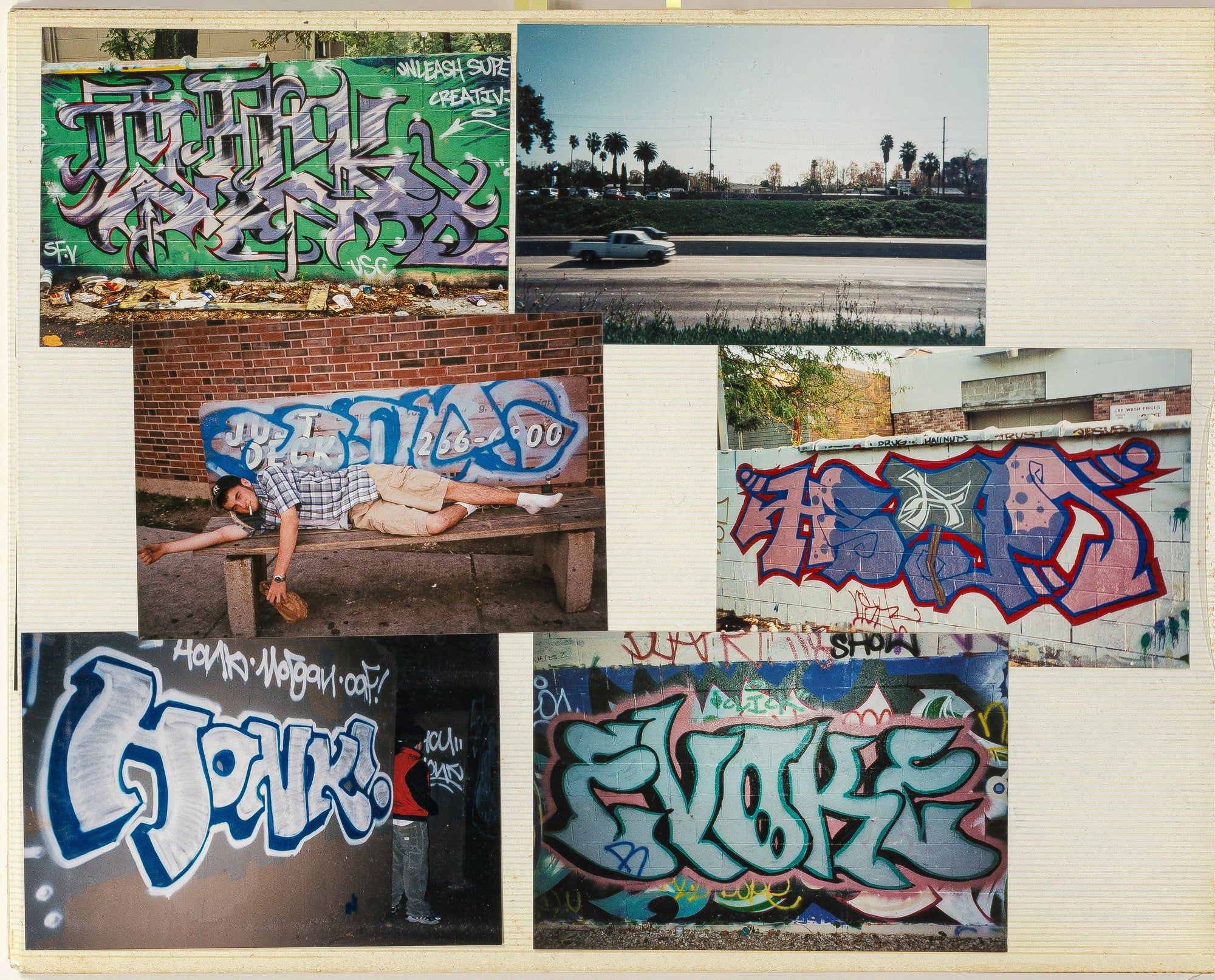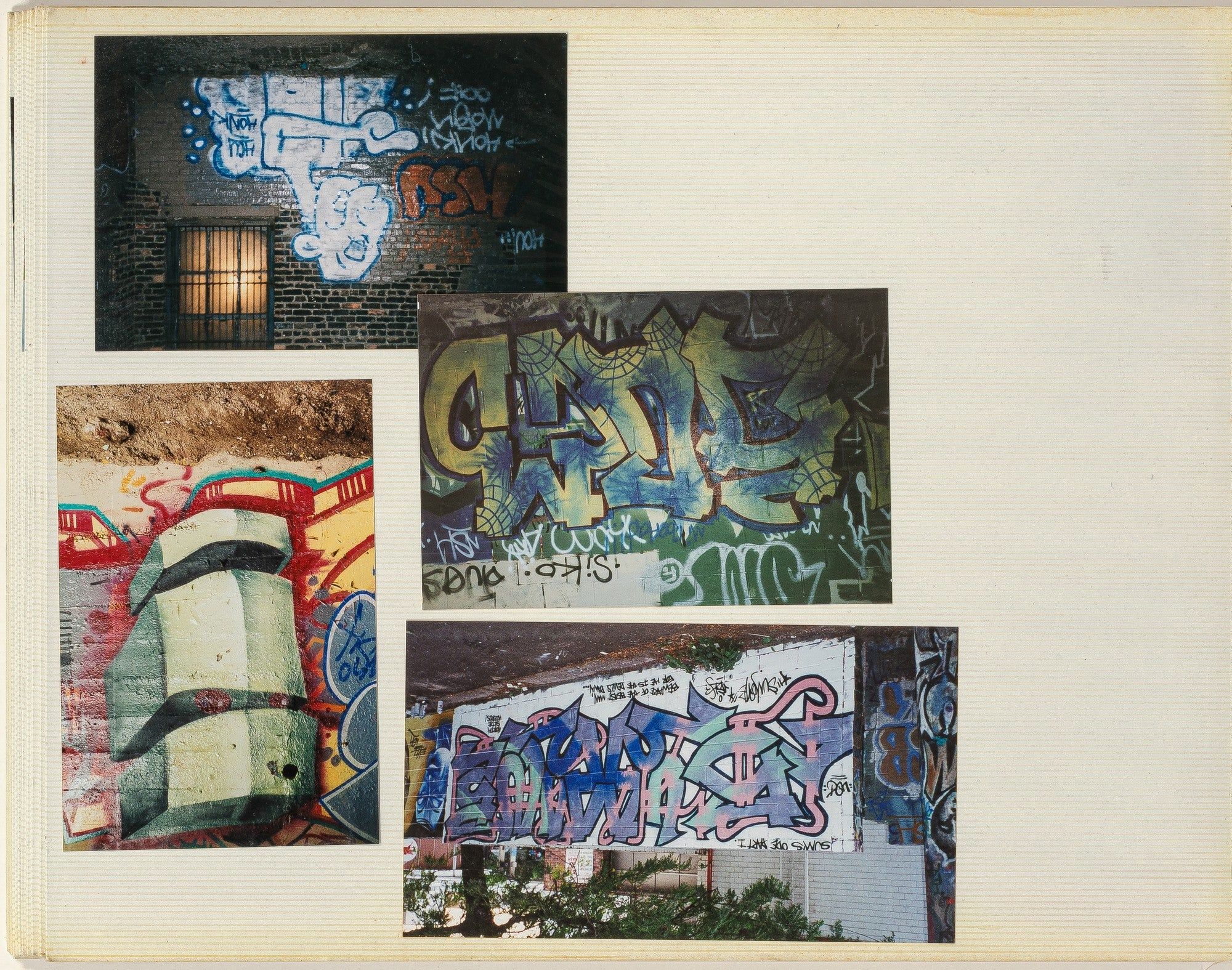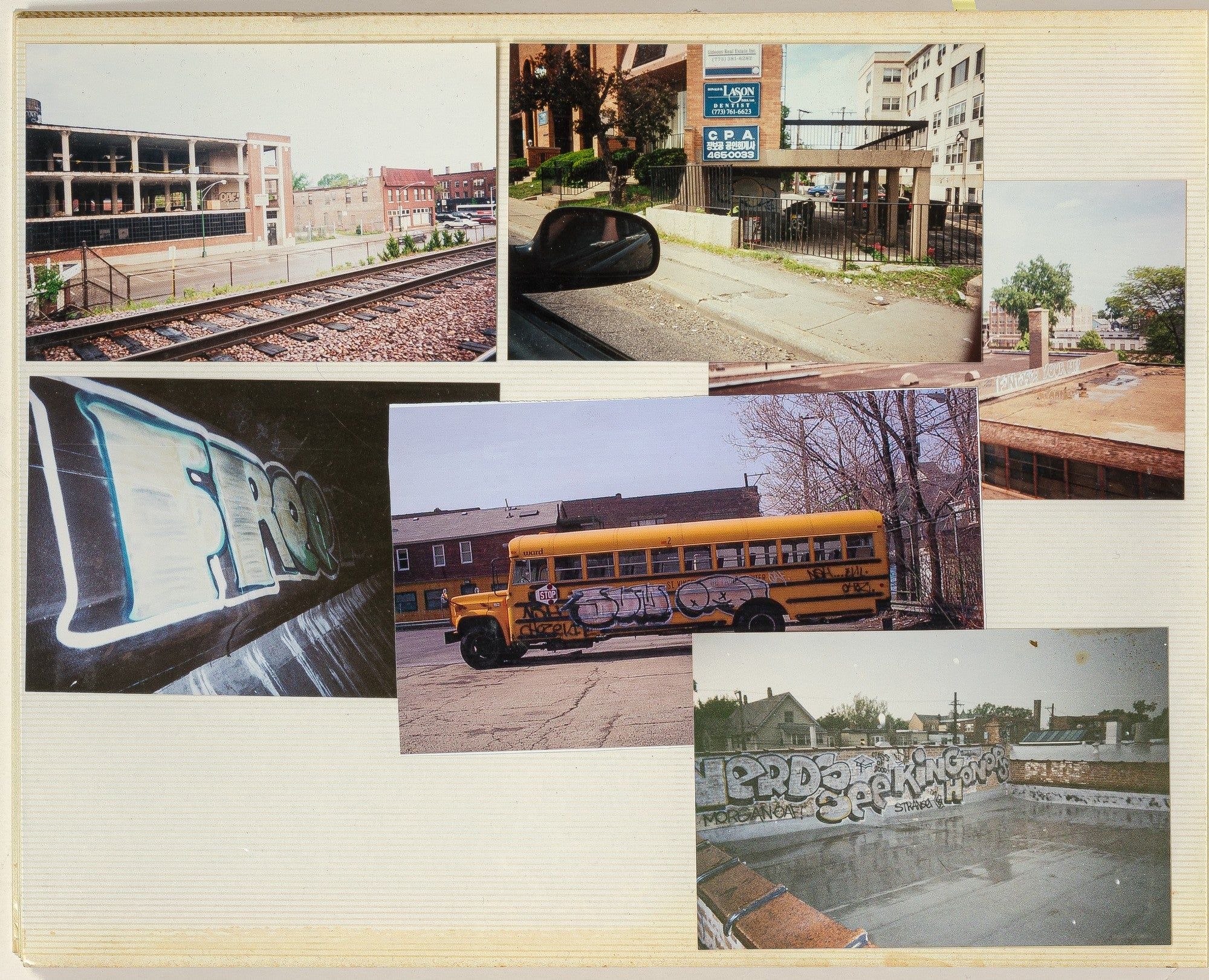 The accompanying photograph document the writers work throughout Chicago, mostly on the north side, as well as a side trip to St. Louis with the Arch clearly visible in the background of a number of images. The work captured in the photos range from small basic tags on roofs, garages, trains, and billboards, to much larger pieces beneath overpasses and long stretches of walls at train yards and industrial complexes. Later images show multiple artists at work, including the use of scaffolding, suggesting their efforts may have been part of an organized concern, possibly a city arts project or mural programs.